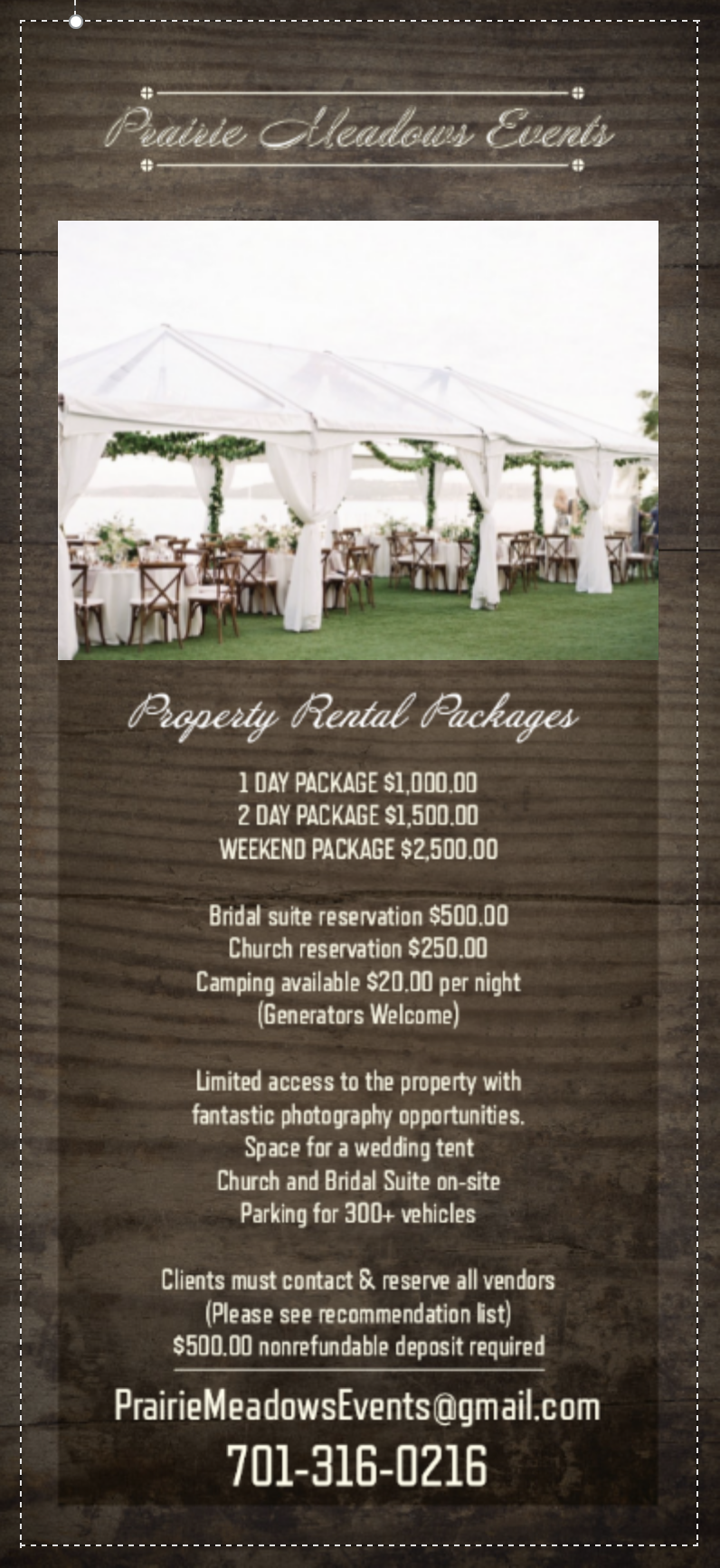 Located in Dawson, ND, Prairie Meadows Events is a family-owned barn and farm venue that hosts weddings and other important occasions. This secluded property can make a marvelous backdrop for your special day. The management of this private retreat invites you to this setting to host a truly remarkable wedding celebration. Prairie Meadows Events is located only a 40-minute drive from Bismarck, ND. The spacious fields on the premises can readily host a sizeable event tent along with an outdoor dance floor and other amenities for your celebration. If you would prefer to exchange your vows indoors, the on-site chapel can provide an intimate and welcoming space for you to hold your ceremony. Over 300 guests may share in the joy of your magical day. Camping facilities spanning 15 acres are available for more than 40 tents, offering ample accommodation for your overnight stay!