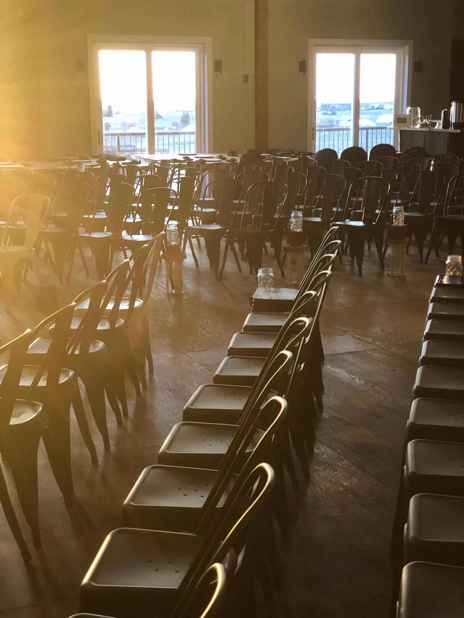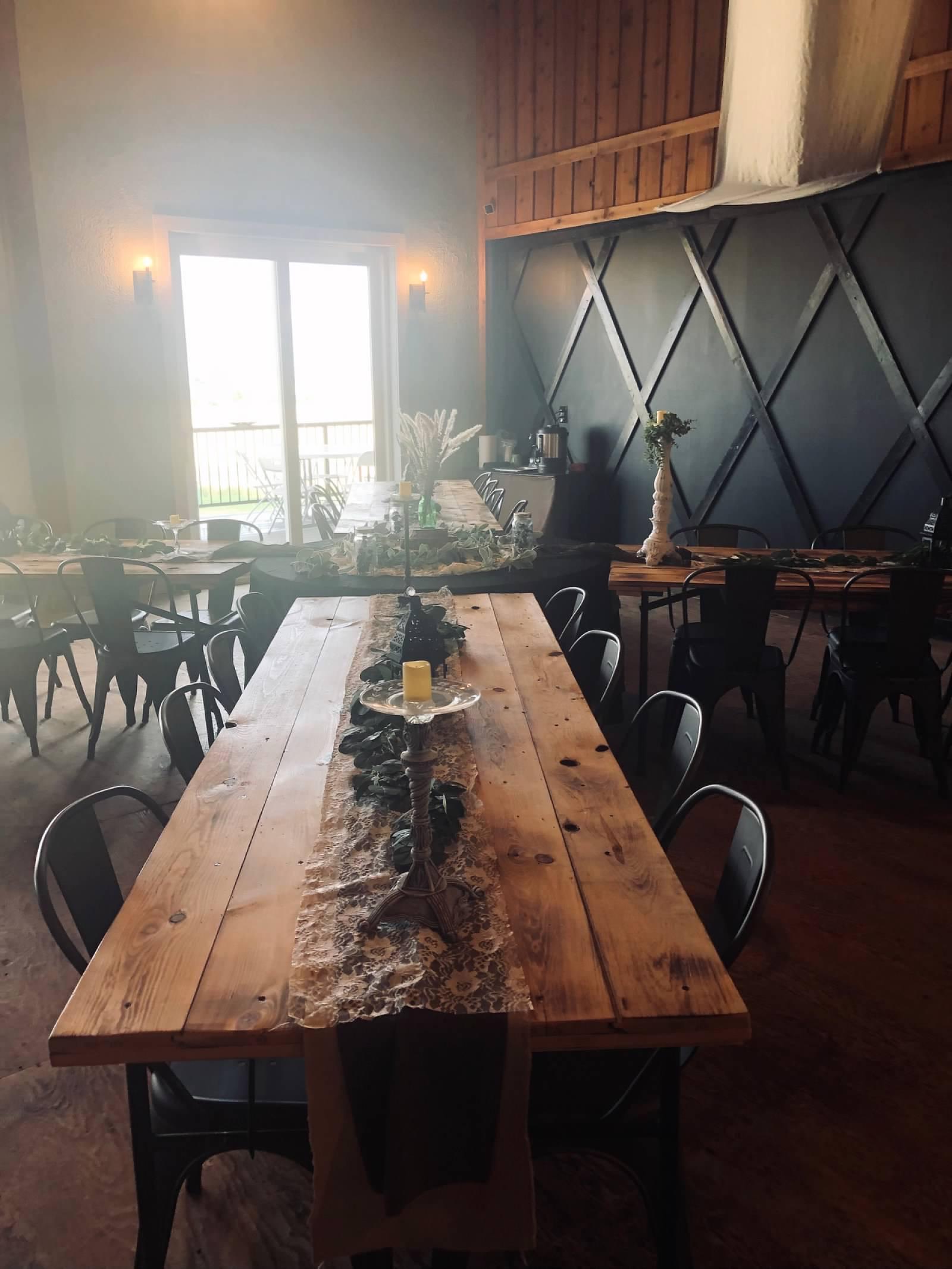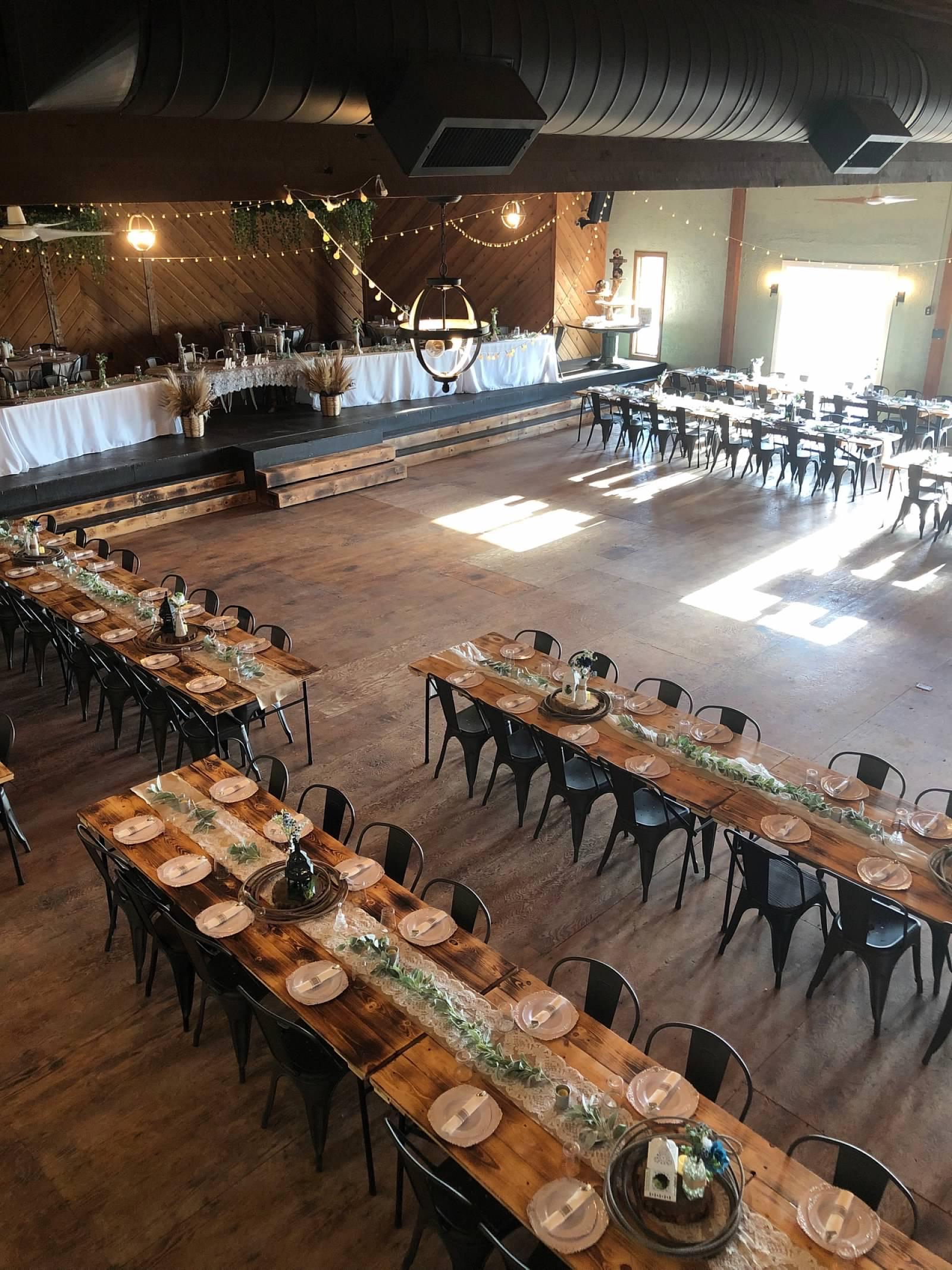 This space boasts 3000 square feet and high ceilings. Glass doors overlooking a big deck out looking on the prairie. Our 12’ rustic bar fully stocked with liquor, beer, wine & of course champagne! Finally a 50’ stage for your live band or head table! Let the festivities begin.