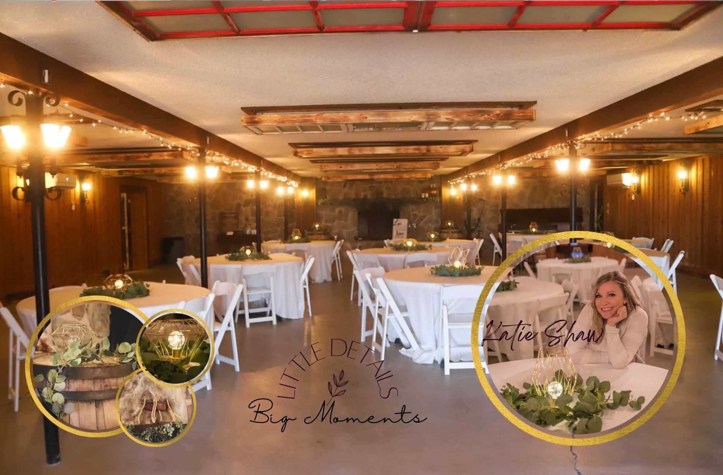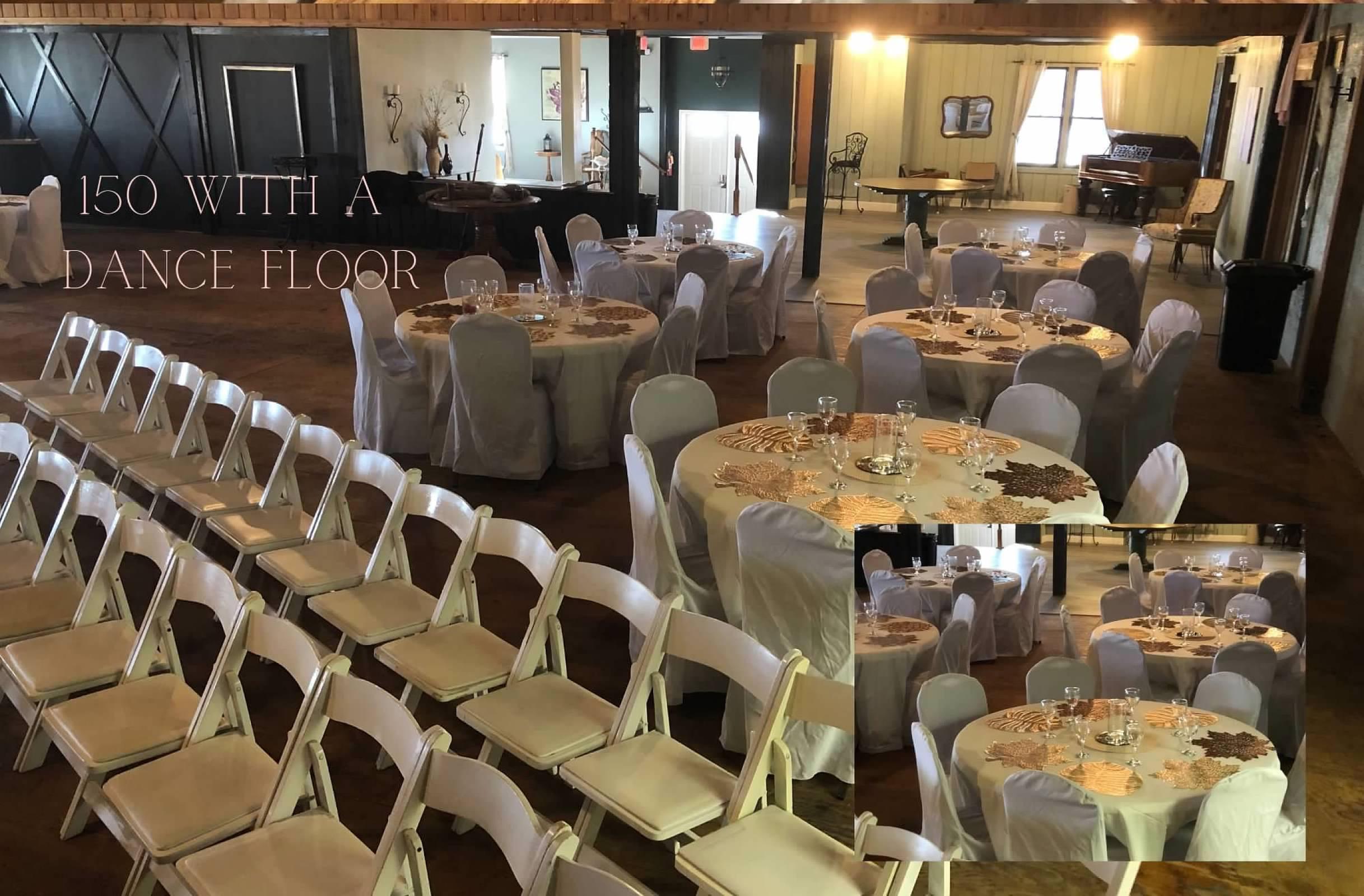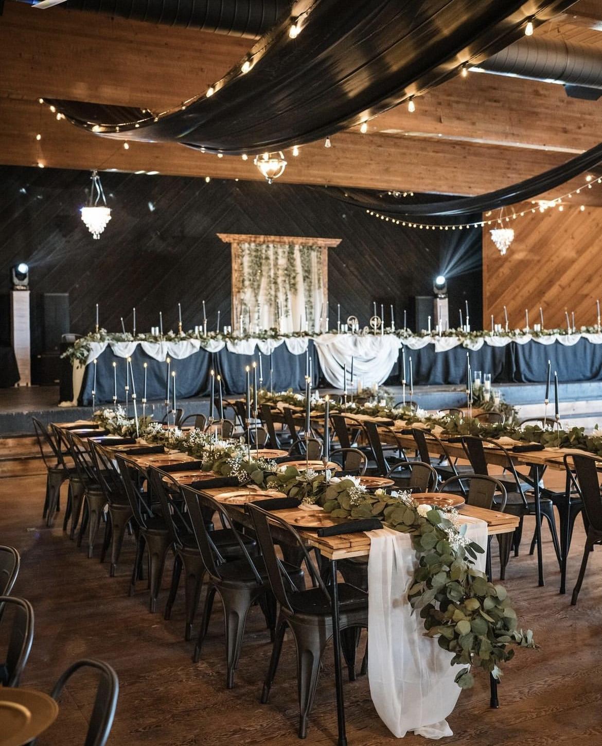 This space boasts 3000 square feet and high ceilings. Glass doors overlooking a big deck out looking on the prairie. Our 12’ rustic bar fully stocked with liquor, beer, wine & of course champagne! Finally a 50’ stage for your live band or head table! Let the festivities begin.