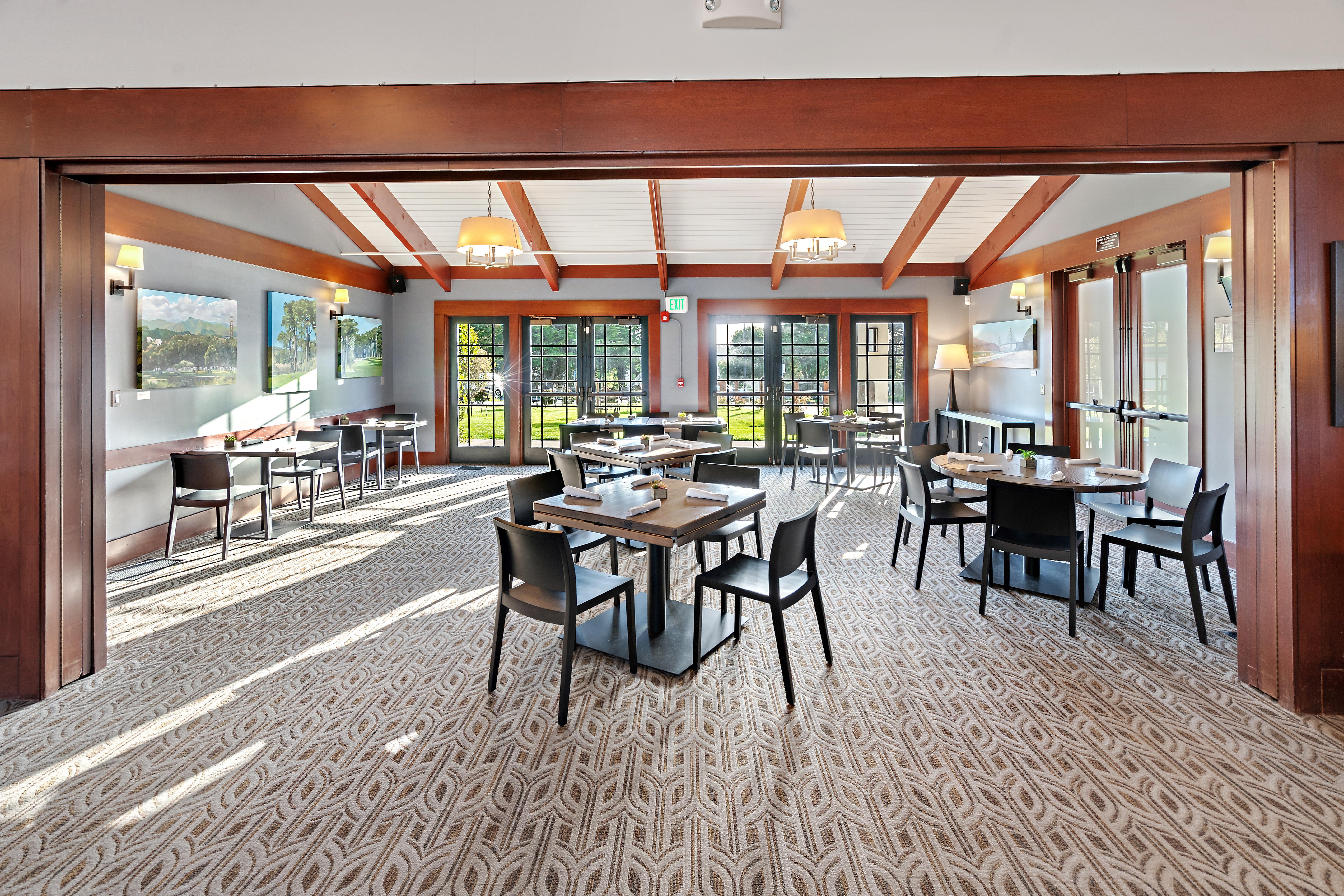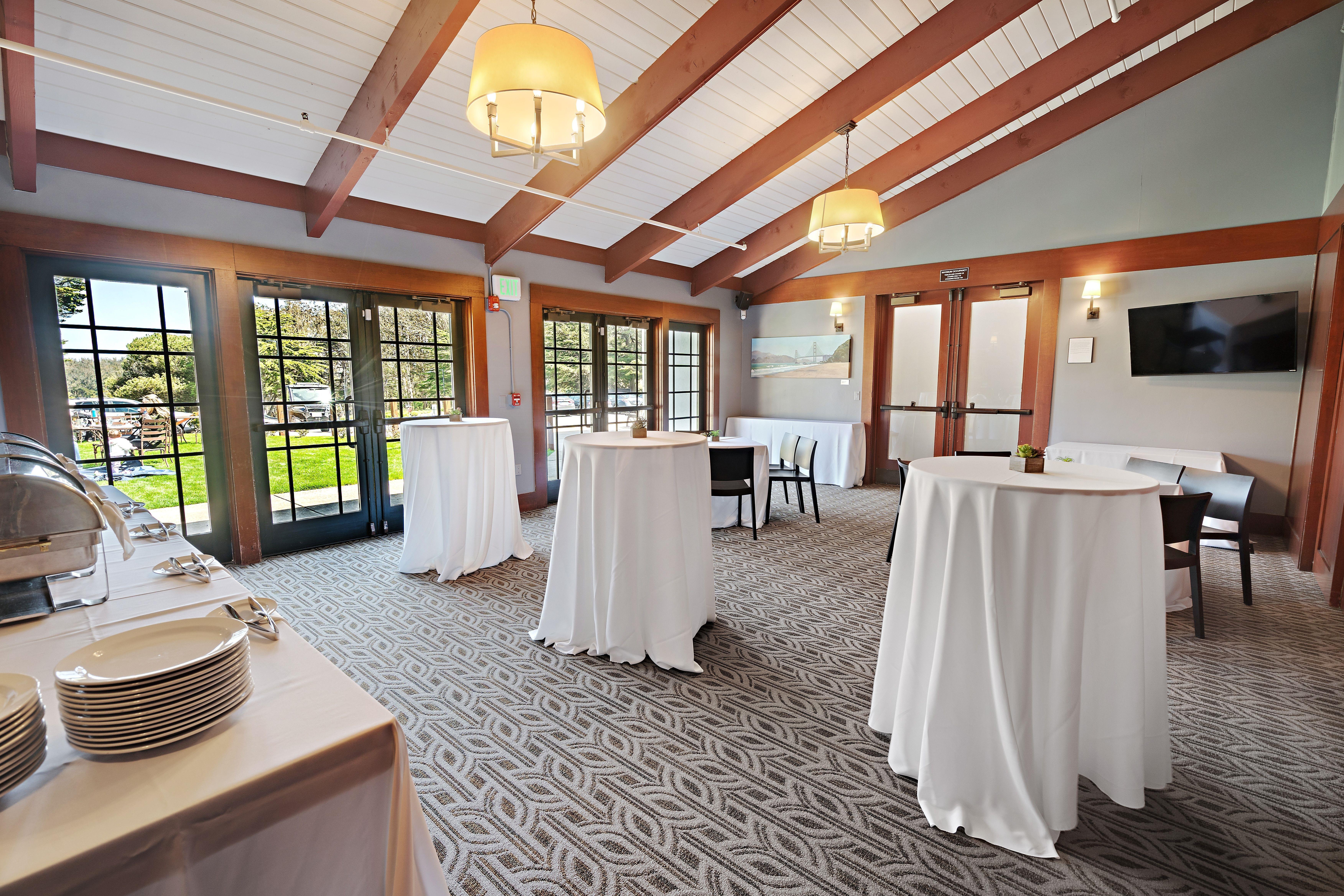 Nestled adjacent to the main Clubhouse, our intimate dining area has rich cherry wood-paneled pocket doors, glass-paned French doors, and a dramatic ceiling, creating an atmosphere of elegance. With immediate access to the outdoor lawn area and patio, this space accommodates up to 40 guests for seated events and up to 50 for an all-standing reception. For larger gatherings, additional guests can be accommodated with outdoor seating.