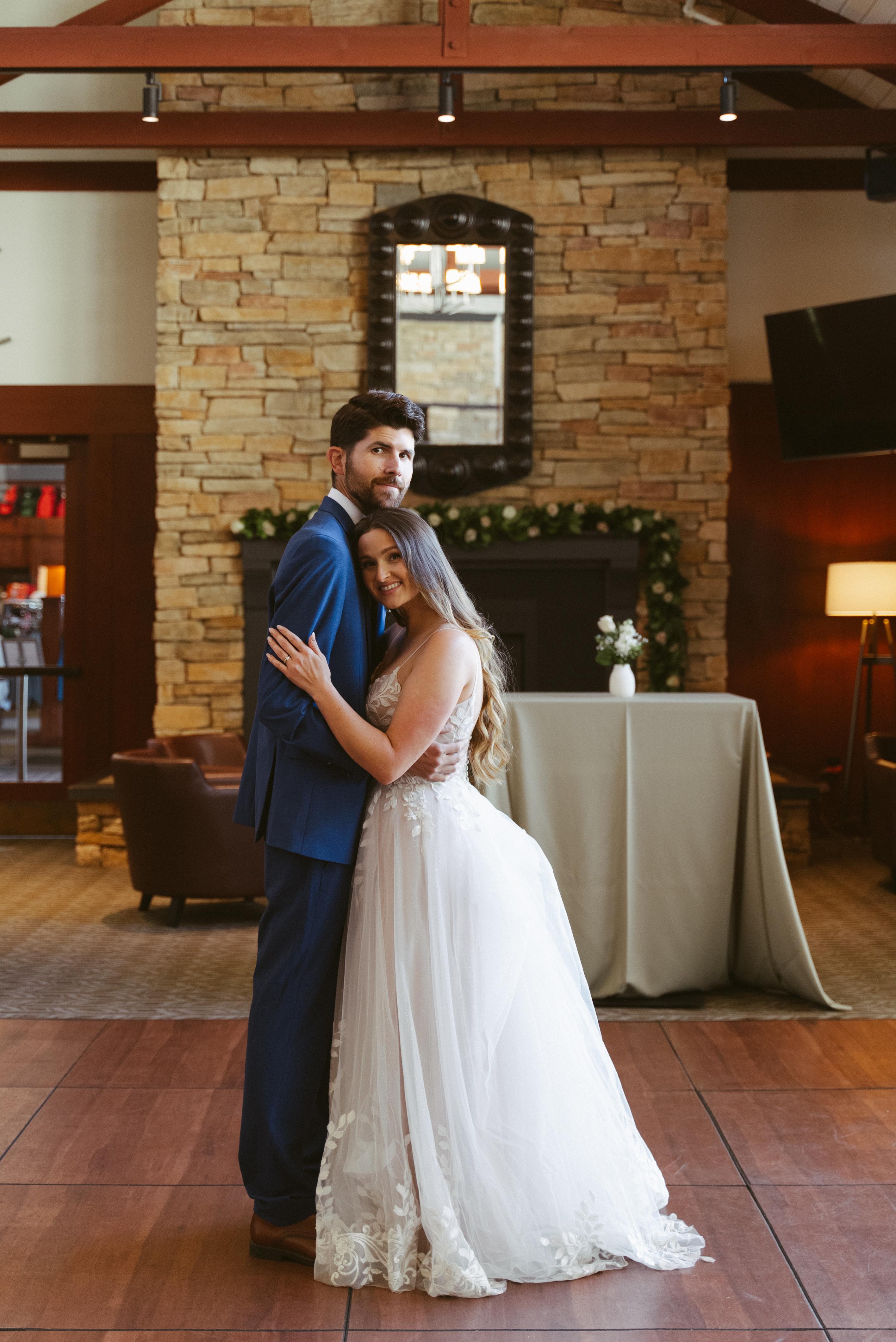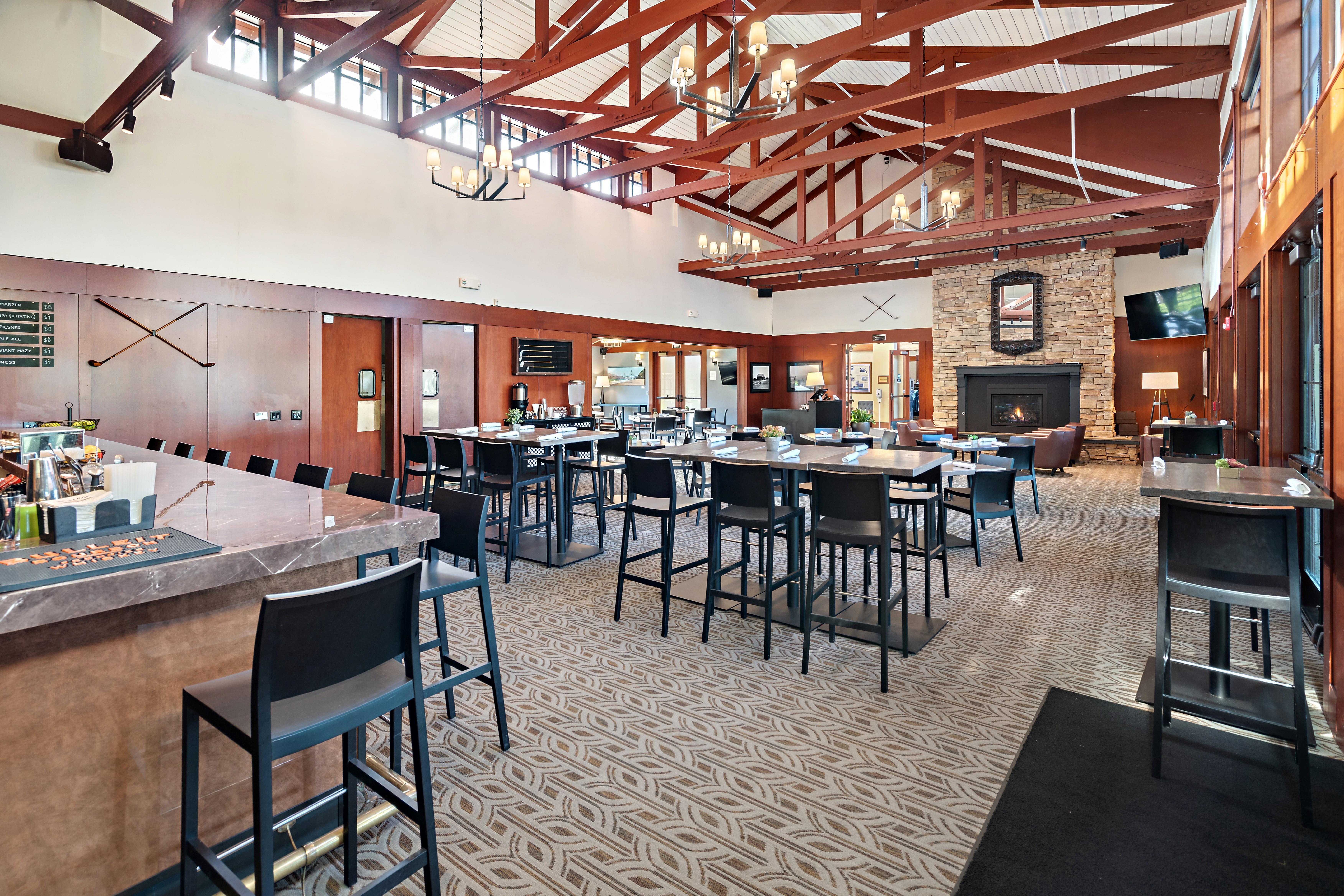 Our Clubhouse is a full restaurant (The Ironwoods) during the day and a beautiful cocktail hour and dance floor space in the evening! Outfitted with exposed beam ceilings, rich cherry wood paneling, a large stone fireplace & French doors. A large built-in bar creates a focal point upon entry and a perfect spot to serve our exquisite selection of cocktails, beer, and wine!