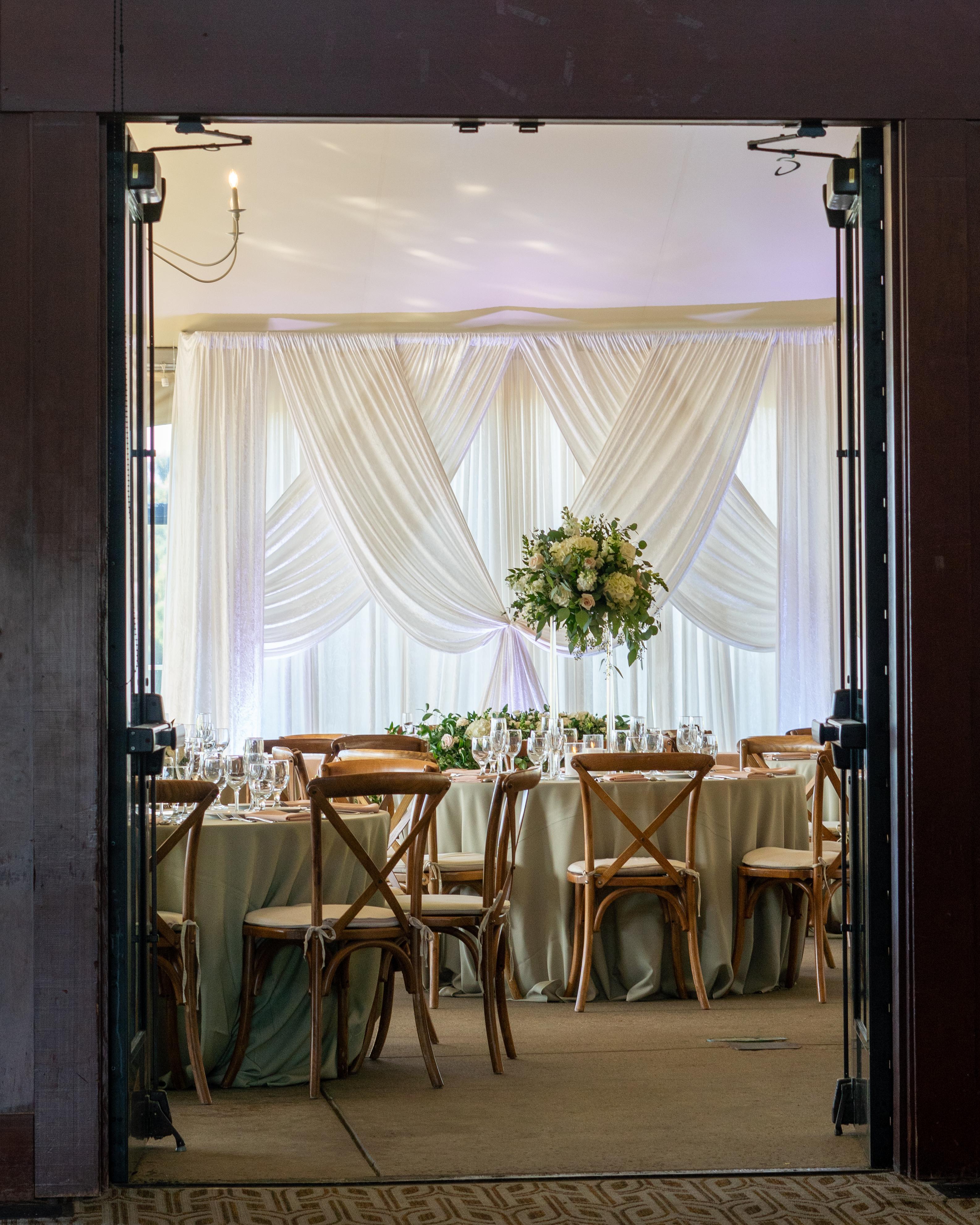 Our Tented Terrace, featuring a distinct French door entrance, essentially extends the capacity of our Clubhouse and creates one large event space. Our beautiful event tent encompasses our entire outdoor terrace (45’ x 55’), has a white top with clear walls and French doors. Your guests will find the Tented Terrace & Clubhouse equally comfortable and inviting. The tent is equipped with heaters & have a track lighting system with dimmers, allowing for an intimate dinner or festive dancing area!