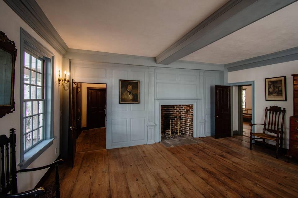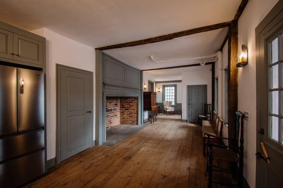 Contains the original Parlor and Hall from 1693, showcasing beautiful woodwork, wide plank floors, and massive fireplaces. This space could be excellent for photos, cocktail hours, or small events such as bridal showers. The property features two beautiful bricked intertwining courtyards that can be used for wedding ceremonies and receptions, accommodating up to 125 guests.