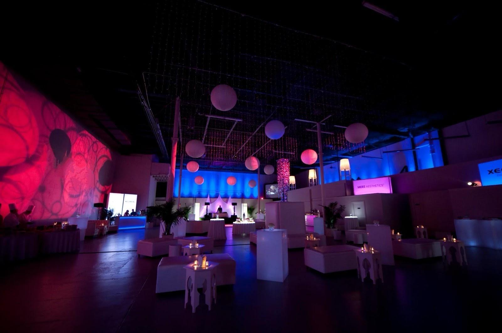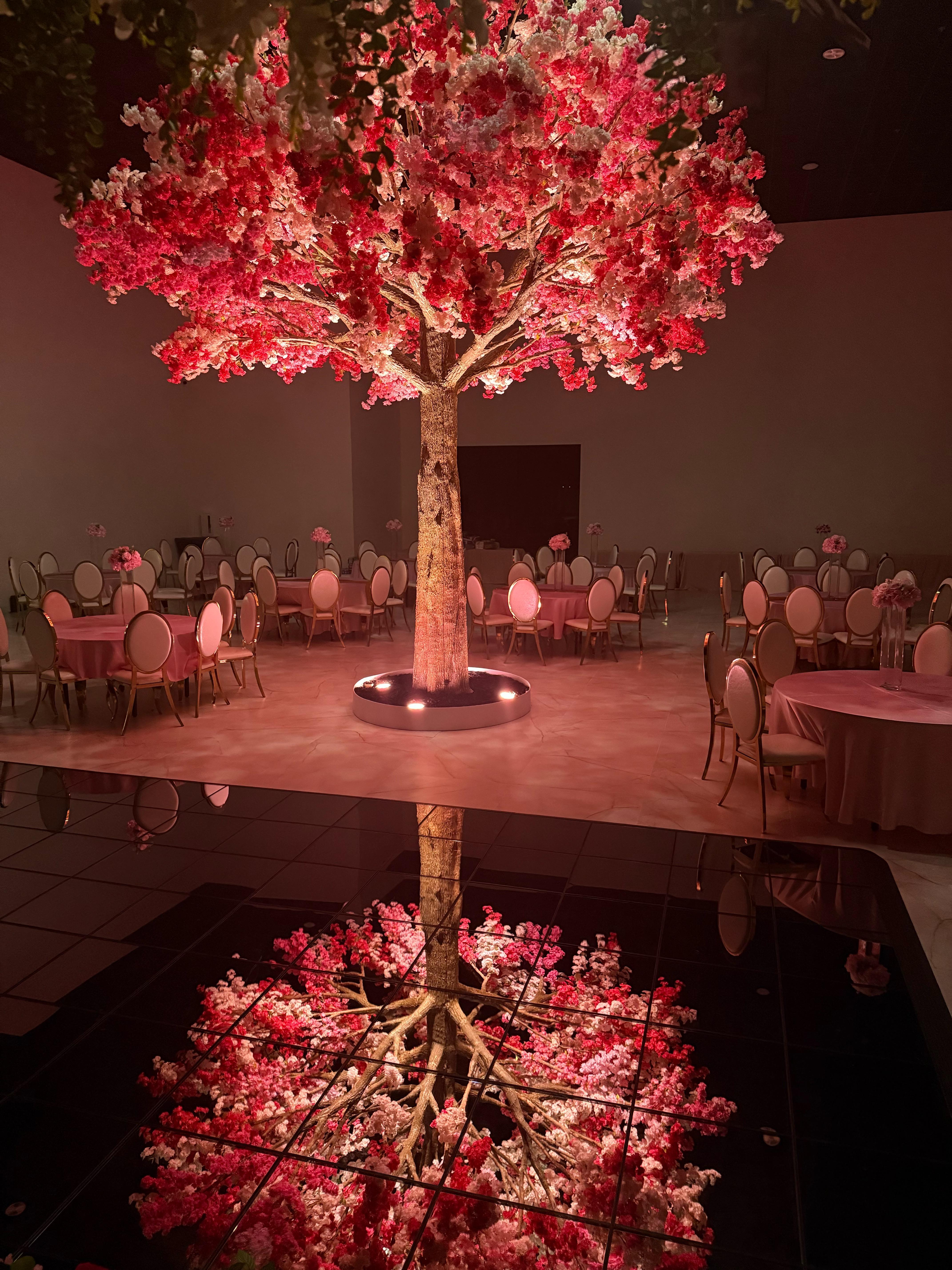 Stage, featured blossom tree with custom up lighting, mezzanine, private entrance