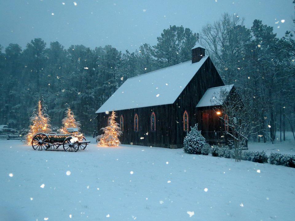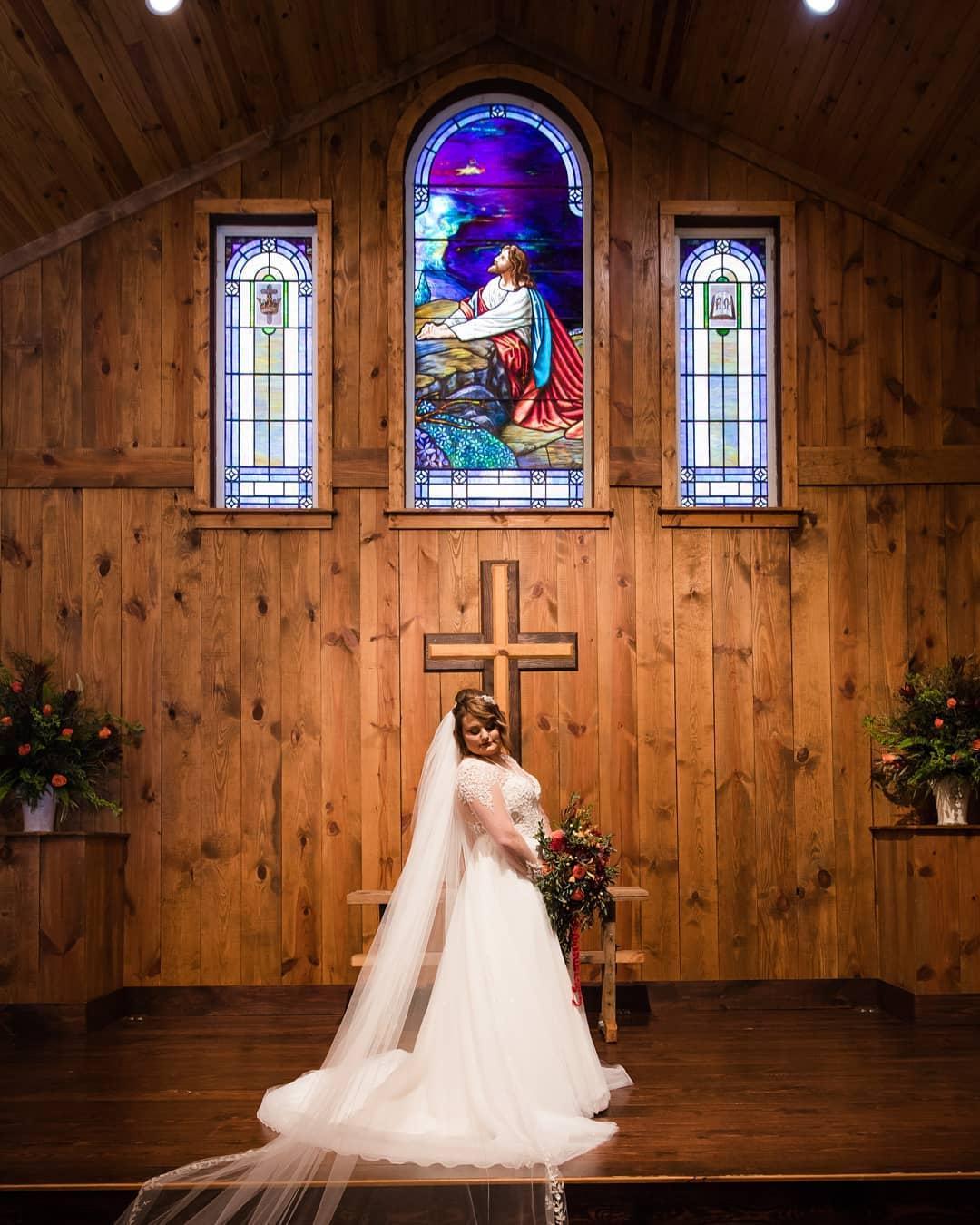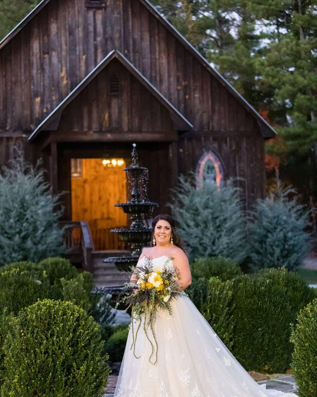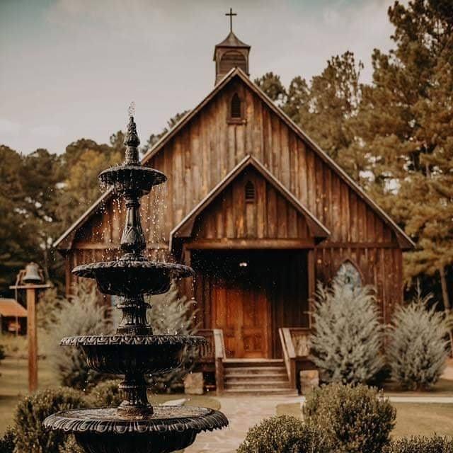 As you enter, the cobblestone walkway guides you around a fountain and evergreen shrubbery, you have a stunning background to the wooden chapel.