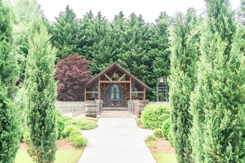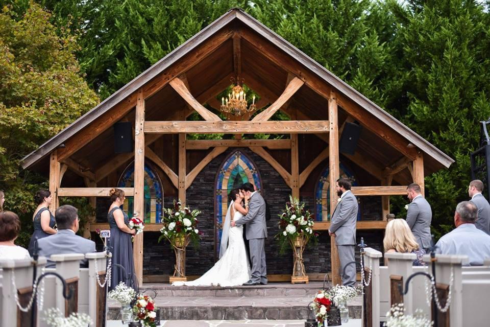 The aisle is lined with 24 church pews and iron hooks that are perfect for your aisle decorations. As many as 200 guests can be seated here, though extra seating is available with advance notice. The chapel itself resembles a wooden and stacked stone church, with stained glass windows and a chandelier offsetting the open air structure. The grounds surrounding the outdoor chapel are lush and vibrant, the surrounding evergreens providing a beautiful backdrop no matter the season.