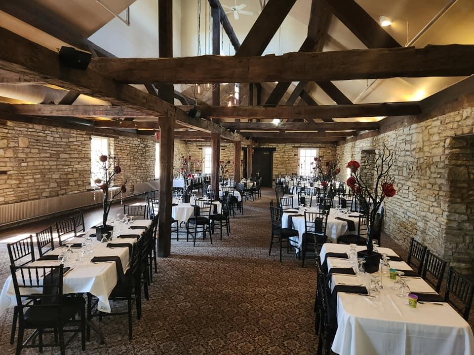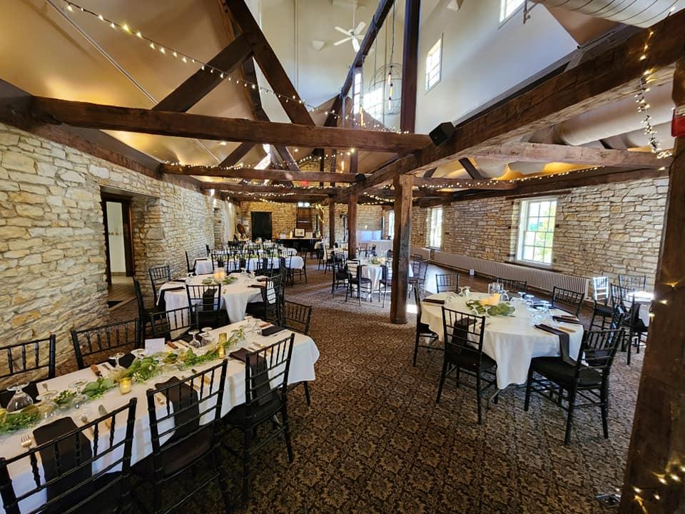 Hand hewn beams, limestone walls, 3 story vaulted ceiling.