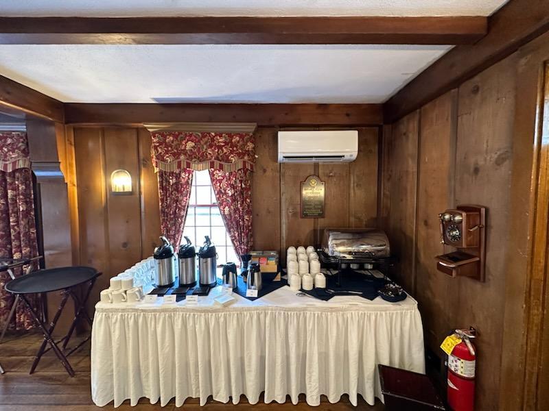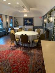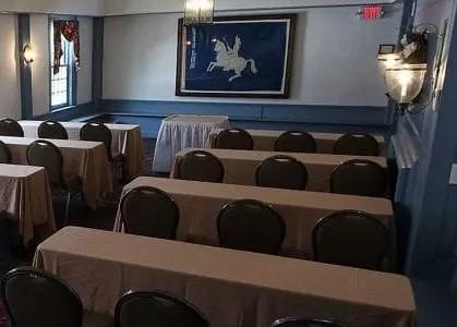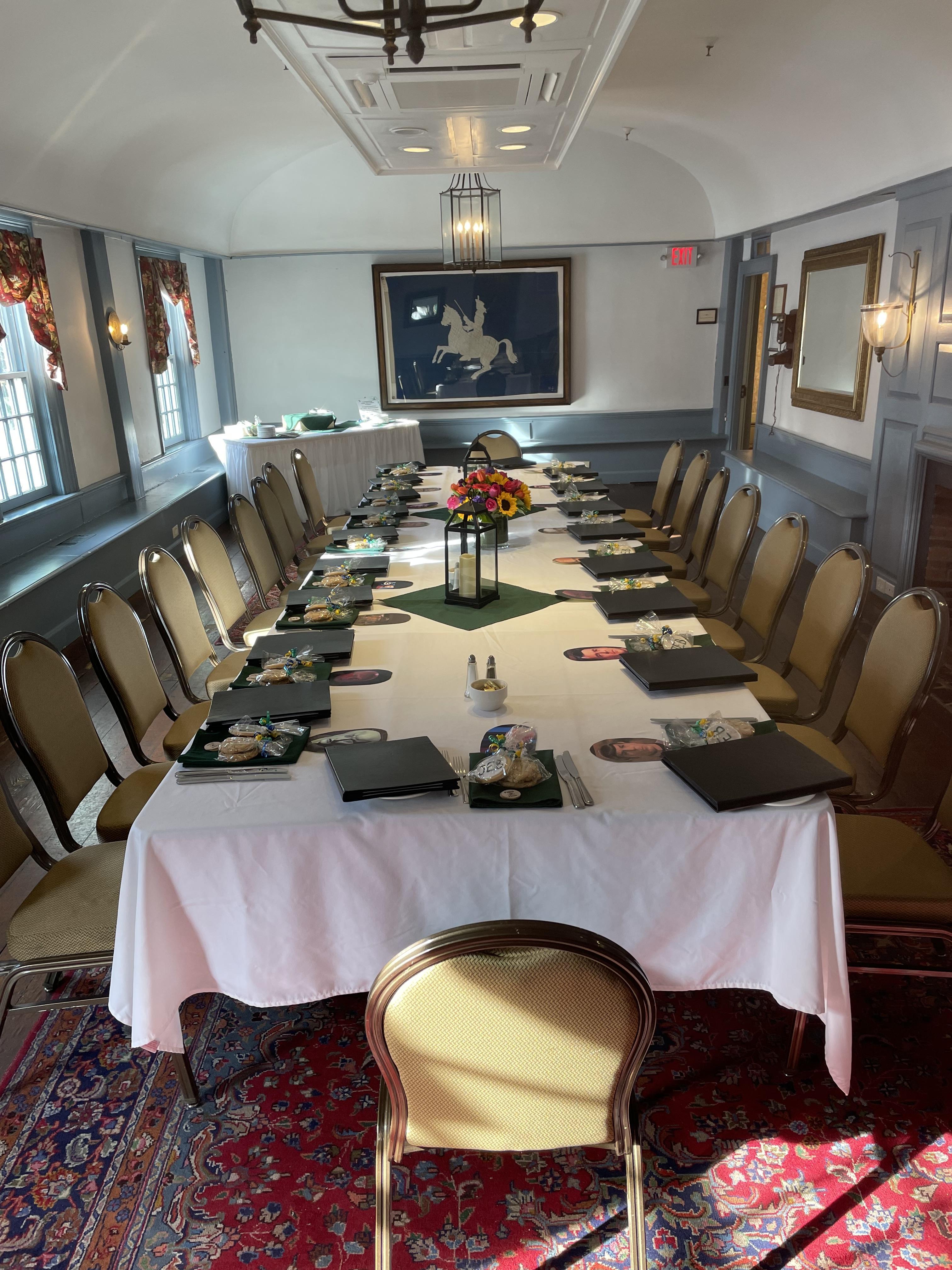Ideal for a mid-size gathering, this charismatic room with its unique barrel vaulted ceiling and wall of window seating overlooks our front patio. You'll find no finer place for an intimate dinner meeting or reception. This room’s name remains The Ballroom in memory of its legacy, where the ladies and men gathered for formal parties and dancing. An original 1771 flag is hung on the wall.