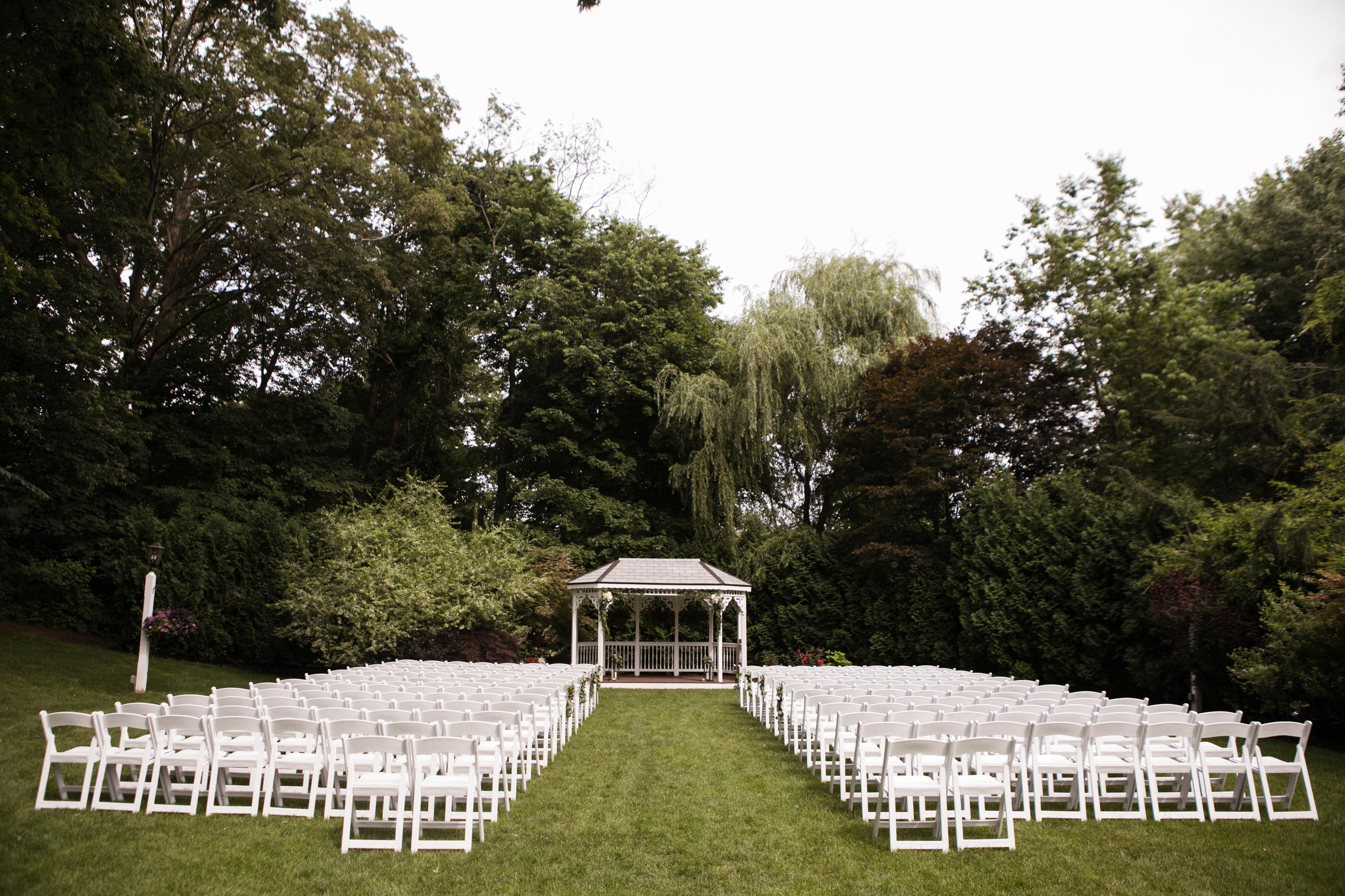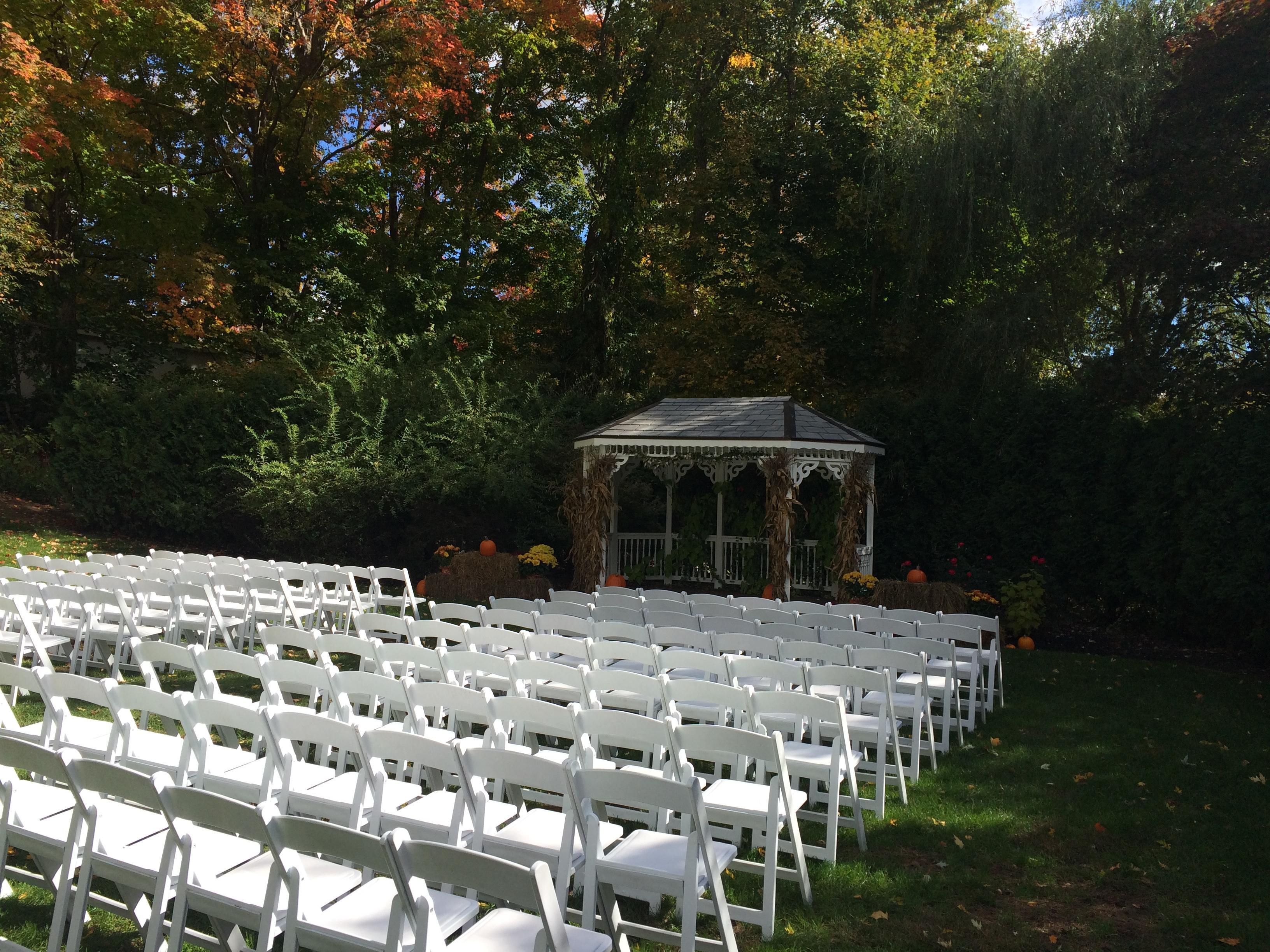 Our white framed tent with side walls and clear arched windows sits from May through October. Surrounded by glorious gardens