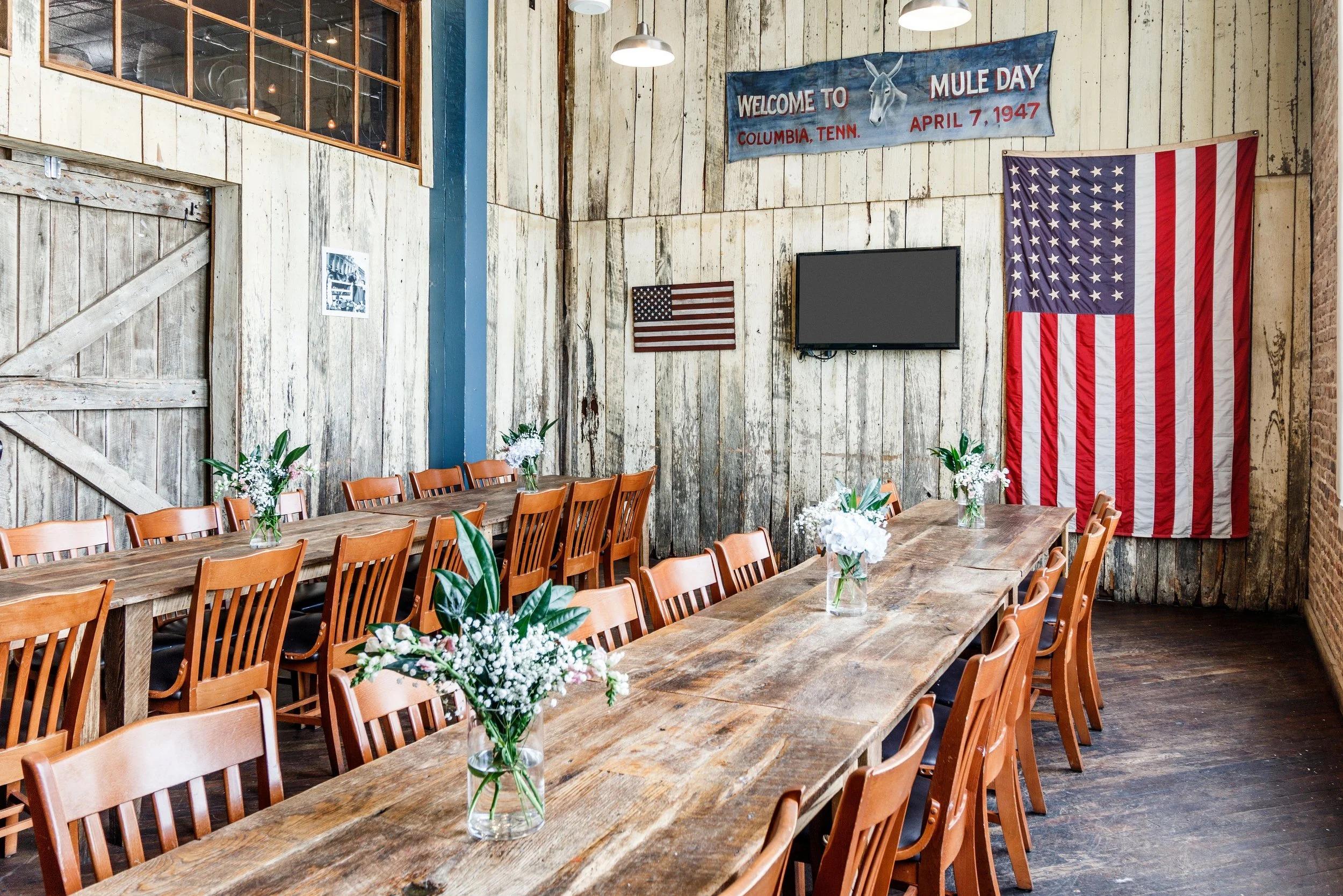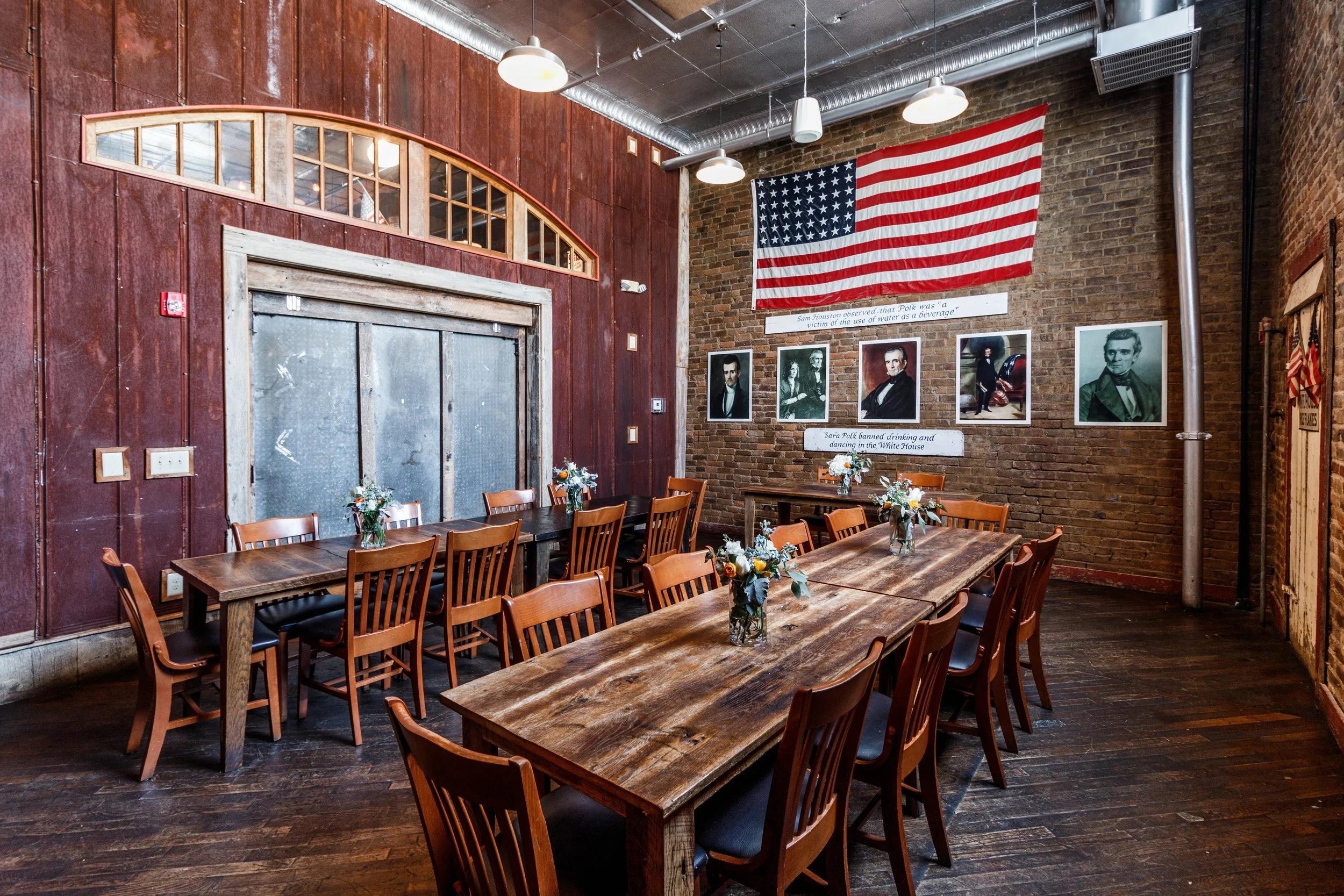 Rich in history and character, The Polk Room provides an intimate and patriotic setting for your event. Exposed brick walls adorned with portraits and historical artwork, along with a prominent American flag, create a unique and memorable atmosphere. With seating for up to 30 guests, it's perfect for a small rehearsal dinner, family gathering, or a wedding brunch. The Polk Room at Puckett's offers a truly distinctive backdrop for celebrating with loved ones.