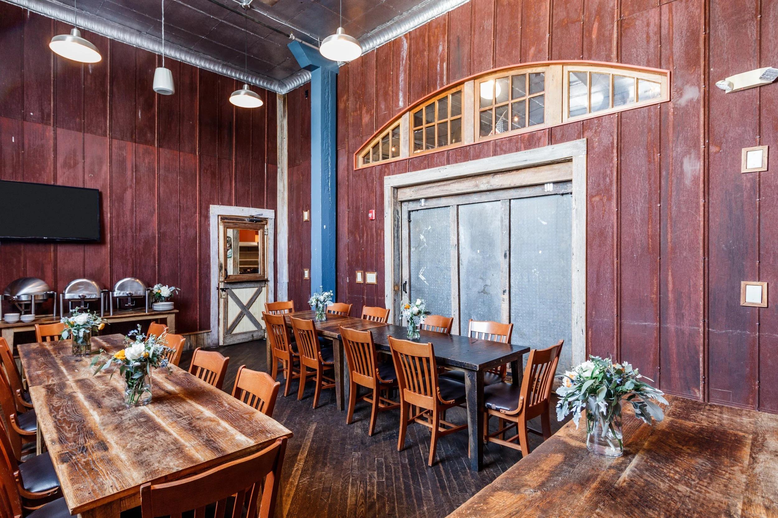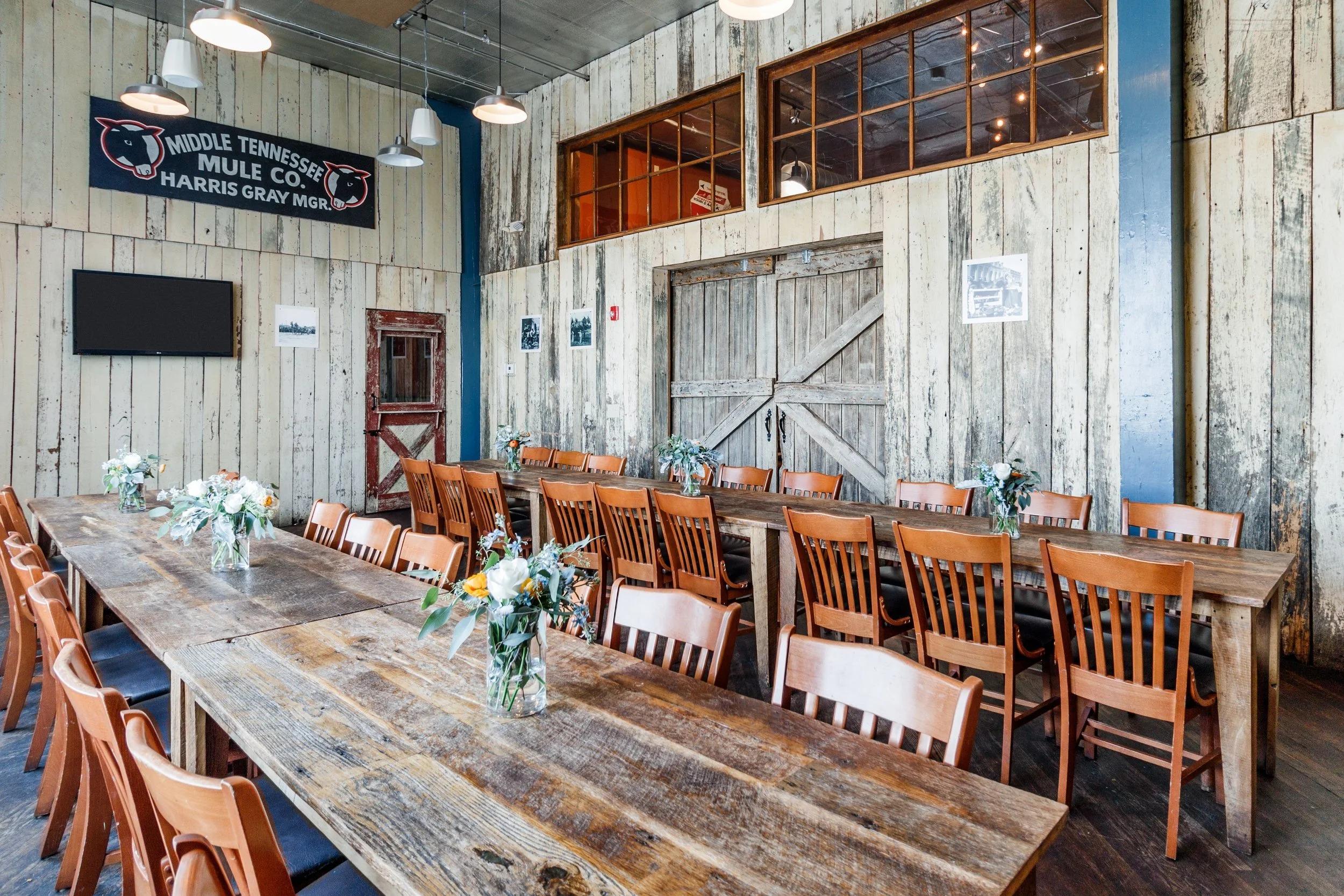 The Mule Room is ideal for intimate gatherings, whether it's a rehearsal dinner or a celebratory brunch. This private room features rustic wood paneling, exposed beams, and a charming barn door, creating a warm and inviting atmosphere. It’s the perfect setting for a private and personal event with your closest friends and family.