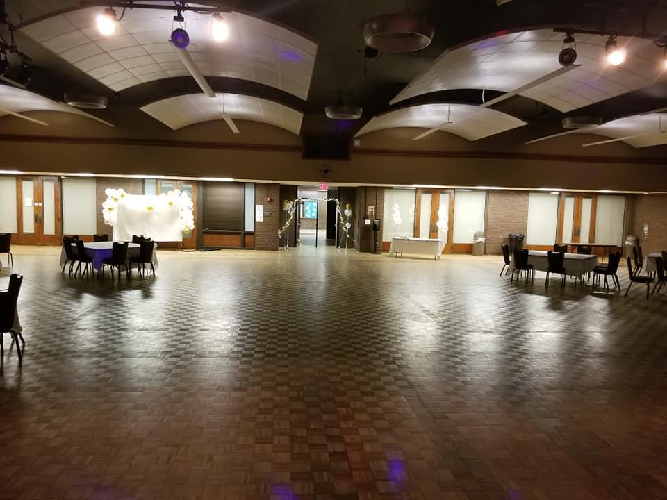 This space features wood parquet flooring with a fixed stage area. Dressing rooms just off the hallway are the perfect place for any touch ups throughout your event.