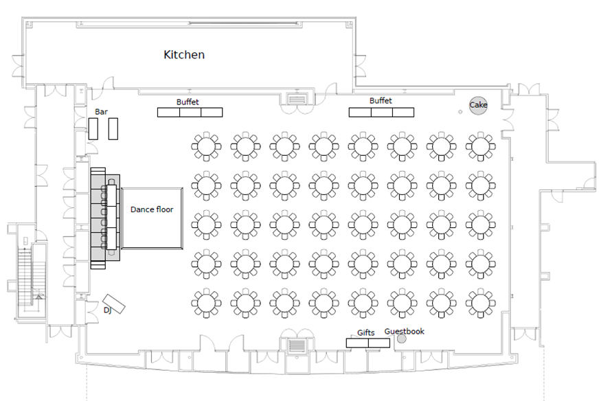 -Wood parquet flooring -Fixed stage area -Tables and chairs -Adjustable lighting