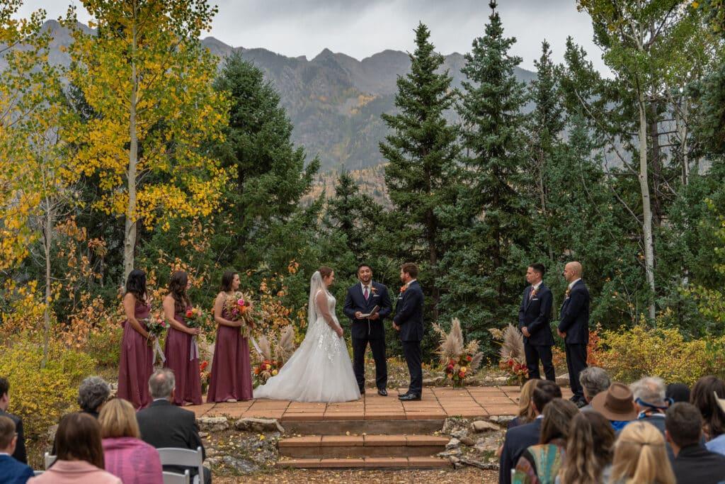 Gorgeous mountain venue, located outdoors under the wide open Colorado sky with rustic log benches for guest seating. The sweeping views of the stunning Needles Mountains (some of Colorado’s most jagged and spectacular peaks) make this a favorite photo spot year-round.