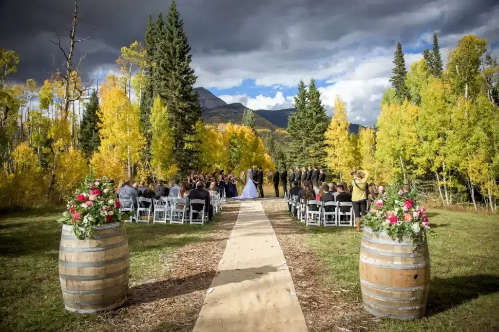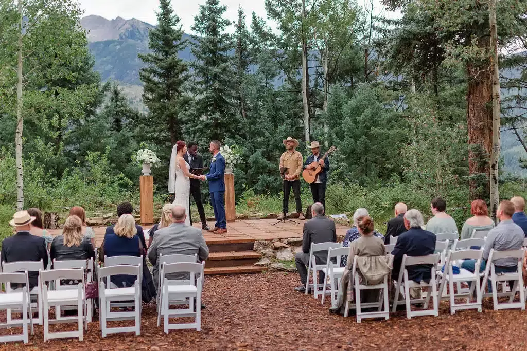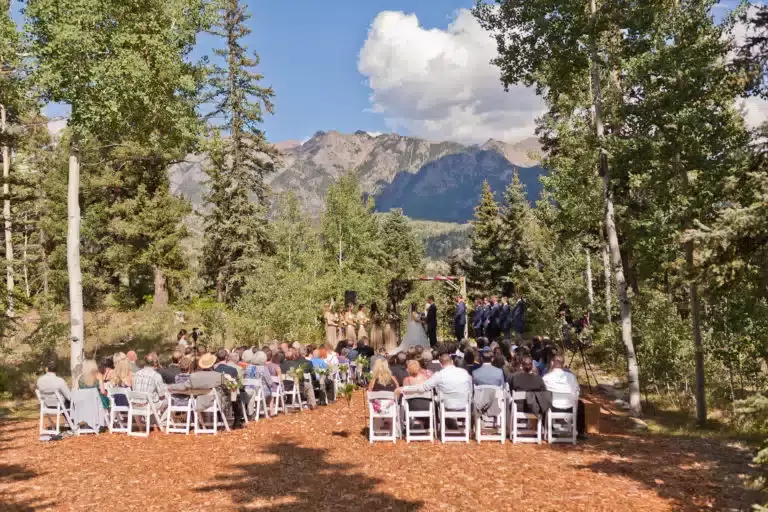 Situated in a grassy meadow surrounded by Aspens and Tall Pines with a view of the majestic Engineer Mountain in the distance. This lovely outdoor venue features white folding chairs for guest seating and is accessible via a 7-minute shuttle ride from Purgatory Resort Arrival Court. The ceremony site pairs with the Purgy’s or DMI Reception Venues and is available mid-June through mid-October.