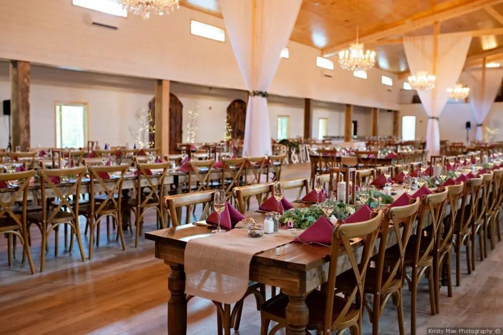 The Brookside Barn at Rainbow Wedding & Banquet Hall offers a picturesque setting for weddings, blending rustic charm with modern amenities. Nestled within 34 acres of southern pines, the venue features a 28-foot-tall barn adorned with four grand chandeliers and expansive balconies, providing a stunning backdrop for ceremonies and receptions. Couples can choose from multiple outdoor ceremony spots, including a flowing brook and scenic gazebo, or opt for the comfort of the climate-controlled barn. The venue accommodates up to 250 seated guests and includes amenities such as a spacious porch with an outdoor fireplace, lounge areas, and unique décor items from their "Something Borrowed" collection. With on-site parking and a dedicated team, The Brookside Barn ensures a memorable and seamless wedding experience.