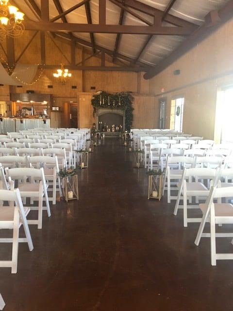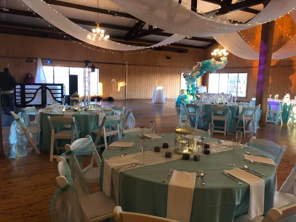 All day access to the venue and outdoor space; Ceremony sites including the main hall or in our lovely private patio garden ; 6 acres of outdoor space; Private suite for getting ready; 6000 sq feet of space in main hall with open floor plan, seating up to 300 guests; Authentic cedarwood floors and chandeliers; Ceiling treatment complete with ambiance setting twinkle lights; Built-in stereo system that is compatible with Bluetooth; A comfortable covered patio with cafe lights, furniture and lawn games; Full air-conditioning system; Complimentary tables and chairs for up to 300 guests; Linen and assorted decorative items available; Commercial kitchen for catering team to use; A built in bar with TABC certified bartenders and security ; WiFi Access; Ample parking.