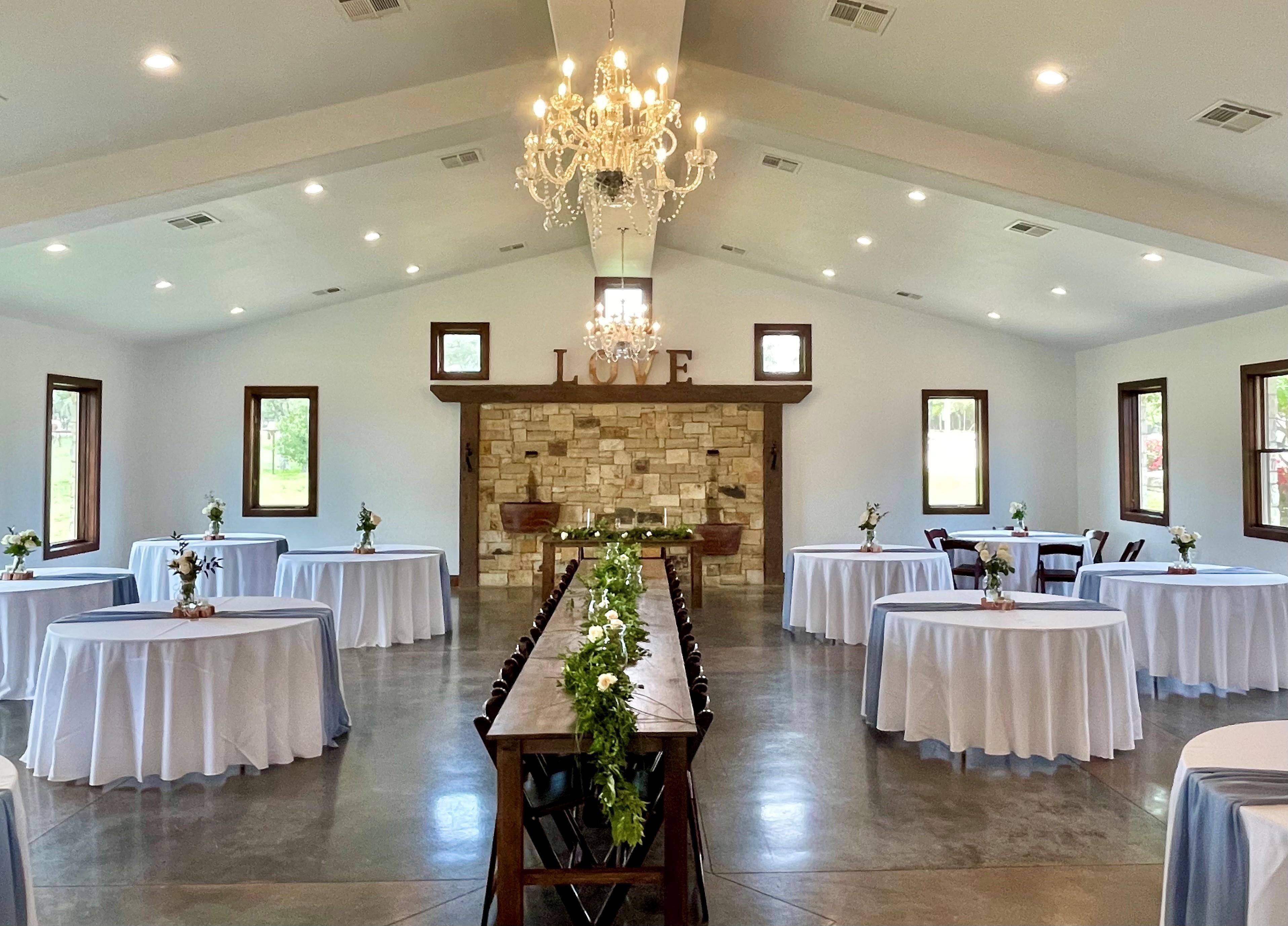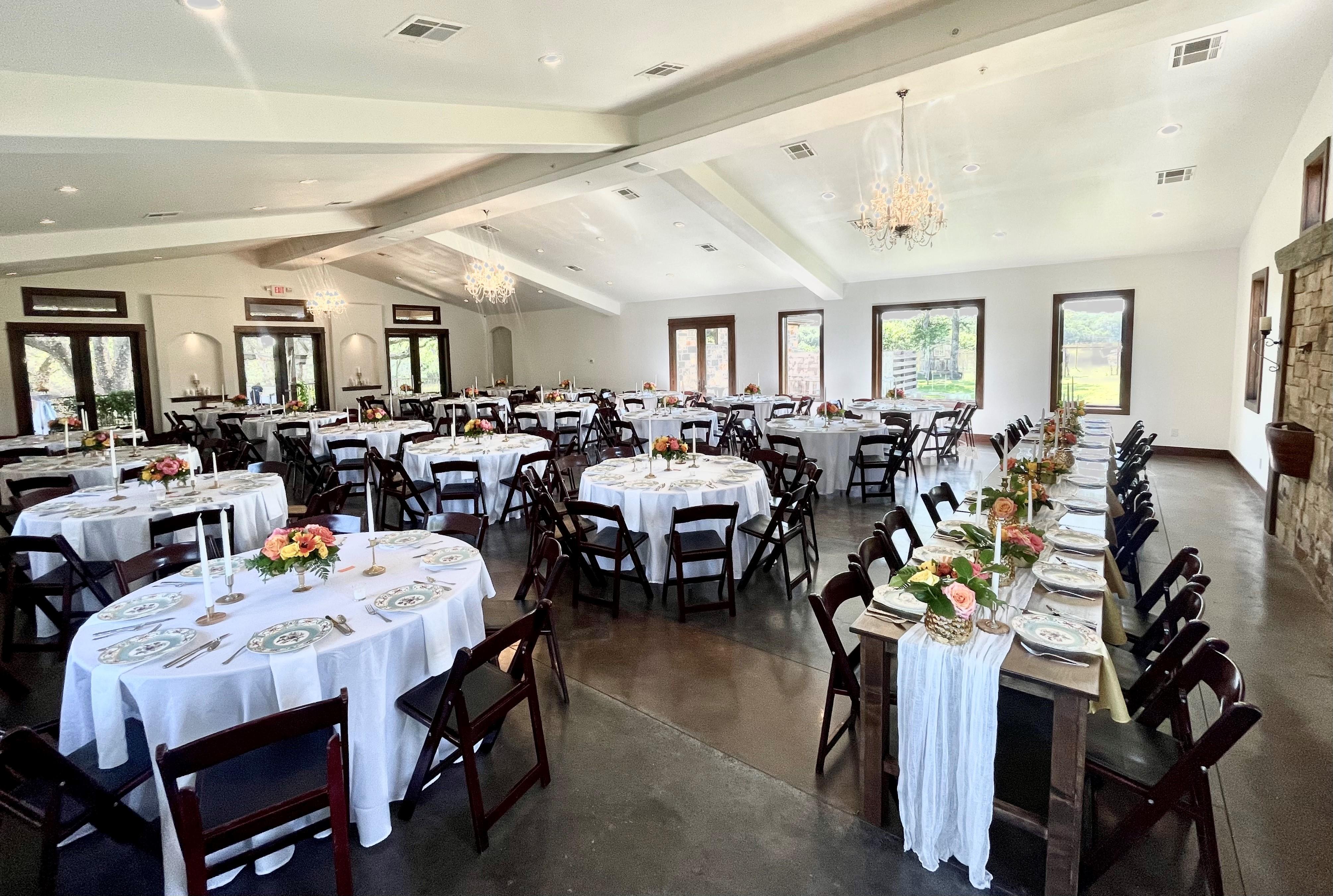 The indoor space offers chandeliers, and large windows and can accommodate up to 200 guests (160 recommended). The 10,000 sq. ft. patio boasts a covered stage, a full bar, a fire pit and is surrounded by oak trees wrapped in lights. Your guests will love the magical ambiance of this beautiful space.