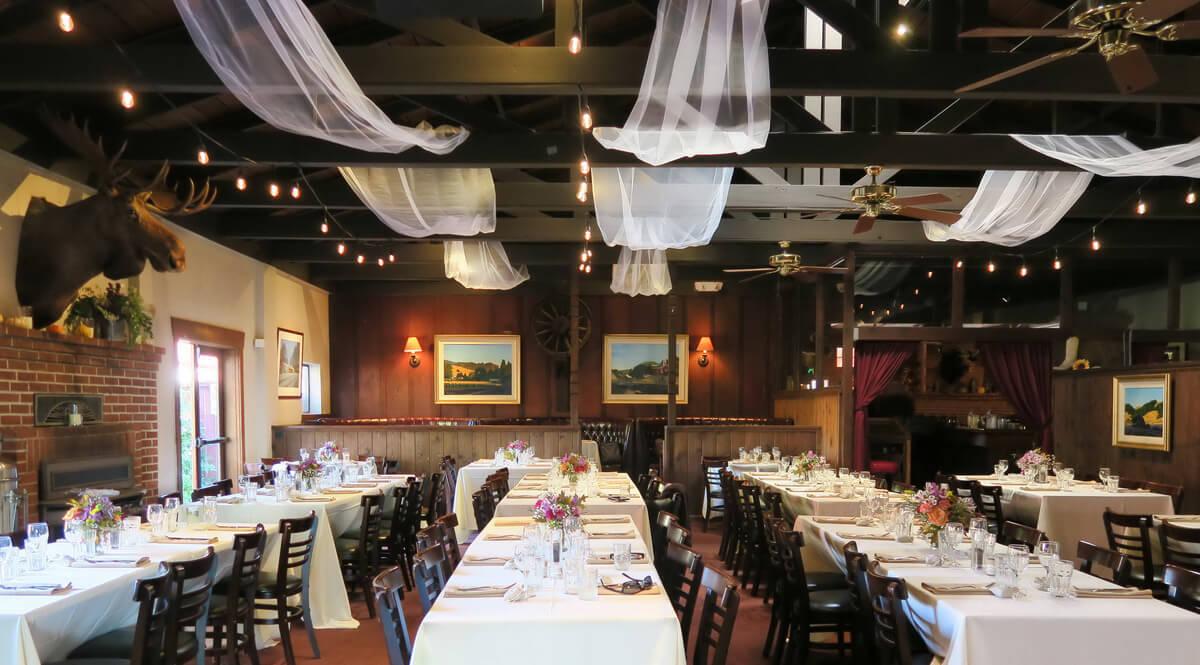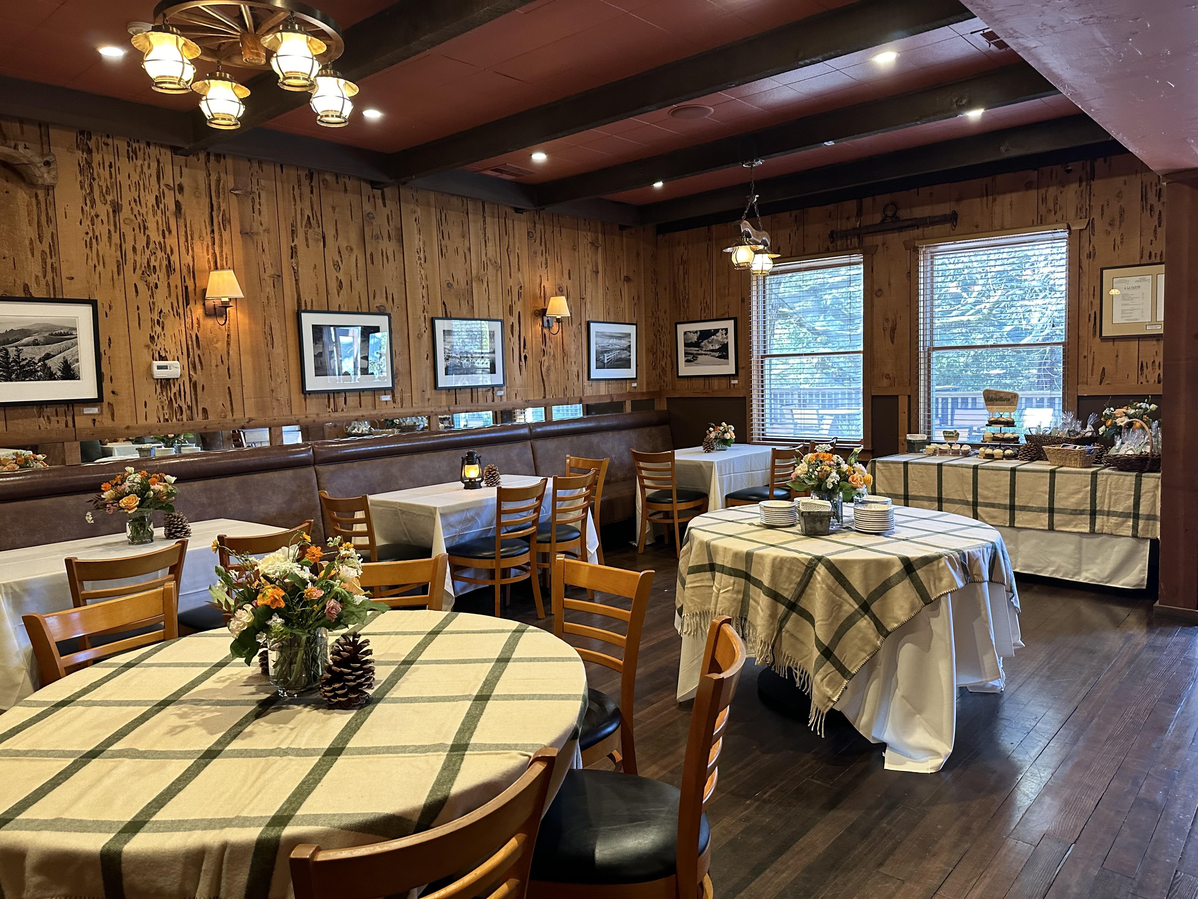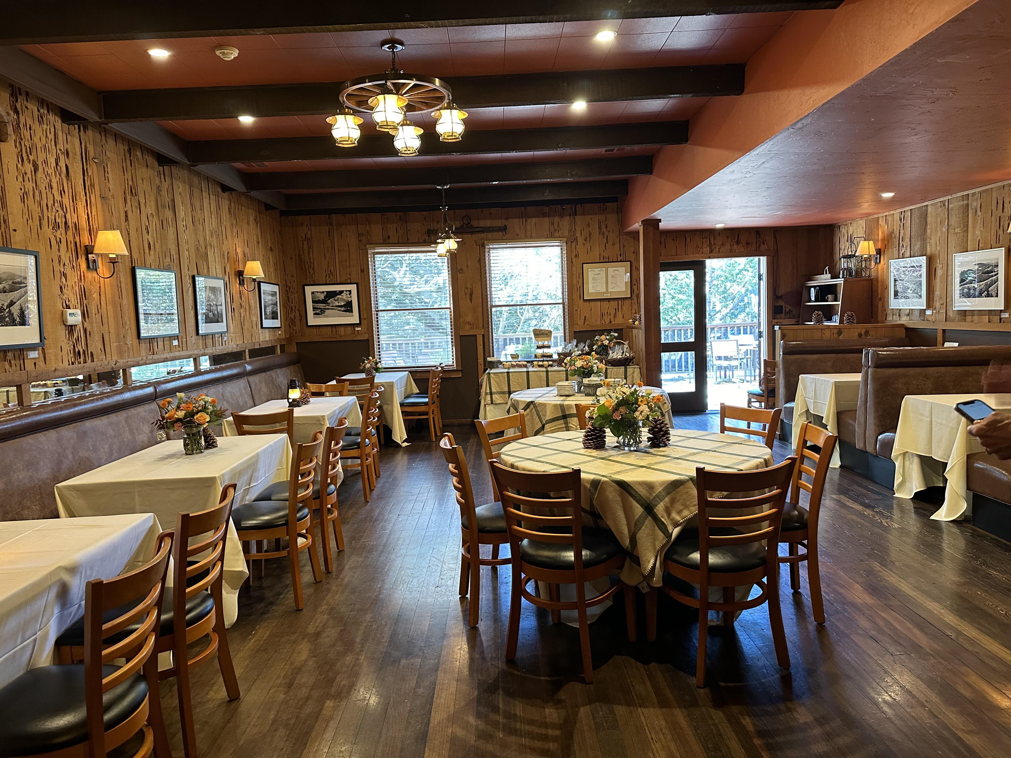 This smaller and more intimate dining room is a perfect location for meetings, parties and rehearsal dinners. The dining room with its own private sheltered deck adjoins the classic western bar with wagon wheels and a cozy brick fireplace.