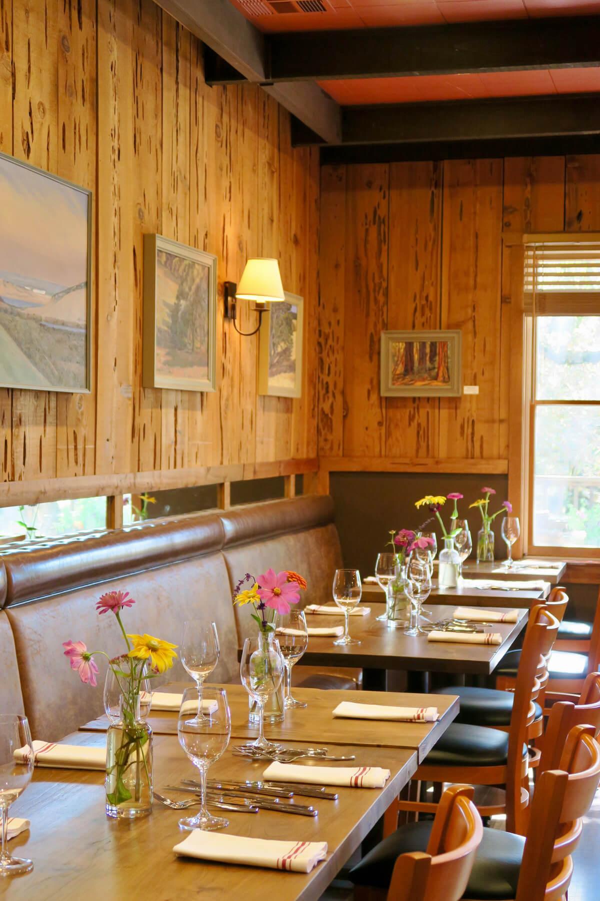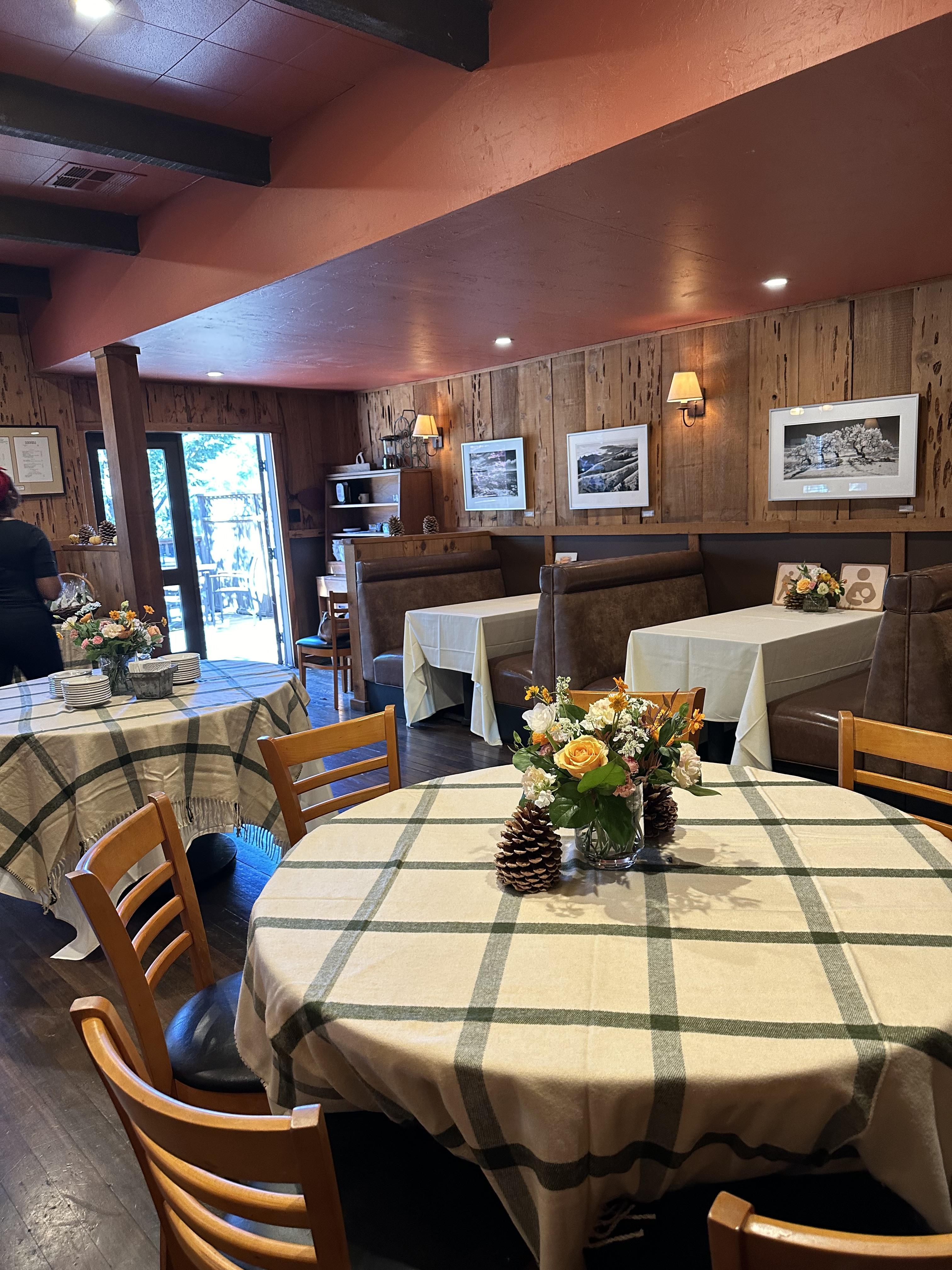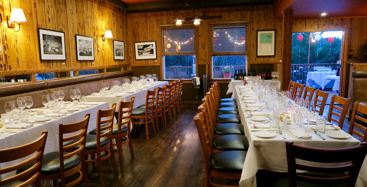 This smaller and more intimate dining room is a perfect location for meetings, parties and rehearsal dinners. The dining room with its own private sheltered deck adjoins the classic western bar with wagon wheels and a cozy brick fireplace.