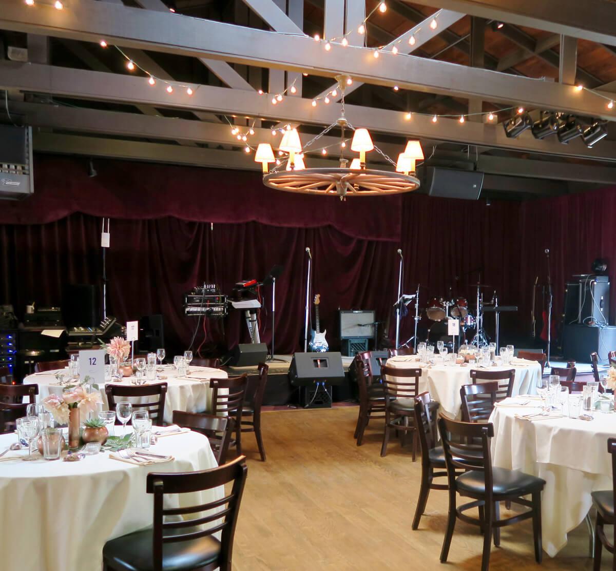 The Rancho Room has beautiful vaulted wooden ceilings, brass trimmed fixtures, a permanent oak dance floor, and a built in stage equipped with professional lighting and sound. The curtains on the north wall open to a panoramic view of the hills. French doors lead out to the Rancho Room deck, brick patio and lawn area.