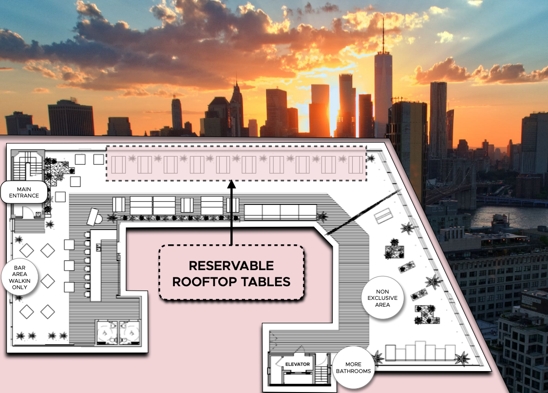 Bookable tables with unbeatable views, situated along a glass railing that faces the East River & Manhattan. A maximum of 4 tables can be booked per group. Perfect for groups that want a guaranteed 'home base' space up on the roof for a relaxed get together. Party platters and drink tubs can be ordered in advance (highly recommended)!