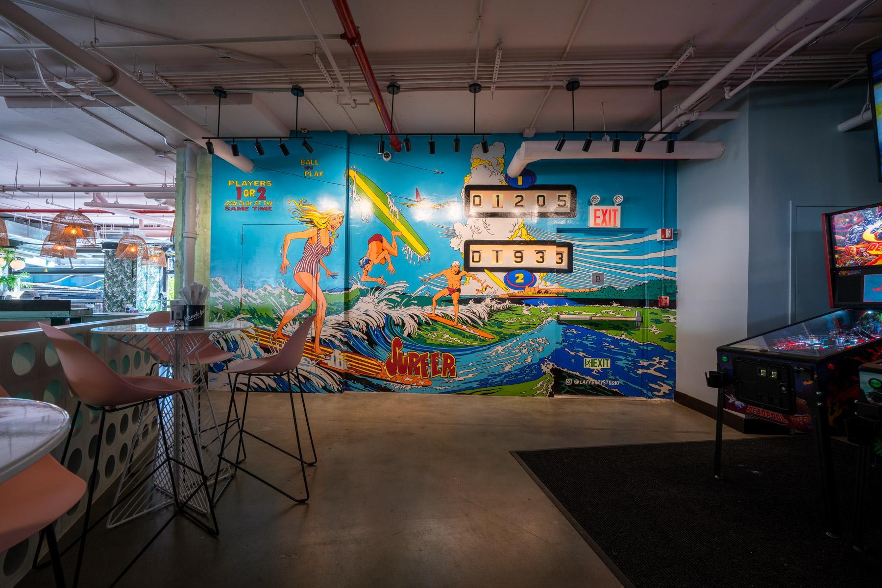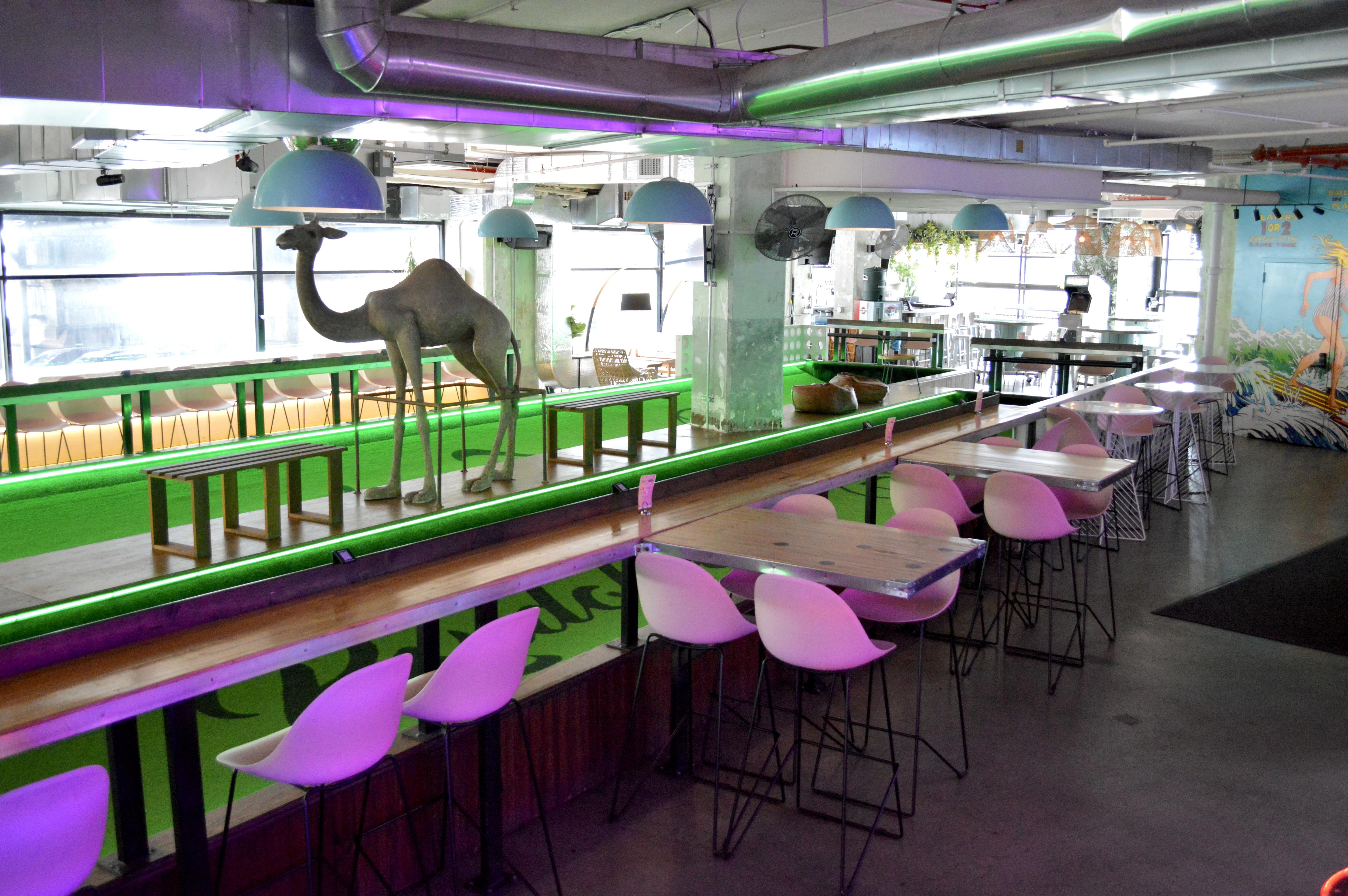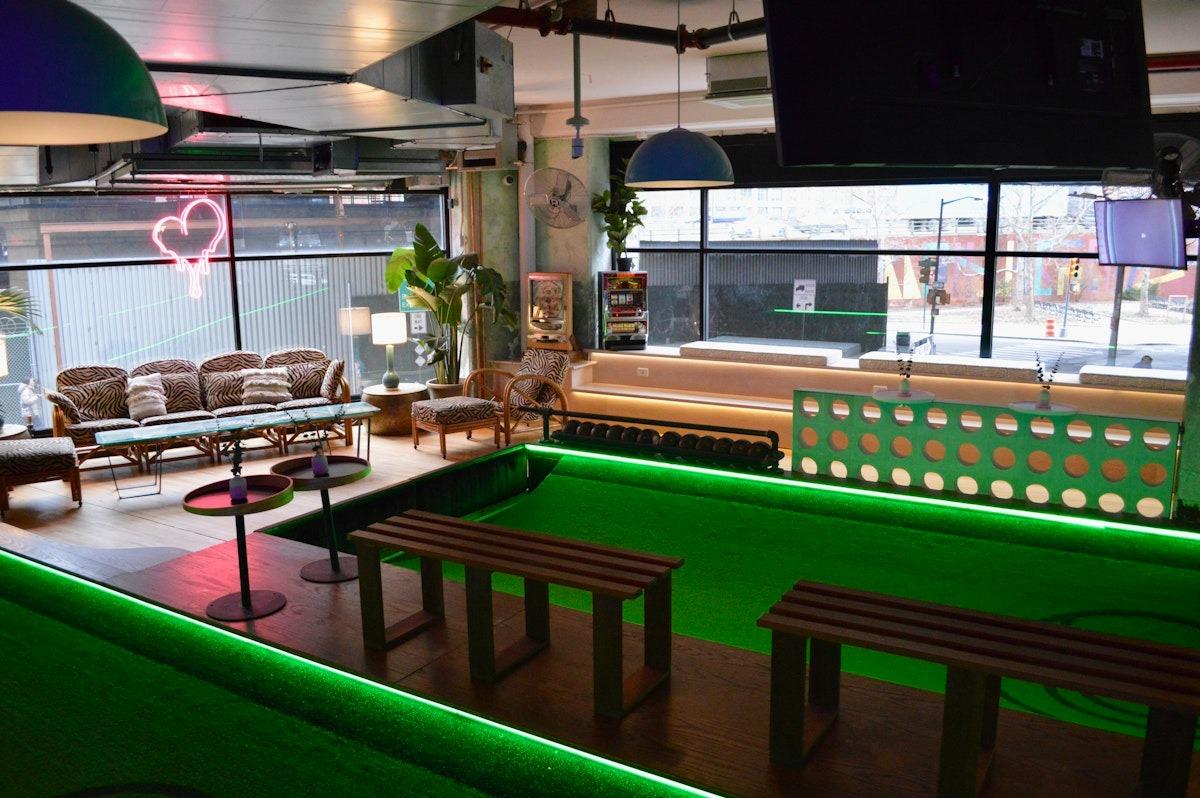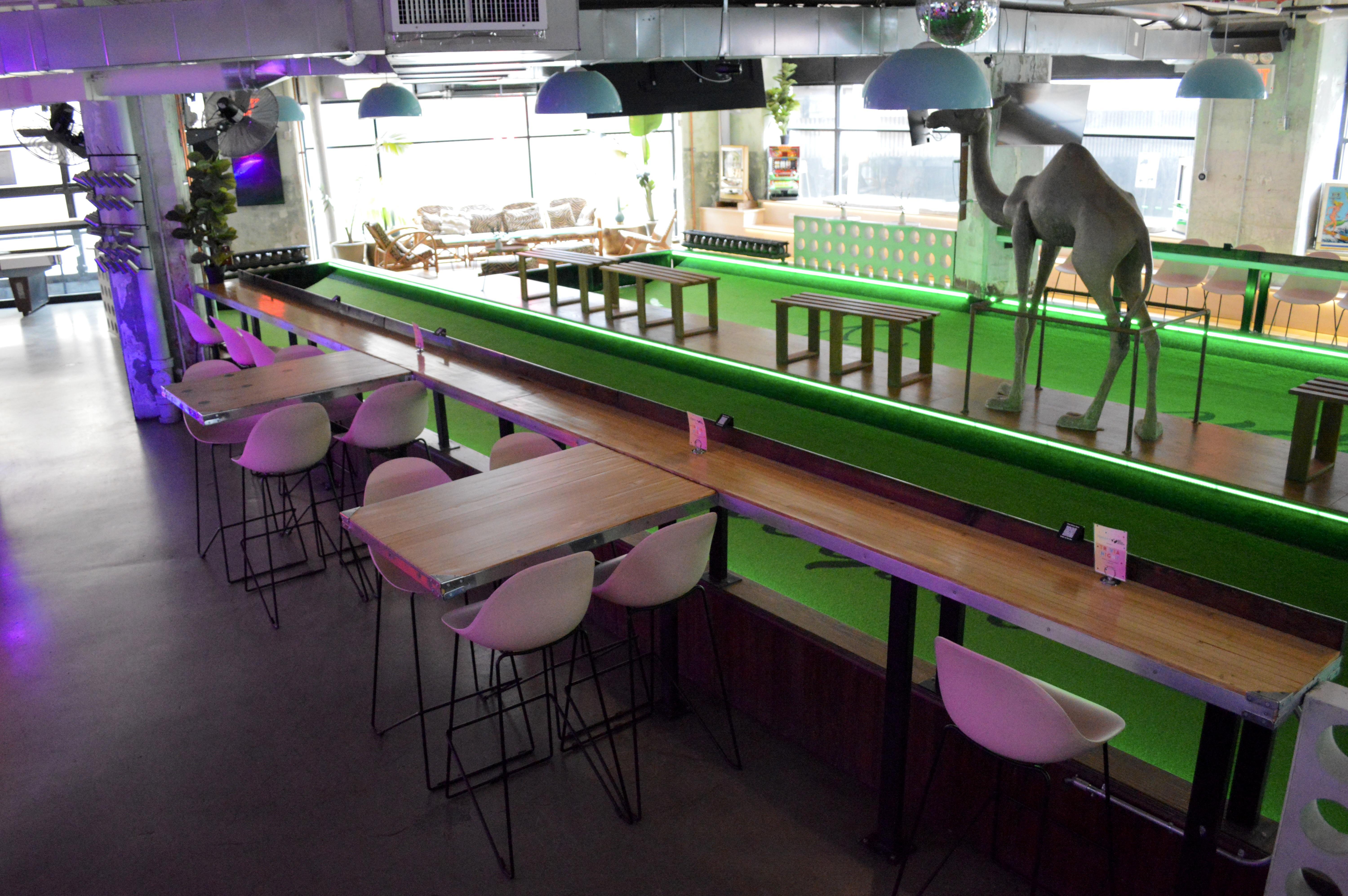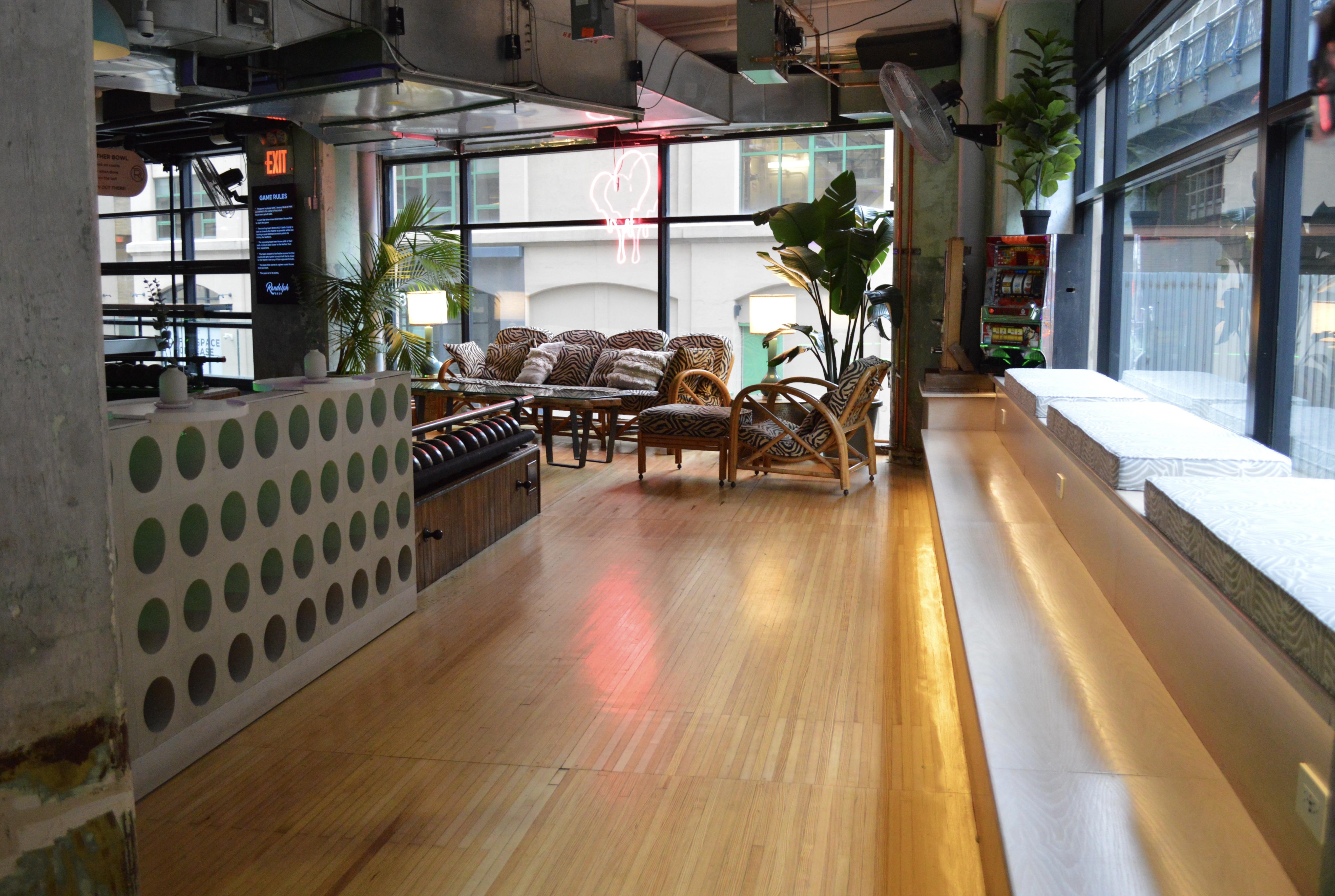 6.5k SqFt 80s-retro, bohemian chic, adult playground with NYC's only Belgian feather bowling courts. There are also nostalgic arcade games, shuffleboard, pinball, photo booth + more. Great for events that want their childhood dreams realized, all grown up! The bar Tulum area and thoughtful decor throughout the space suit events of all kinds from high-end to casual, however if you're not taking advantage of the games you're kind of ordering a salad in a steakhouse.