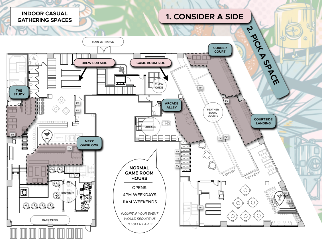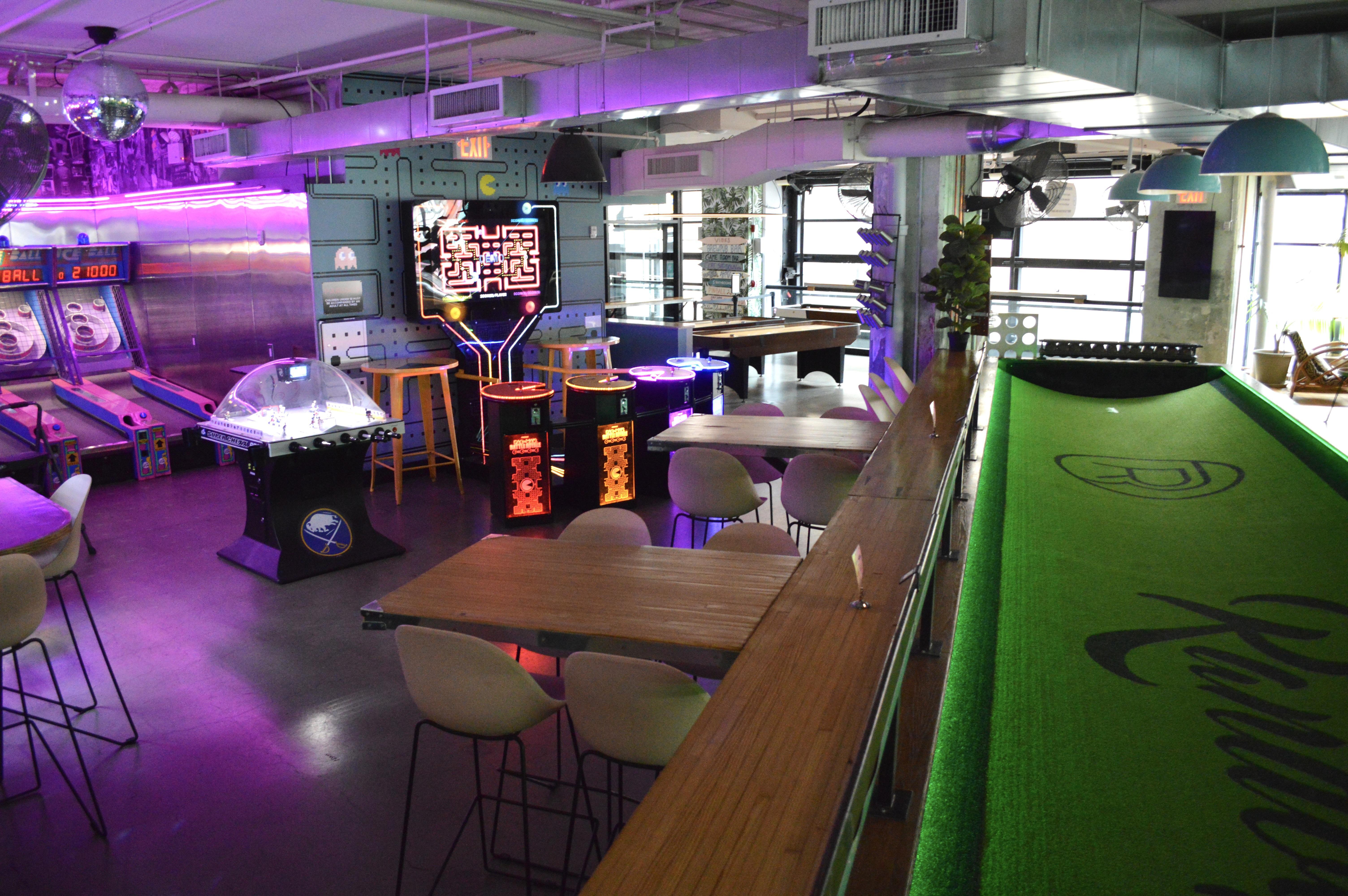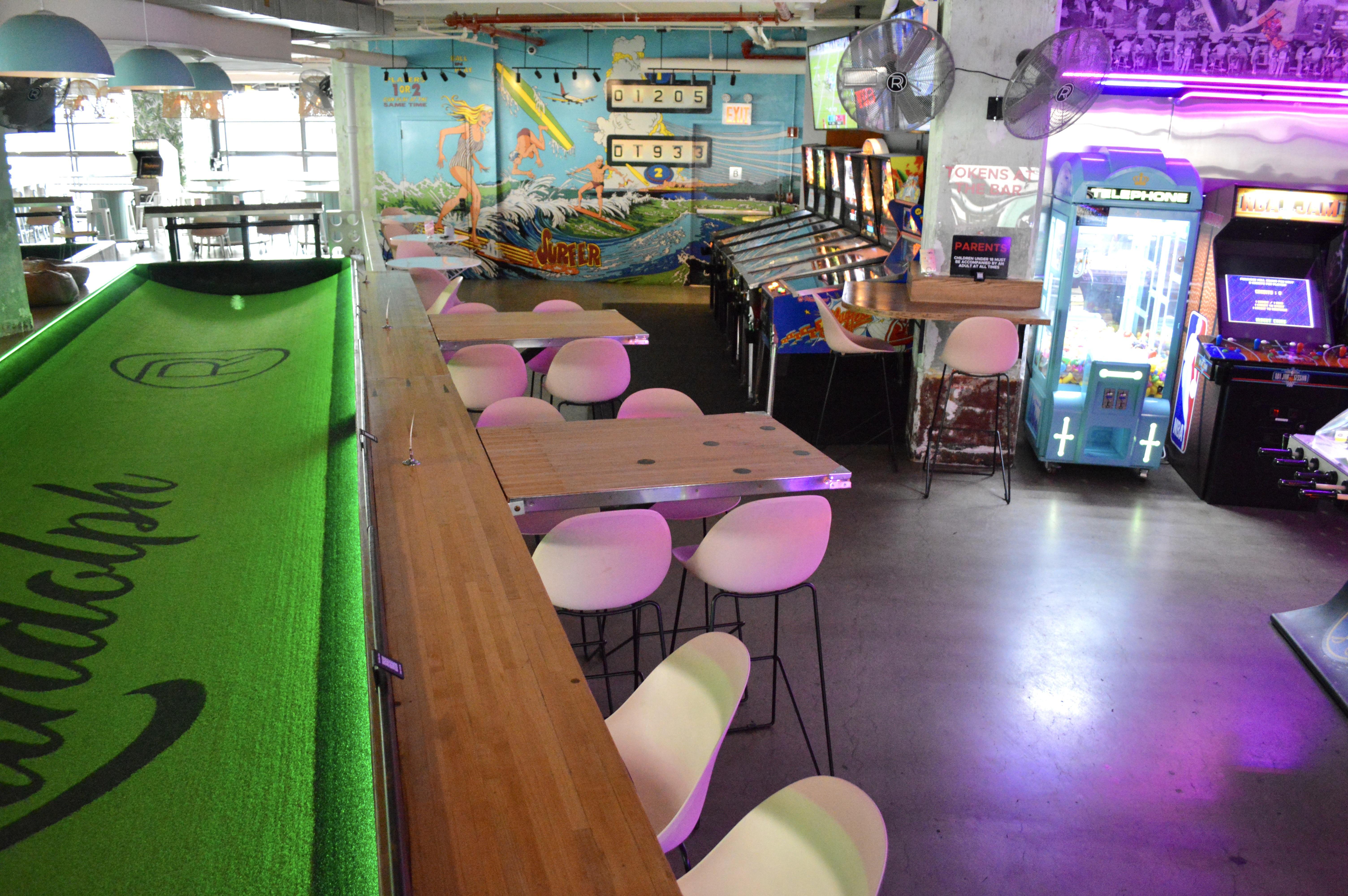 2 Hi tops + gents rail seating wedged in between the feather bowling courts and the arcade + 1 dedicated TV and 3 more close by GOOD FOR: Group that wants a home base in the game room right near the arcade and TVs + potentially looking to feather bowl.