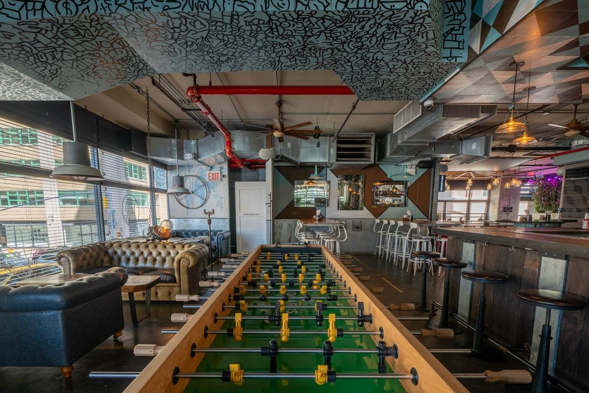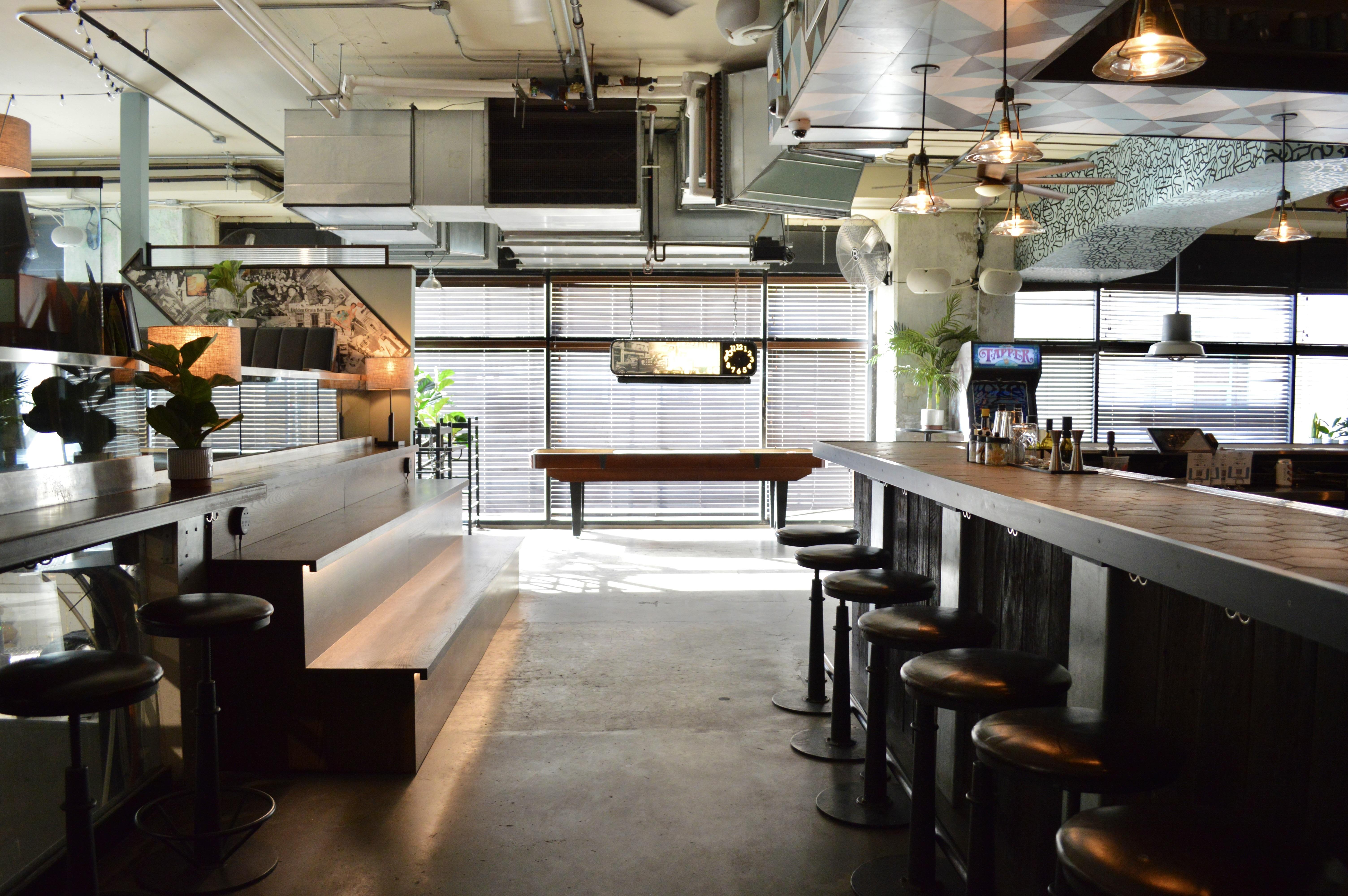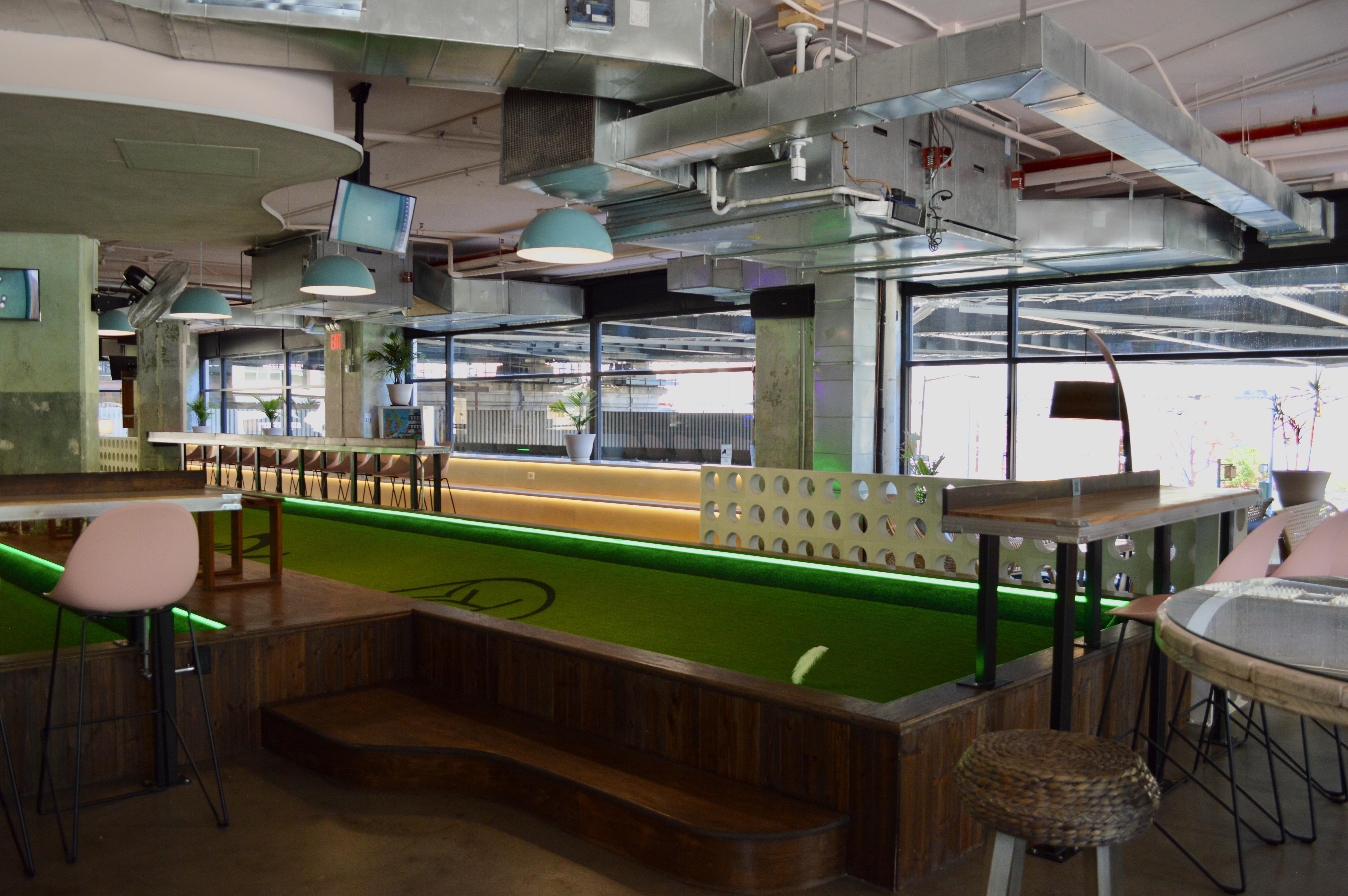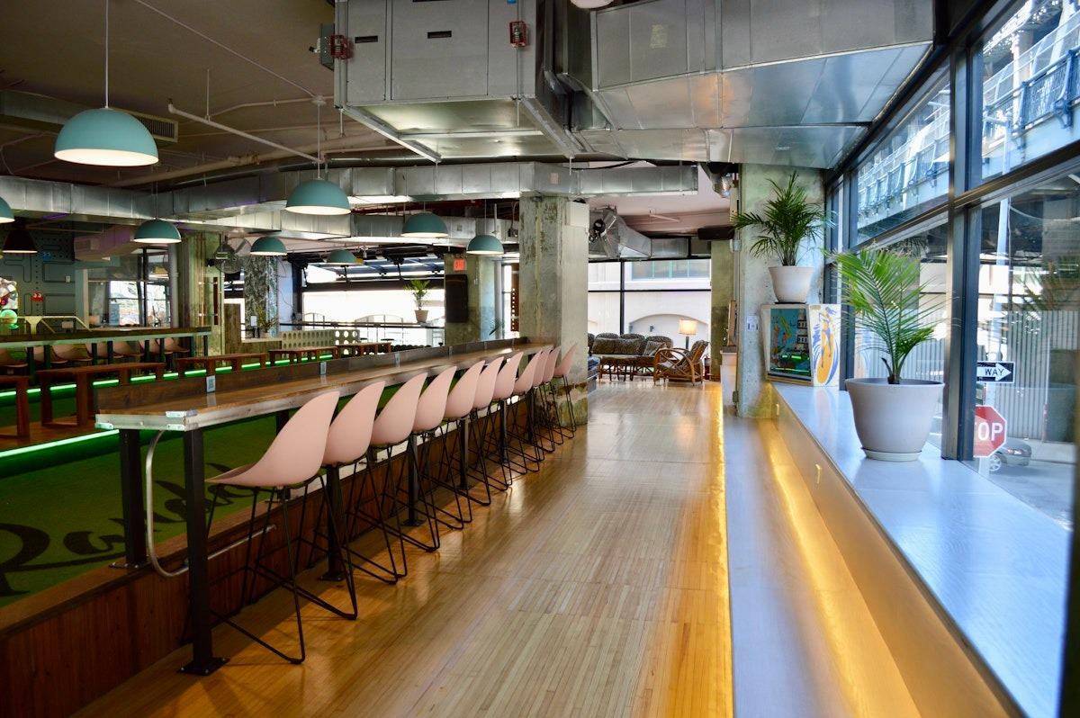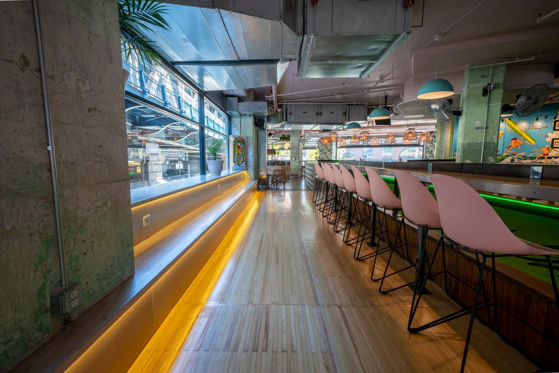 Super vibey section on the game room side with a private bar and lots of hi-top pub tables. Its also got two shuffleboard tables, a photo booth, projector screen, and floor-to-ceiling garage door windows, which open fully and look out at the Manhattan Bridge underpass and the Brooklyn Bridge entrance. GOOD FOR: Events that want the premium package and/or easy access to the feather bowling courts and other games.