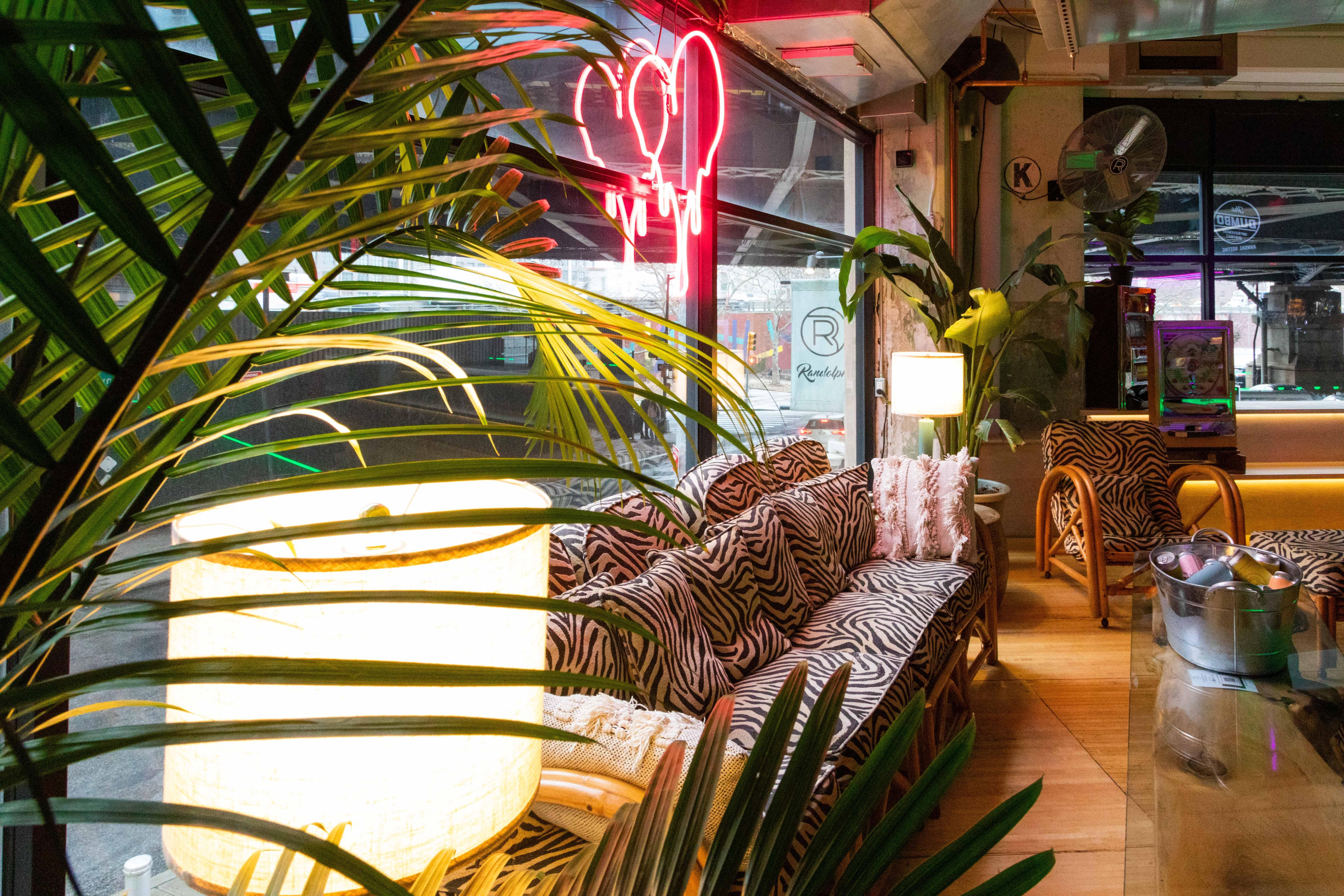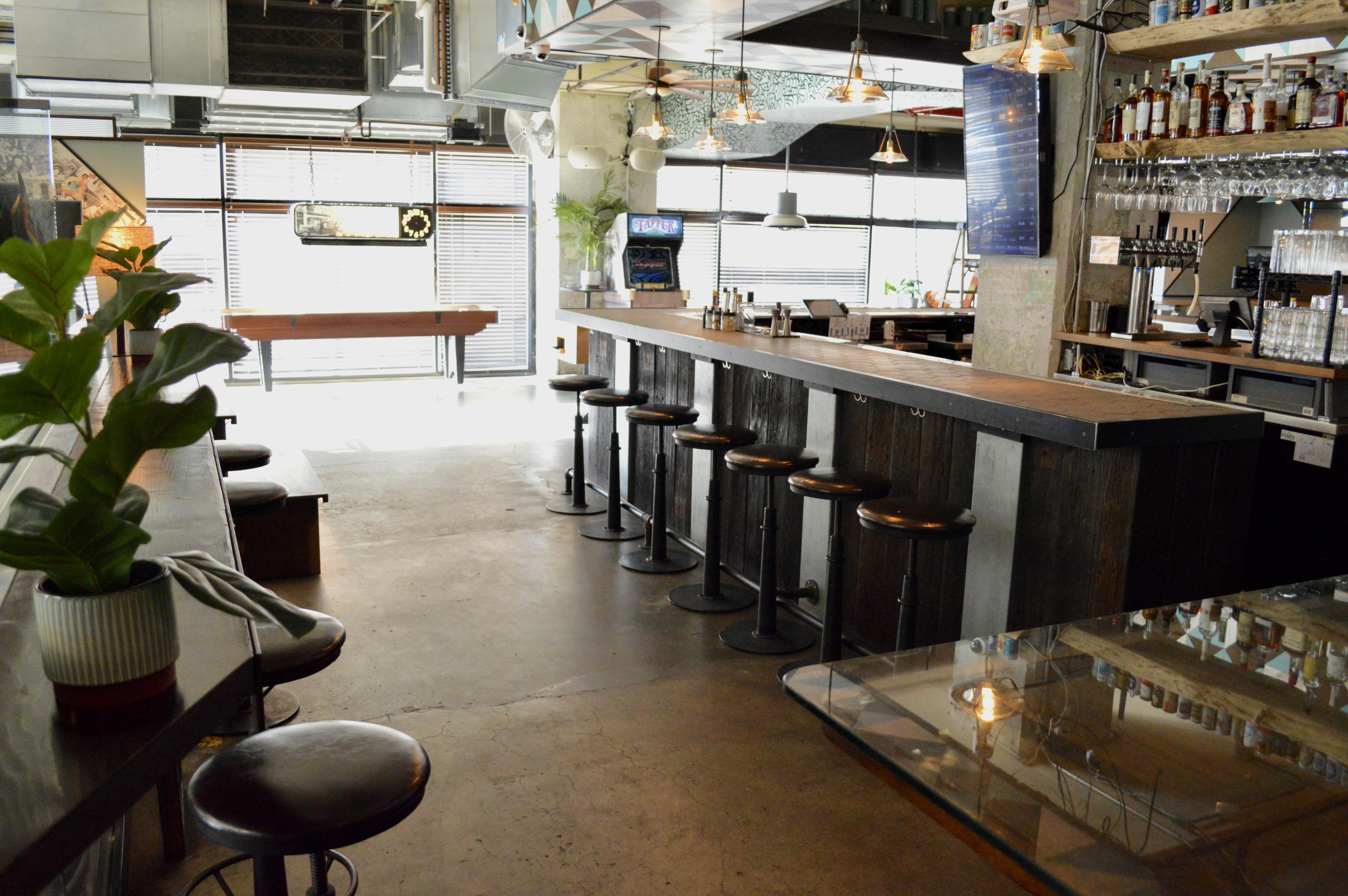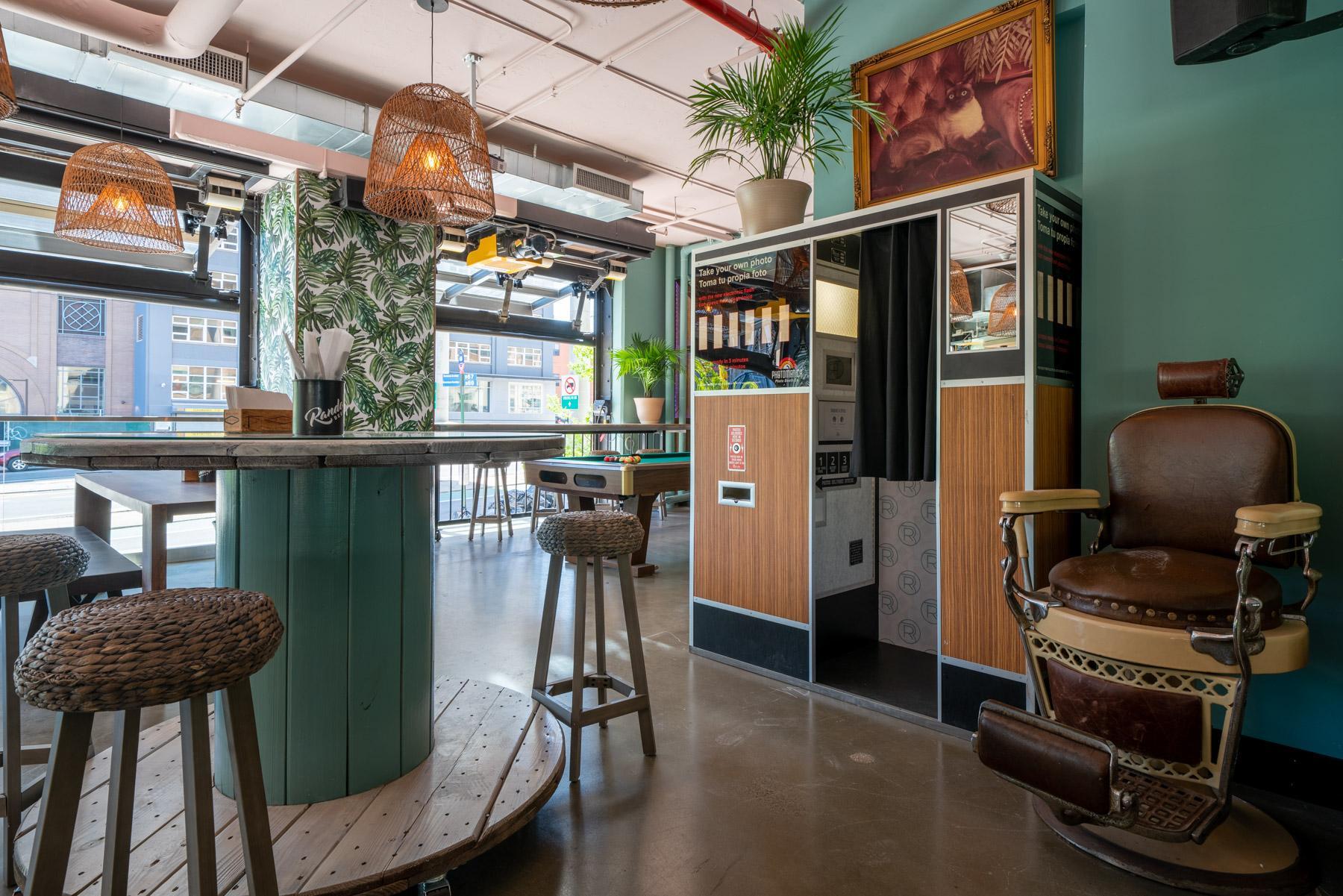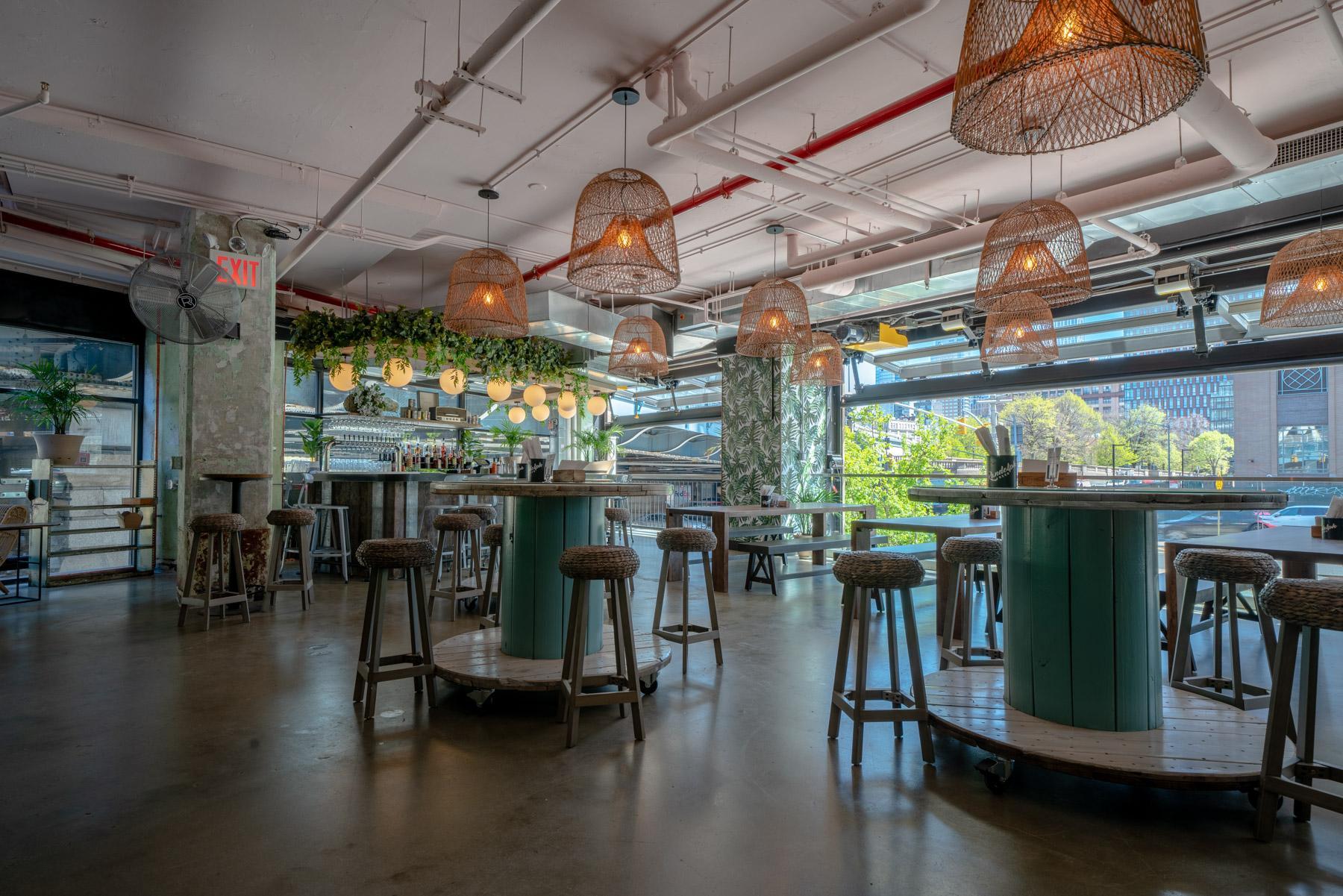 Super vibey section on the game room side with a private bar and lots of hi-top pub tables. Its also got two shuffleboard tables, a photo booth, projector screen, and floor-to-ceiling garage door windows, which open fully and look out at the Manhattan Bridge underpass and the Brooklyn Bridge entrance. GOOD FOR: Events that want the premium package and/or easy access to the feather bowling courts and other games.