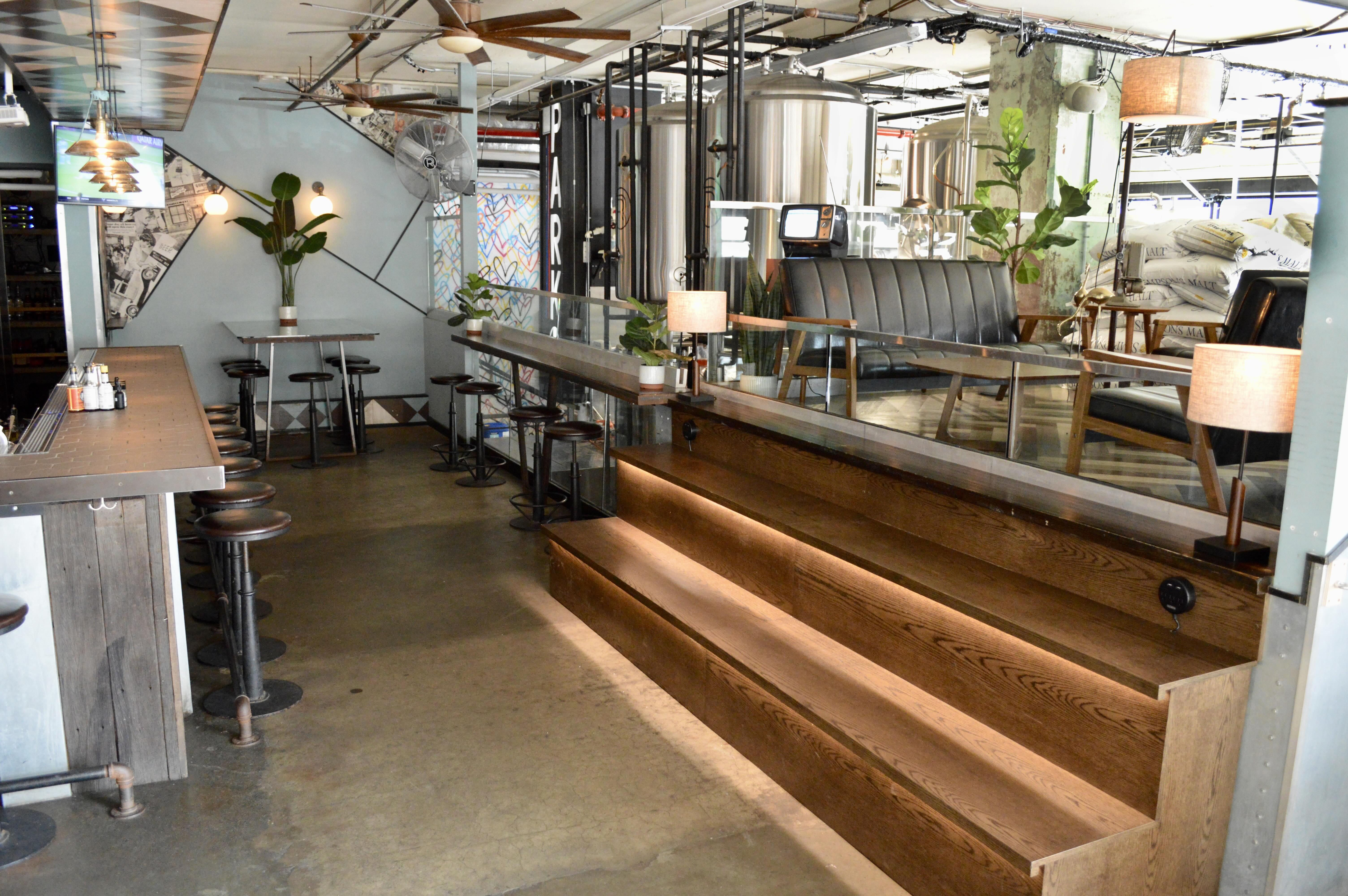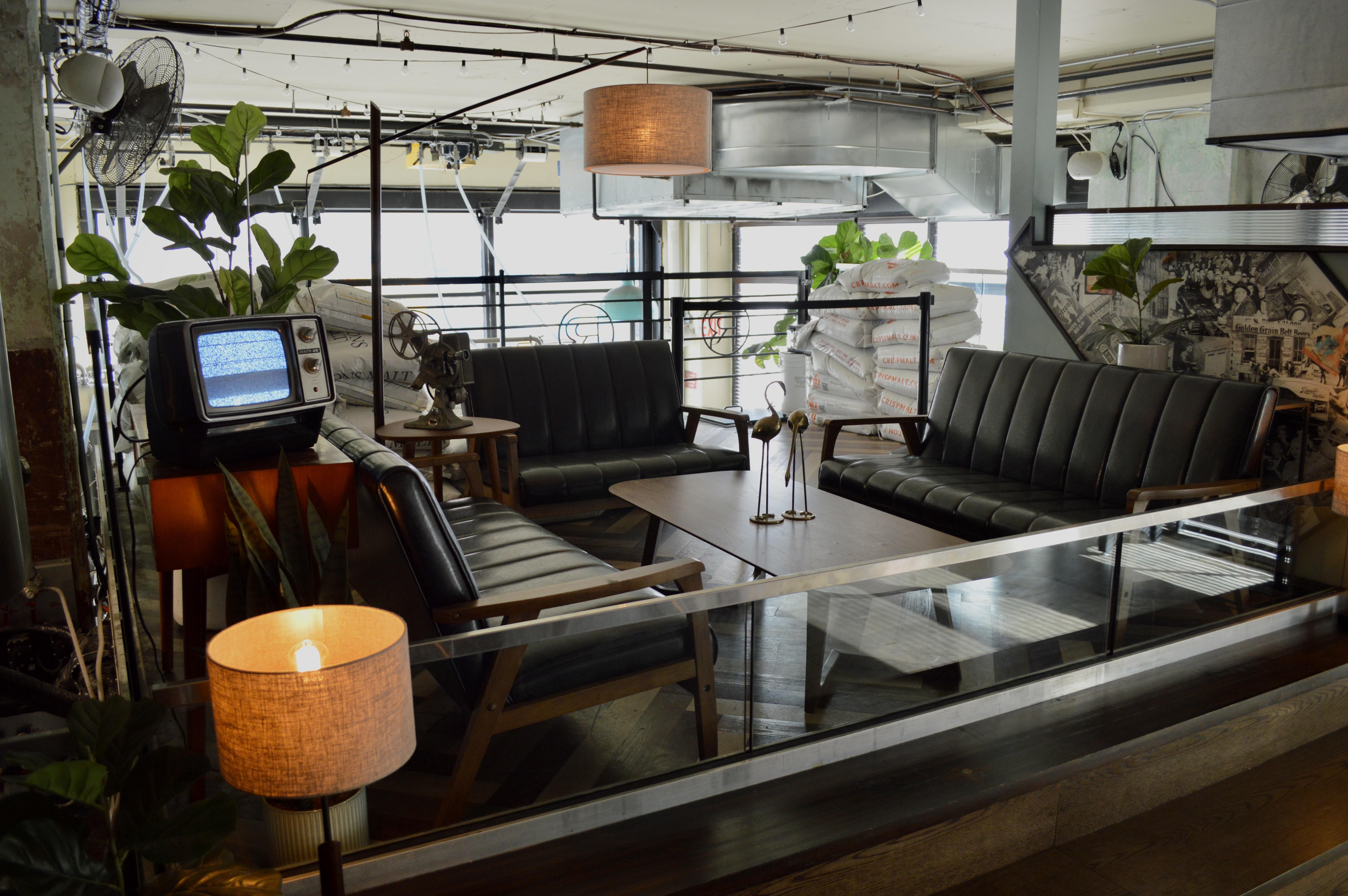 Large nook + adjoining mezzanine all overlooking the brewery. Includes one side of the main bar, some couches, 8-seater hi-top table, stadium bench + 1 dedicated TV GOOD FOR: Group that wants a home base in the brewpub from which one could literally touch brewery tanks (but please don't...) and/or is looking for that 'section of the bar' situation