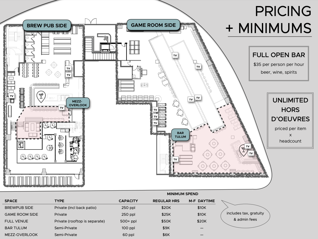 $9k minimum spend, all F&B purchases, tax, fees, tip contribute towards reaching the minimum.