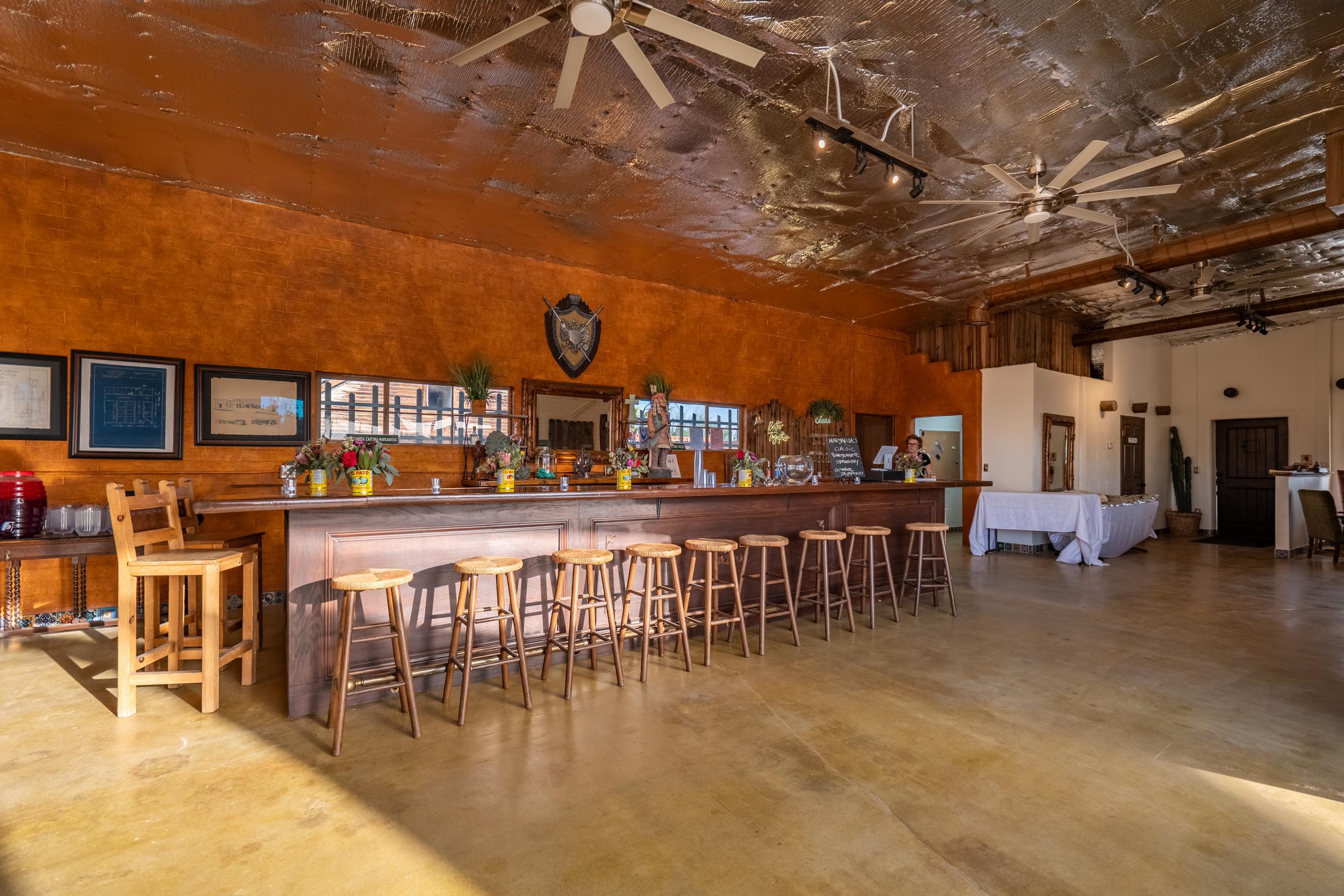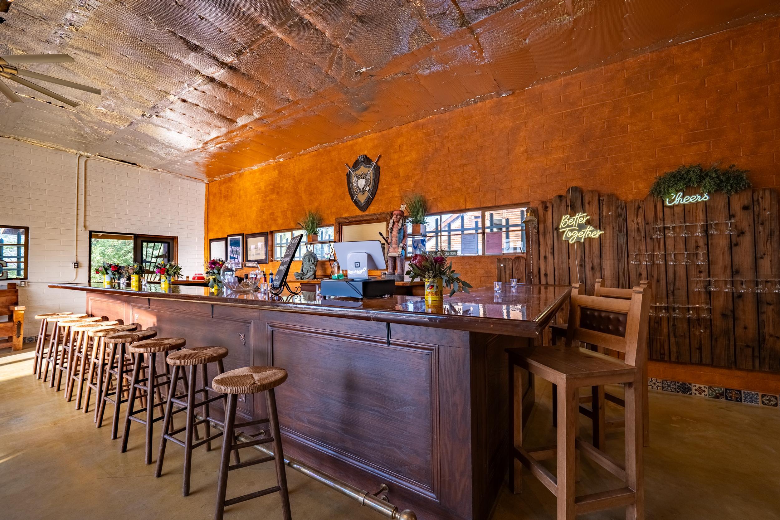 Alcohol Beverage Control (ABC) Full Liquor Licensed Facility Restrooms Styled lounge seating vignette Custom 12 foot hand carved bar Juliet balcony Roll up wall Padded Chairs and dining banquet tables 8x30 and 6x30 Bose bluetooth speaker system for playlists Bistro lighting Shade cloth for outdoor dining Drive up food truck space for service Health Department Approved Kitchen