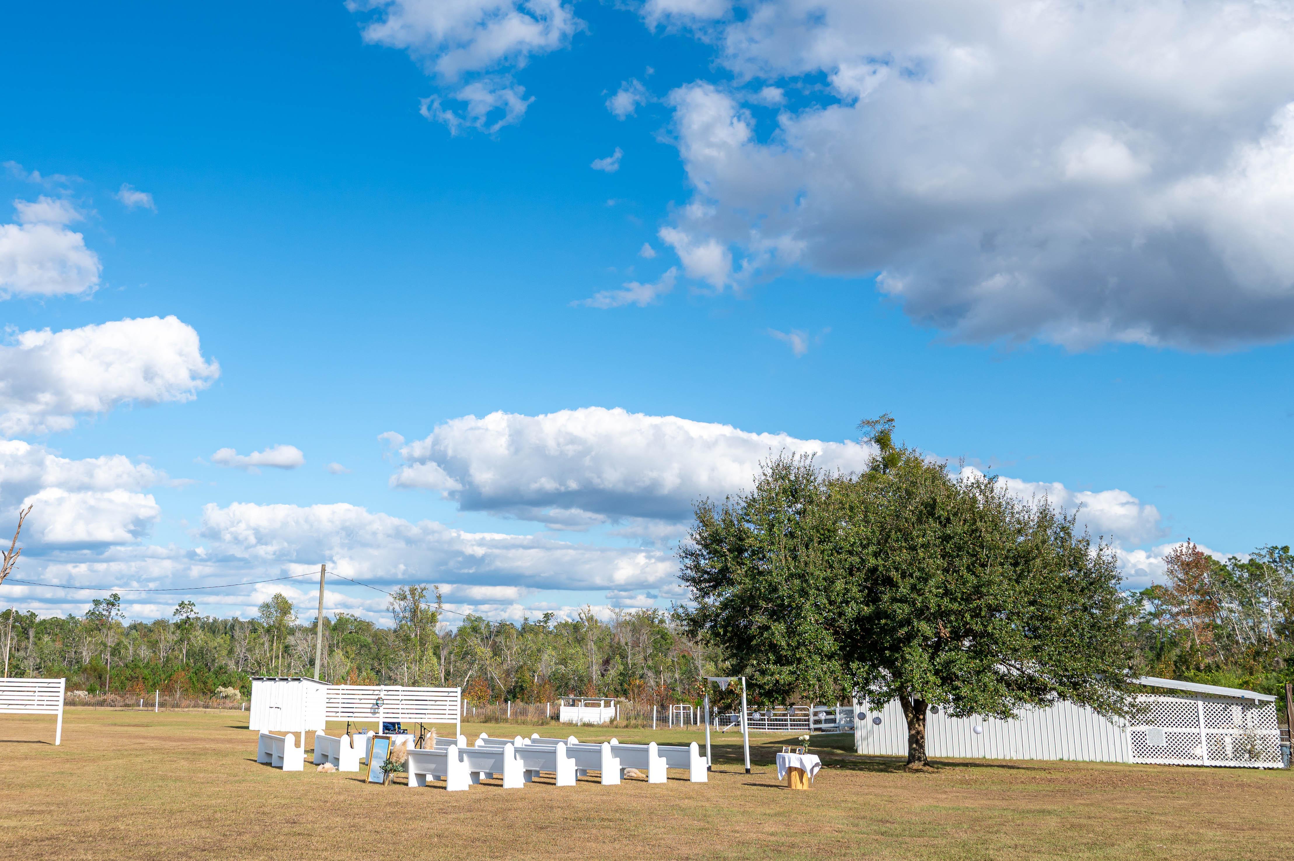 Nestled beneath a beautiful oak tree, this open-air ceremony space offers a peaceful, natural setting with wide views of the property. With room for guest seating, arbors, and personalized décor, it’s a timeless backdrop for heartfelt vows—simple, scenic, and effortlessly elegant.