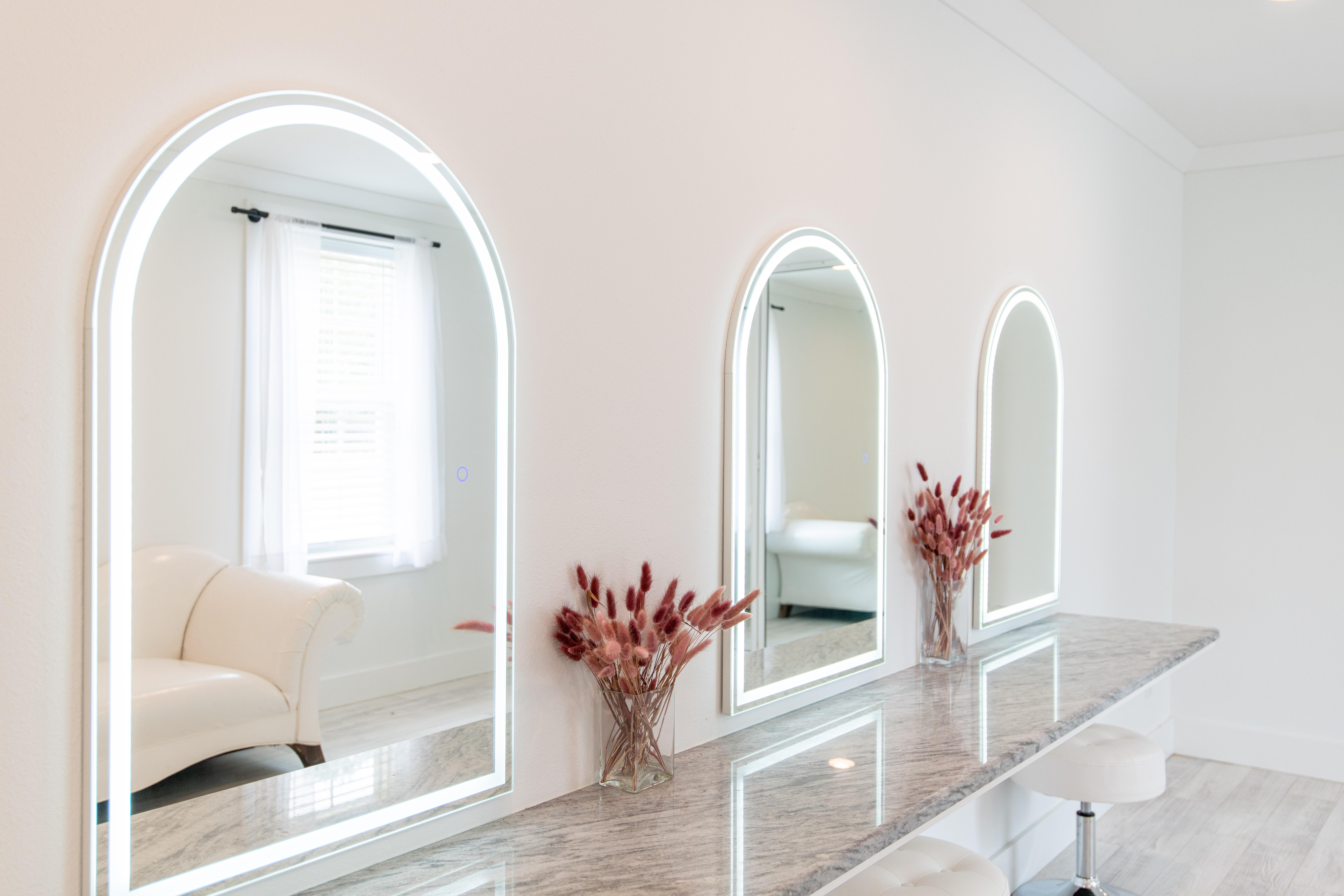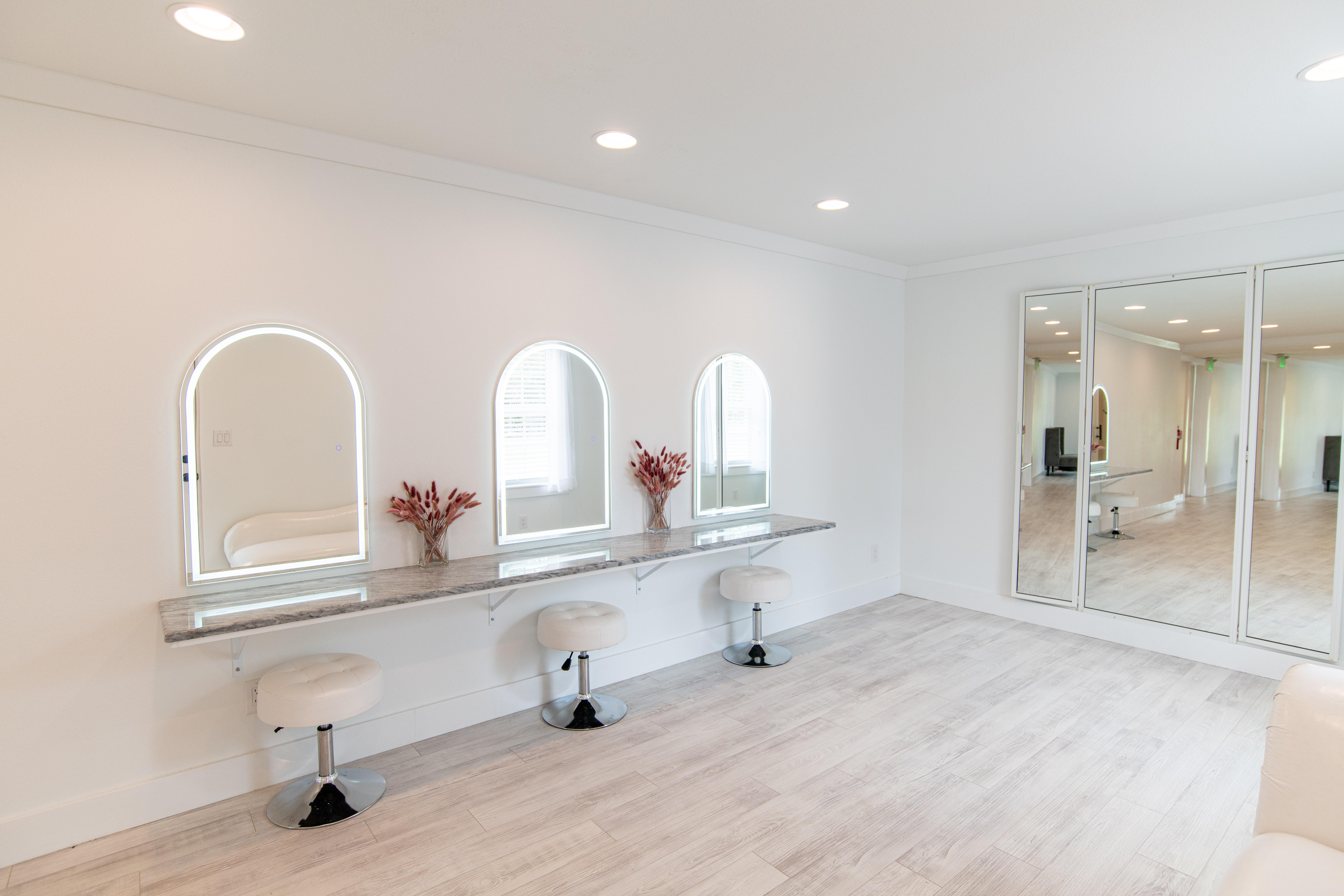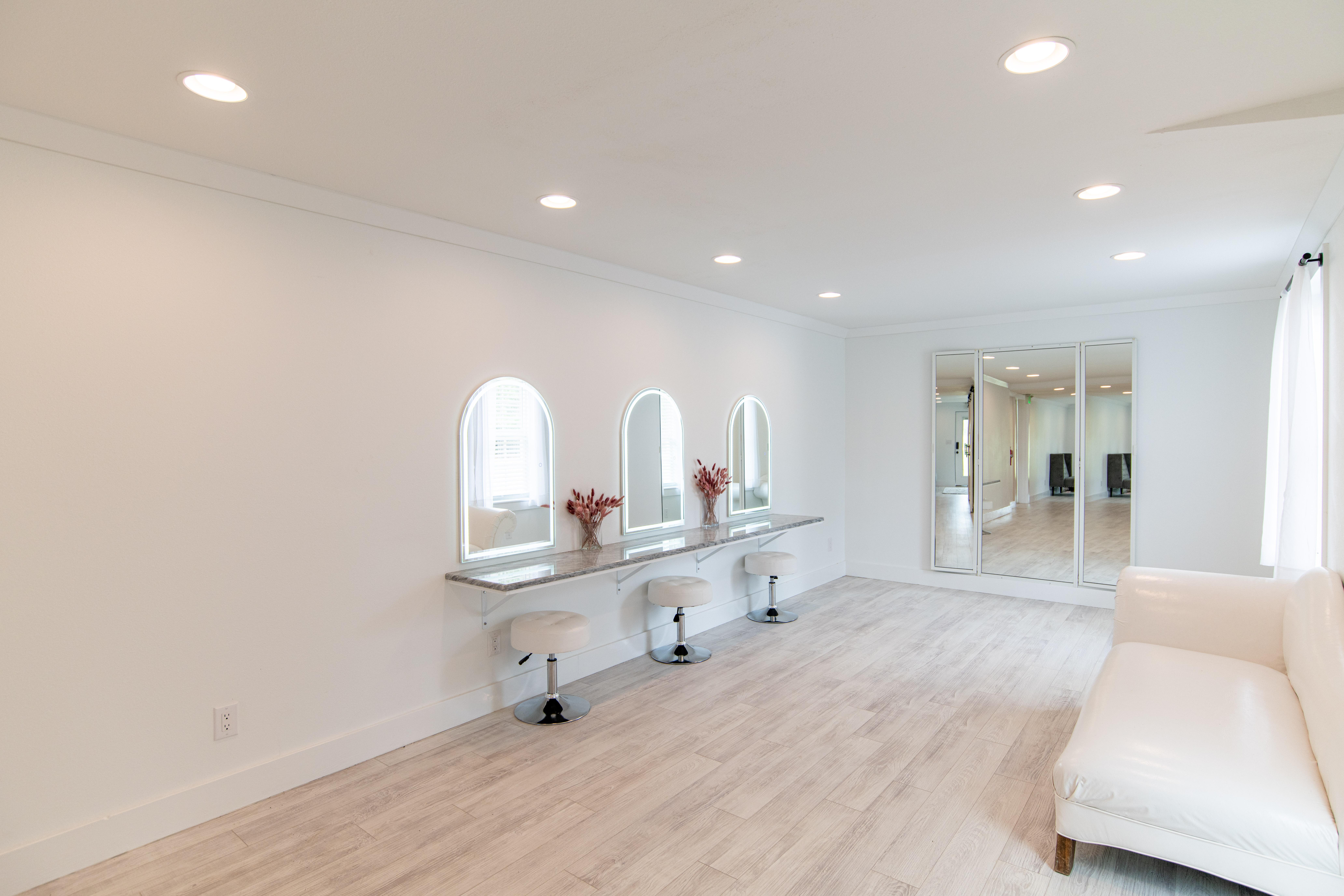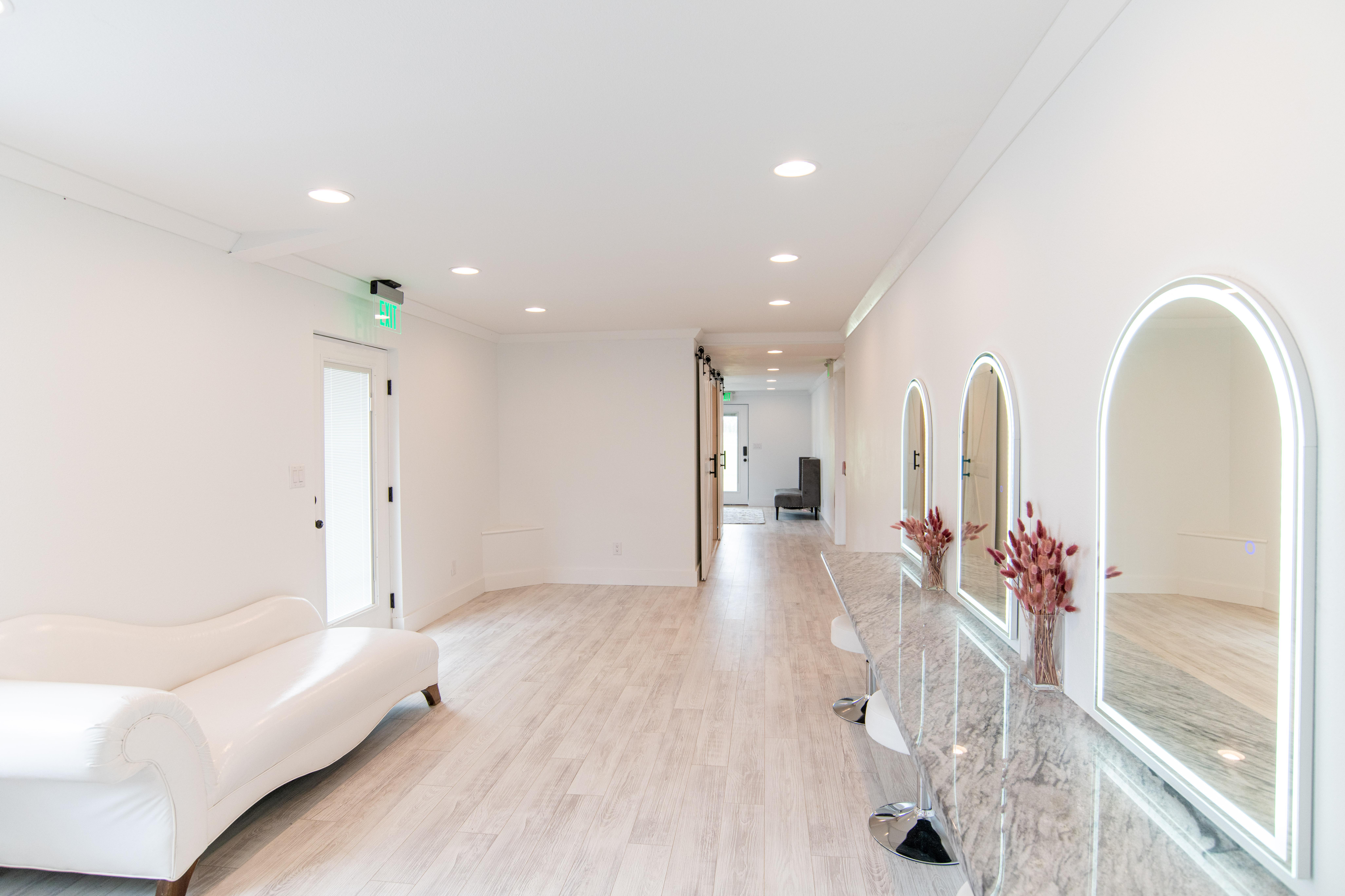 This space is roughly 255 square feet with 3 person vanity for hair and make-up, plus 2 bathrooms and access to the reception hall.