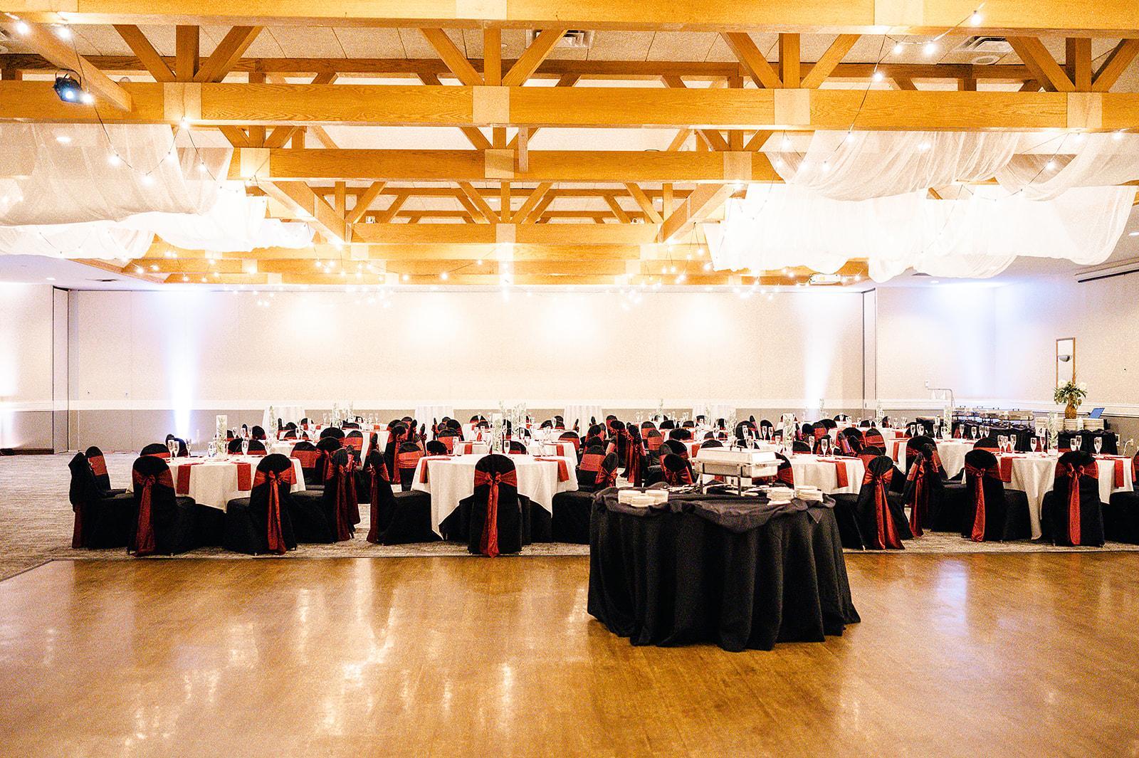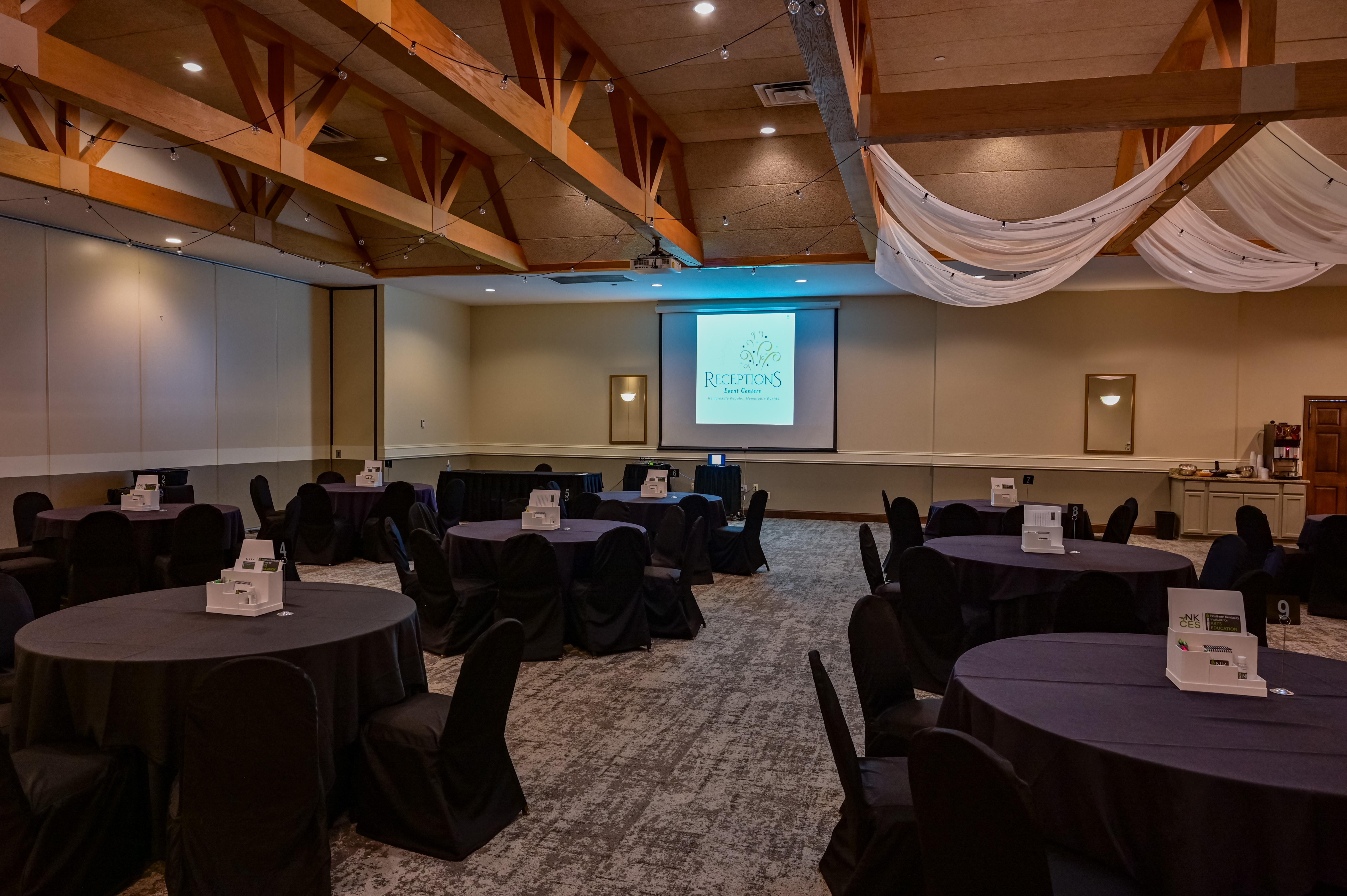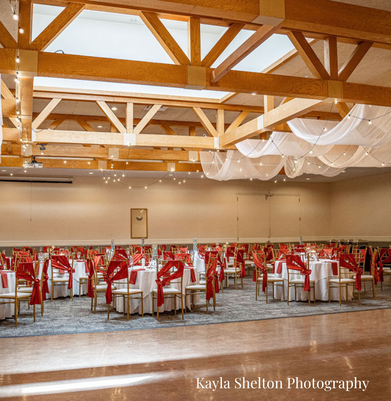 Kenton Room is our smallest banquet room, perfectly suited for smaller gatherings of up to 170 guests banquet style. It features a tall ceiling with wood beams, a skylight, a built-in bar, a dance floor, a projector, and a screen.