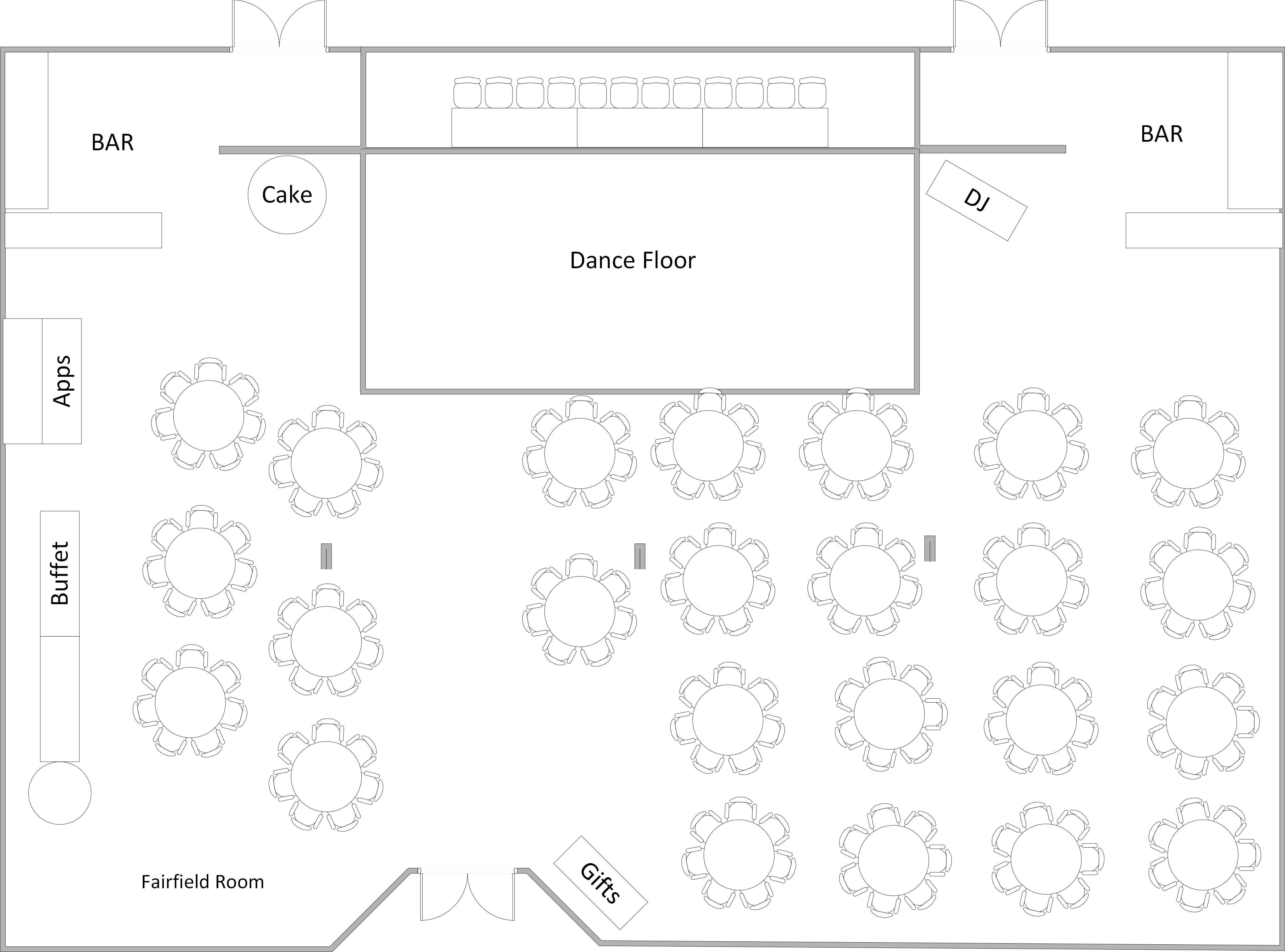 The Fairfield Room is our largest banquet room. We added it in 1995 as our company started to grow. It offers two built-in bars, a built-in dance floor, and a built-in stage and can seat up to 400 guests banquet-style.