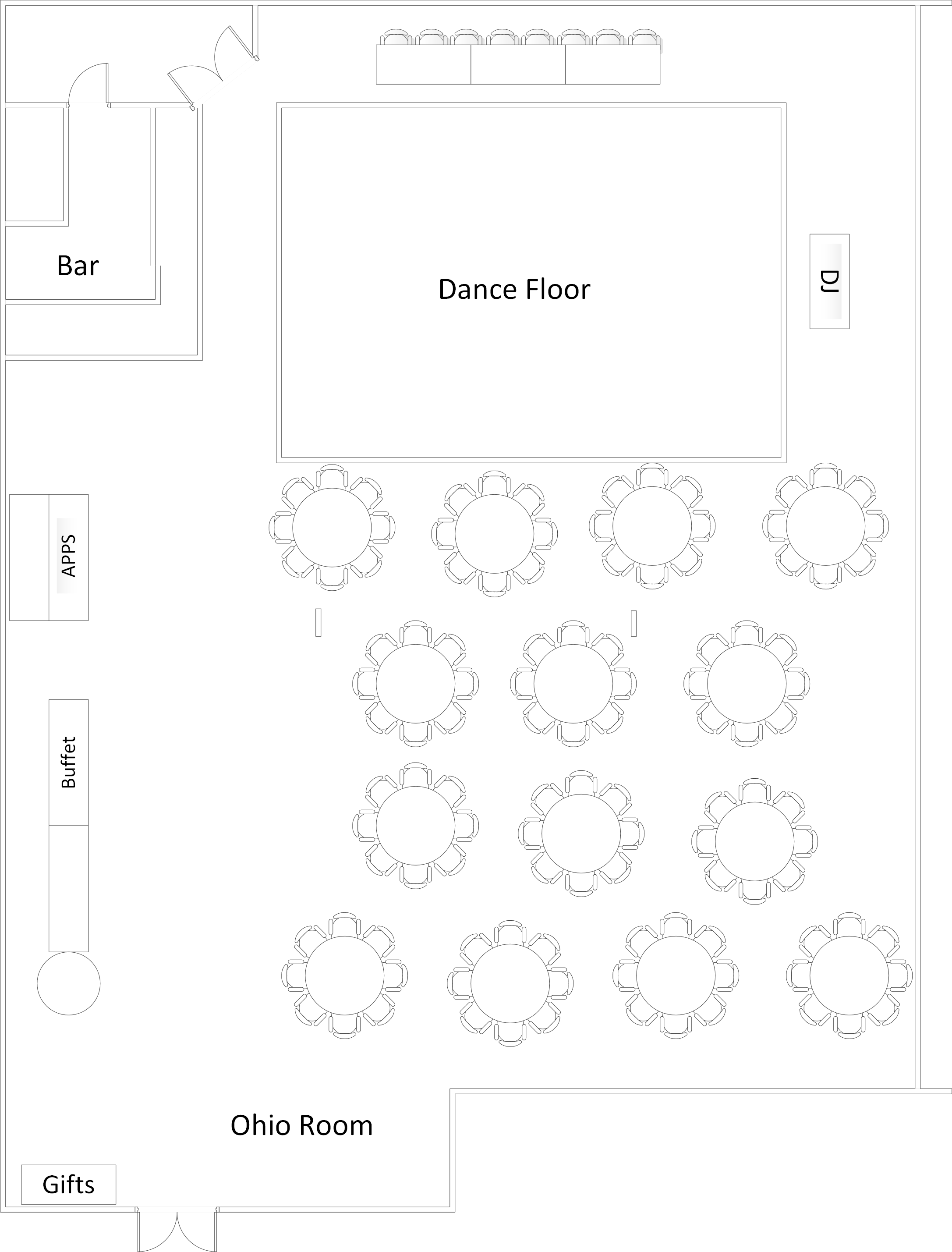The Ohio Room is the smallest of our three banquet rooms and can accommodate up to 200 guests. It offers one built-in bar and a dance floor.