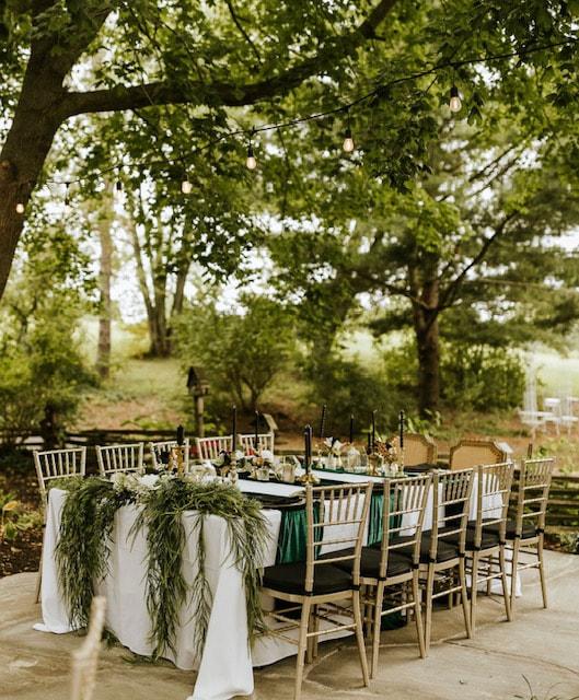 - All tables and chairs - White tablecloths - Runners and centerpieces - Ceremony and reception decor