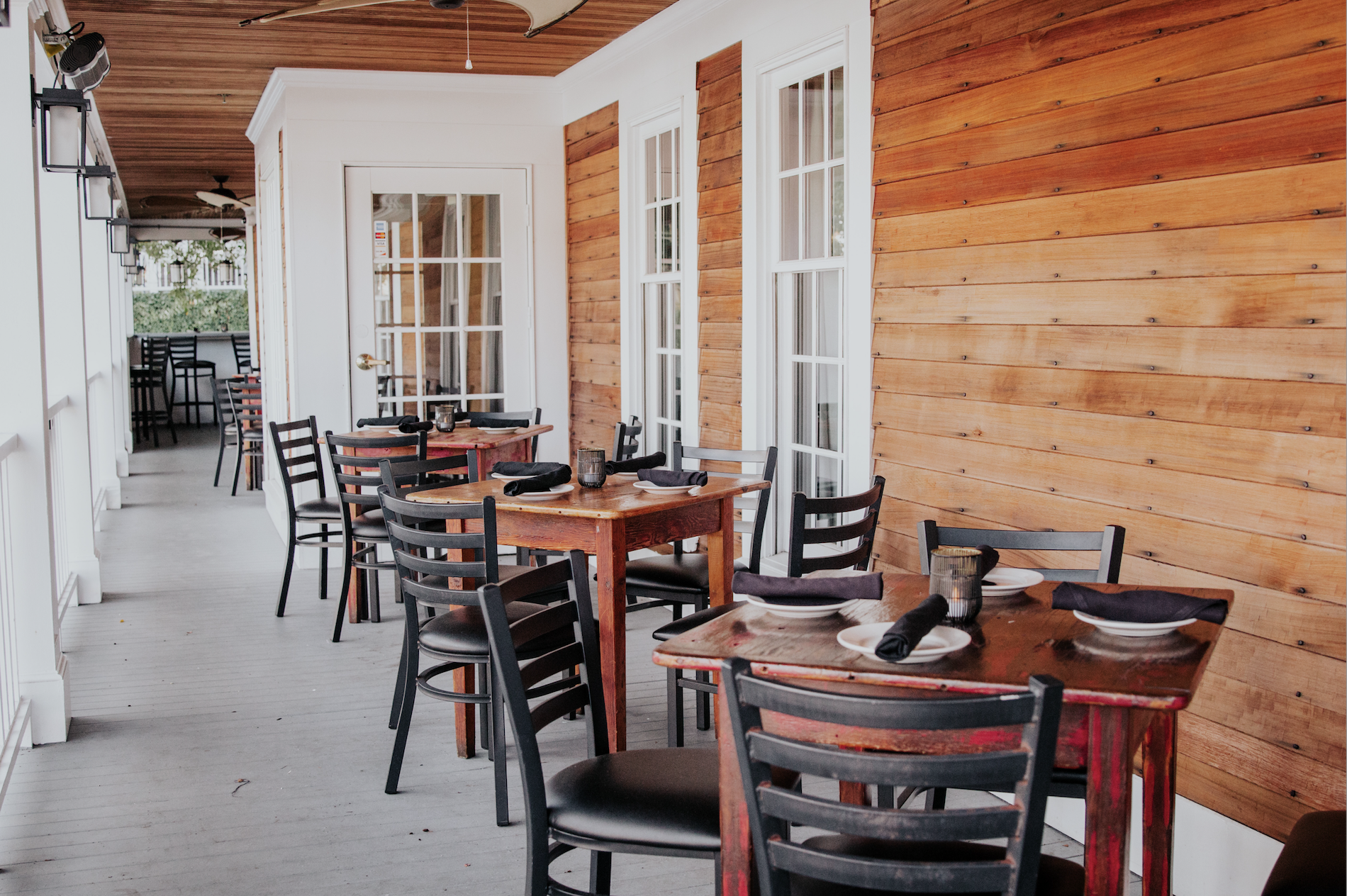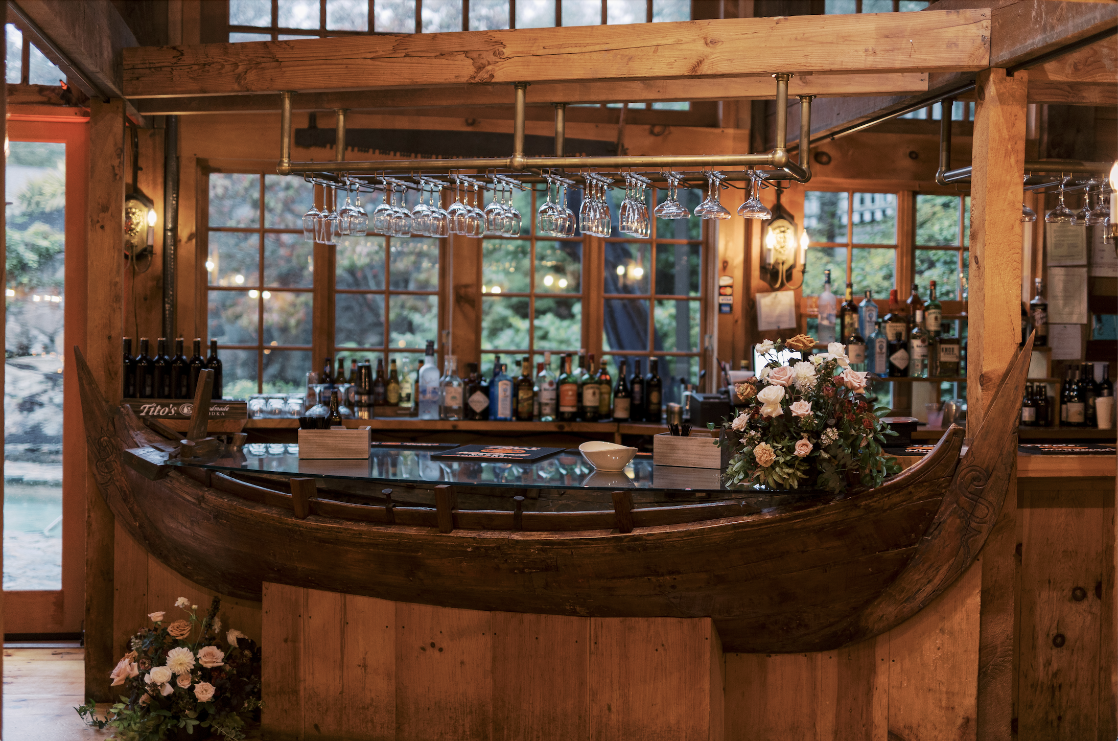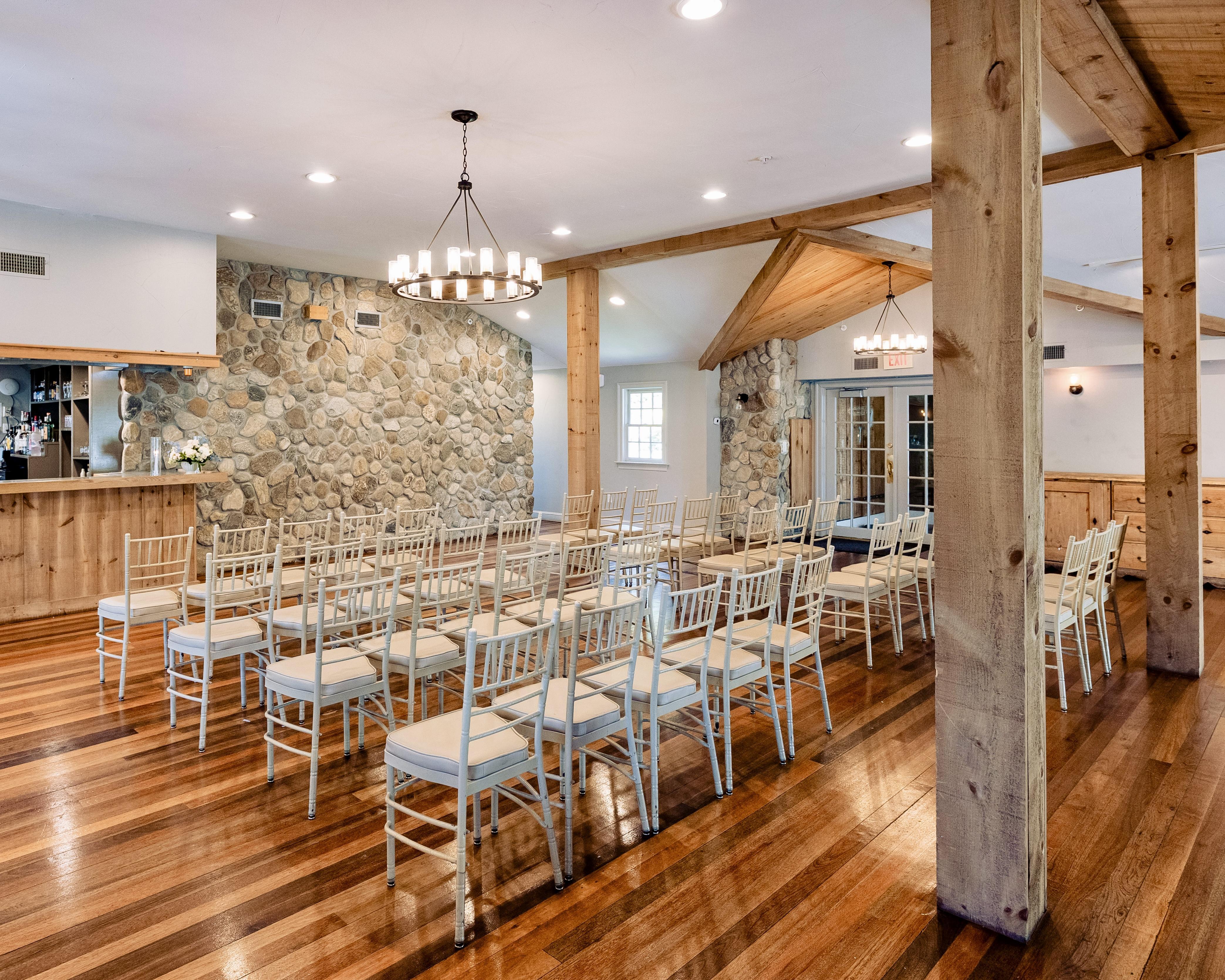 This wooden post beam Barn is the perfect space to host both ceremony and reception with a cocktail hour in the loft space. The loft holds its own two bars with wraparound bench seating fit to accommodate 170 standing guests or 80 seated guests. The main level hosts the boat bar, ample dancing space and seating for 170 guests. The Barn allows access to our picturesque garden and pool patio perfect for photo taking.