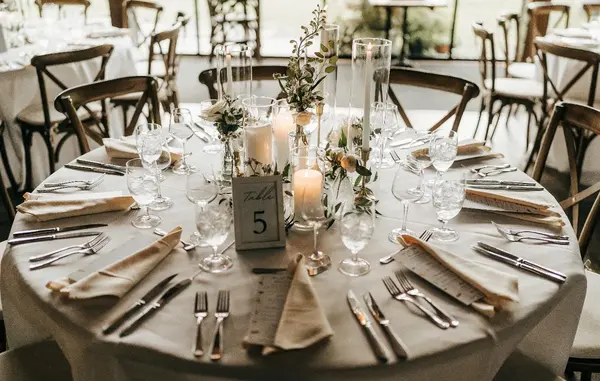 Included are all round tables, solid color linens, white folding chairs, cutlery, glassware