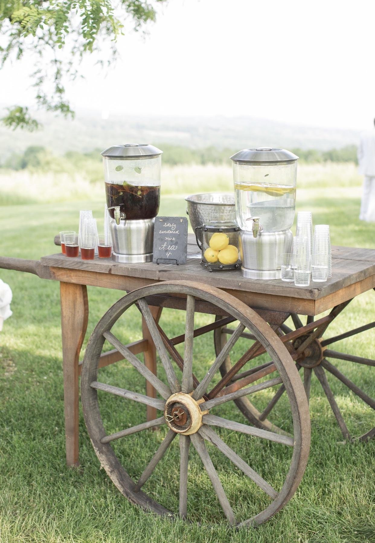 Included are all white folding chairs, 2 wine barrels lining the aisle, wagon with non-alcoholic refreshments served before the ceremony, ceremony arch, VIP area for bridal party for before the processional begins