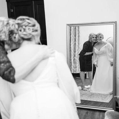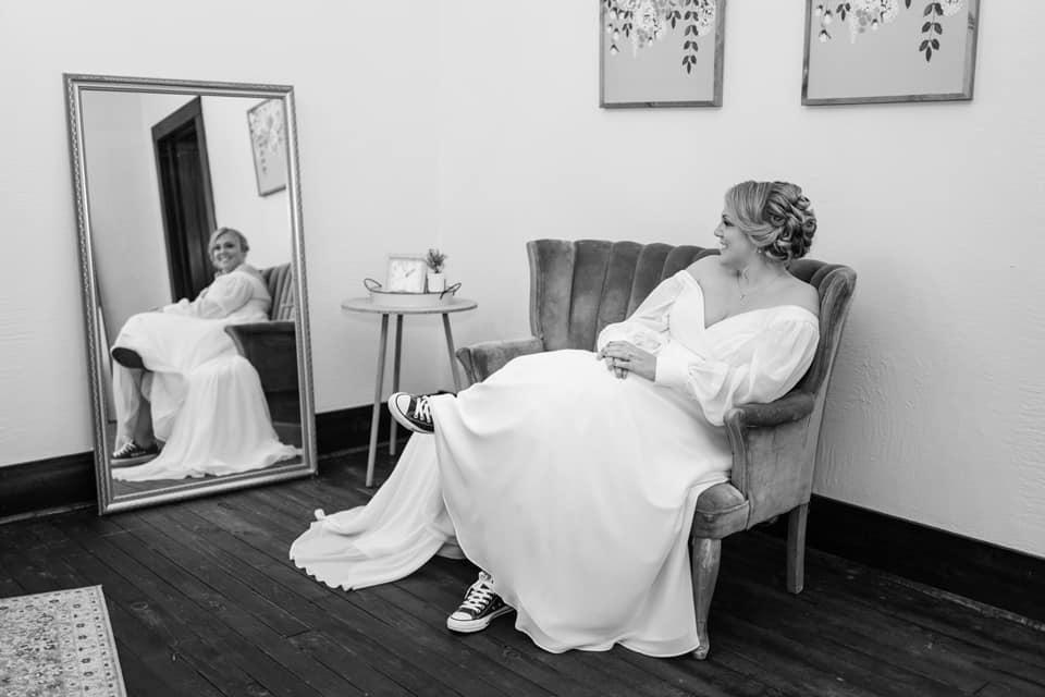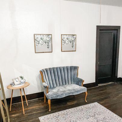 This space houses a restroom and has ample room for all your bridesmaids. The room has floor length mirrors, vanities, and an aesthetically pleasing chair for photos!