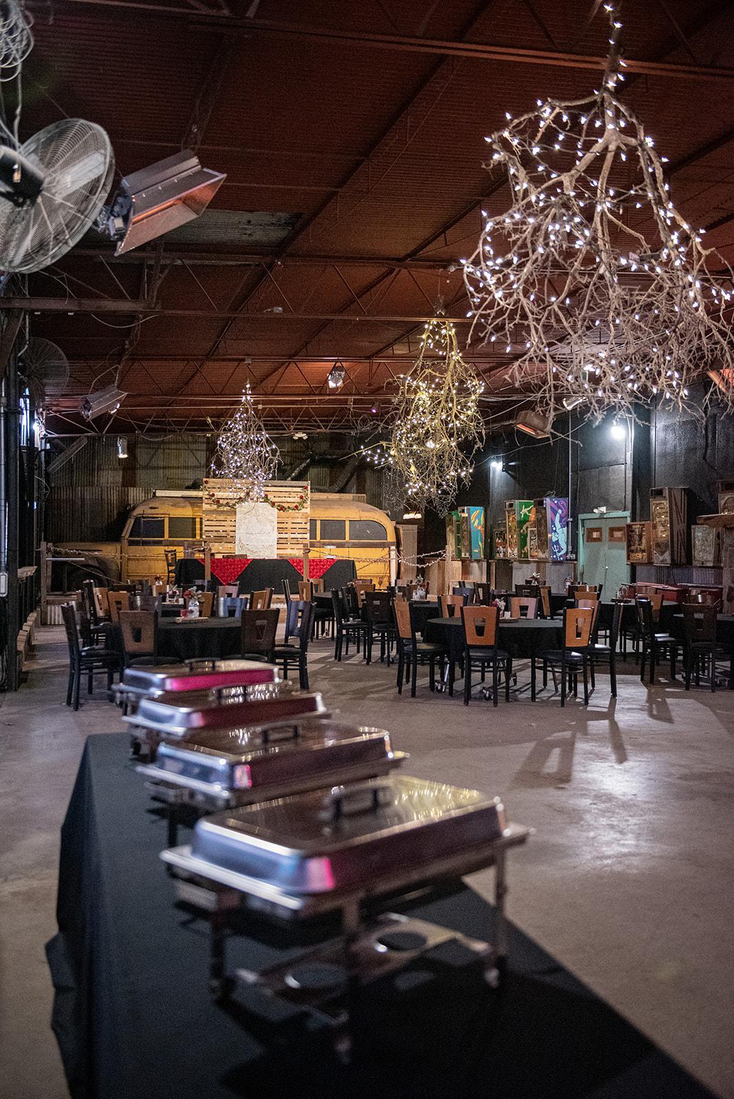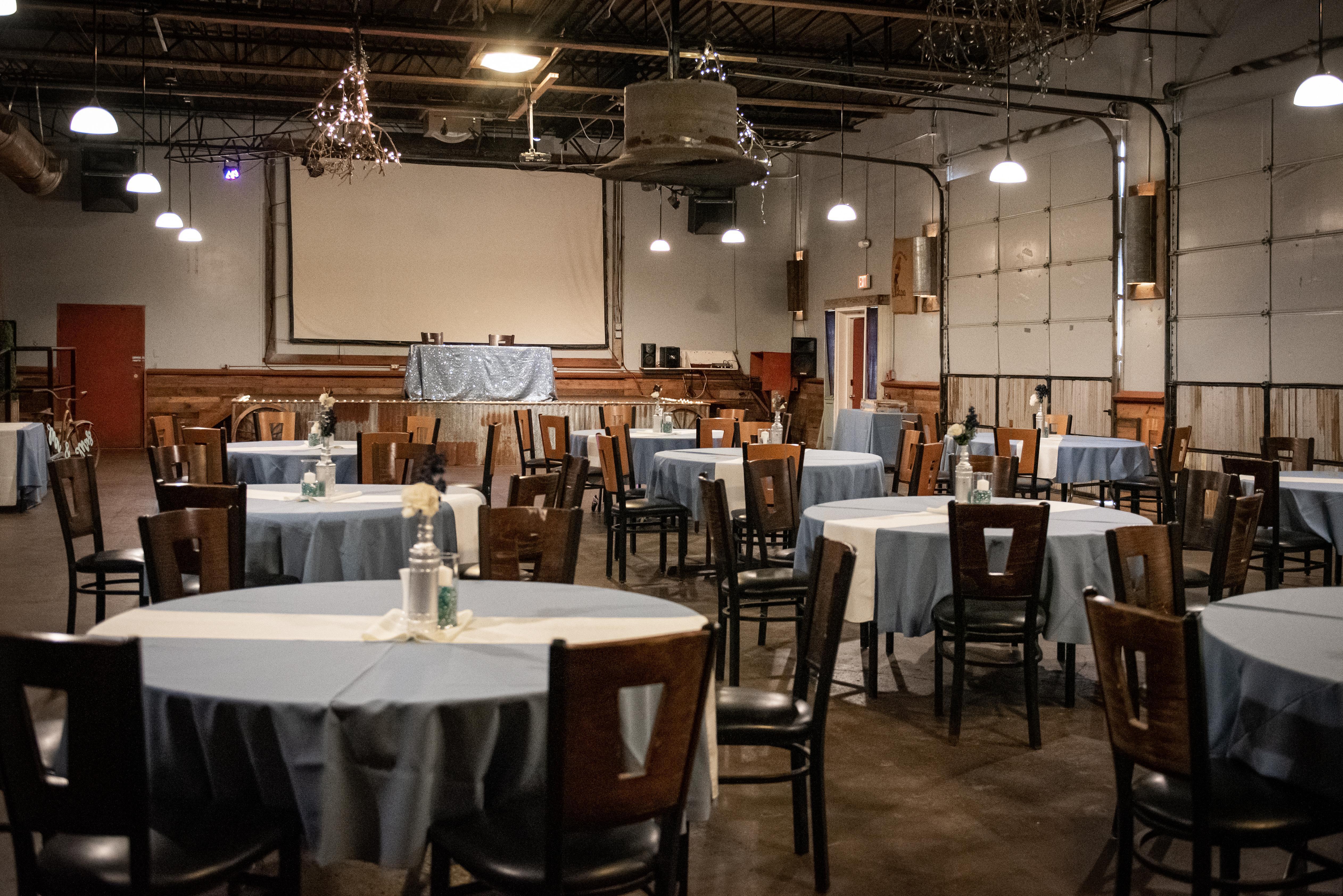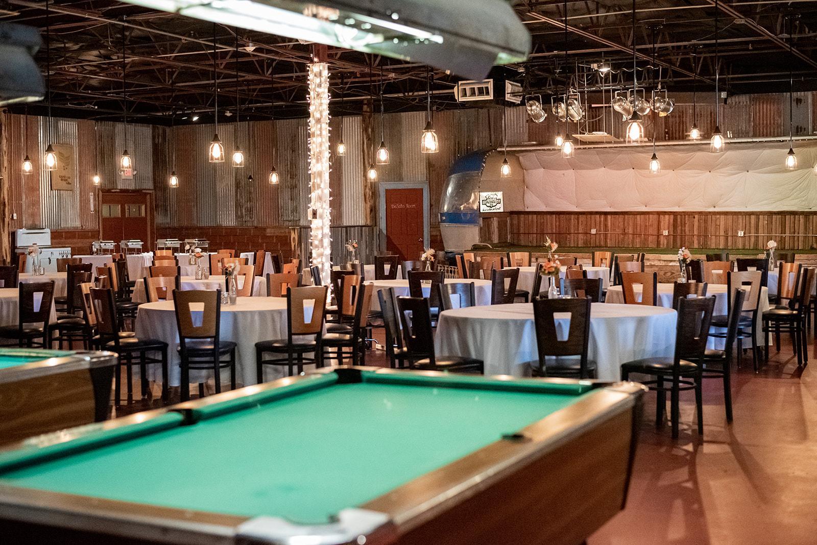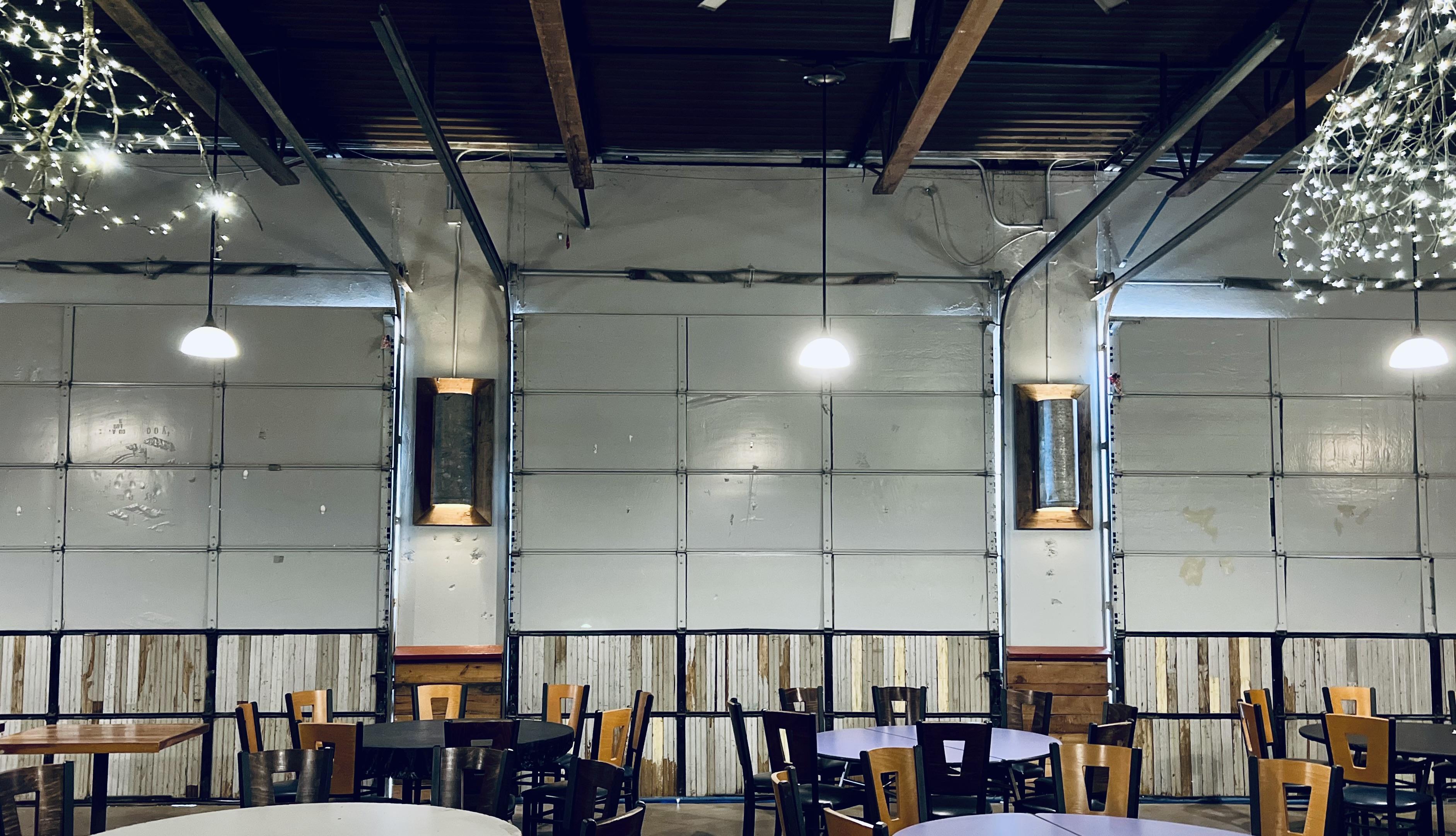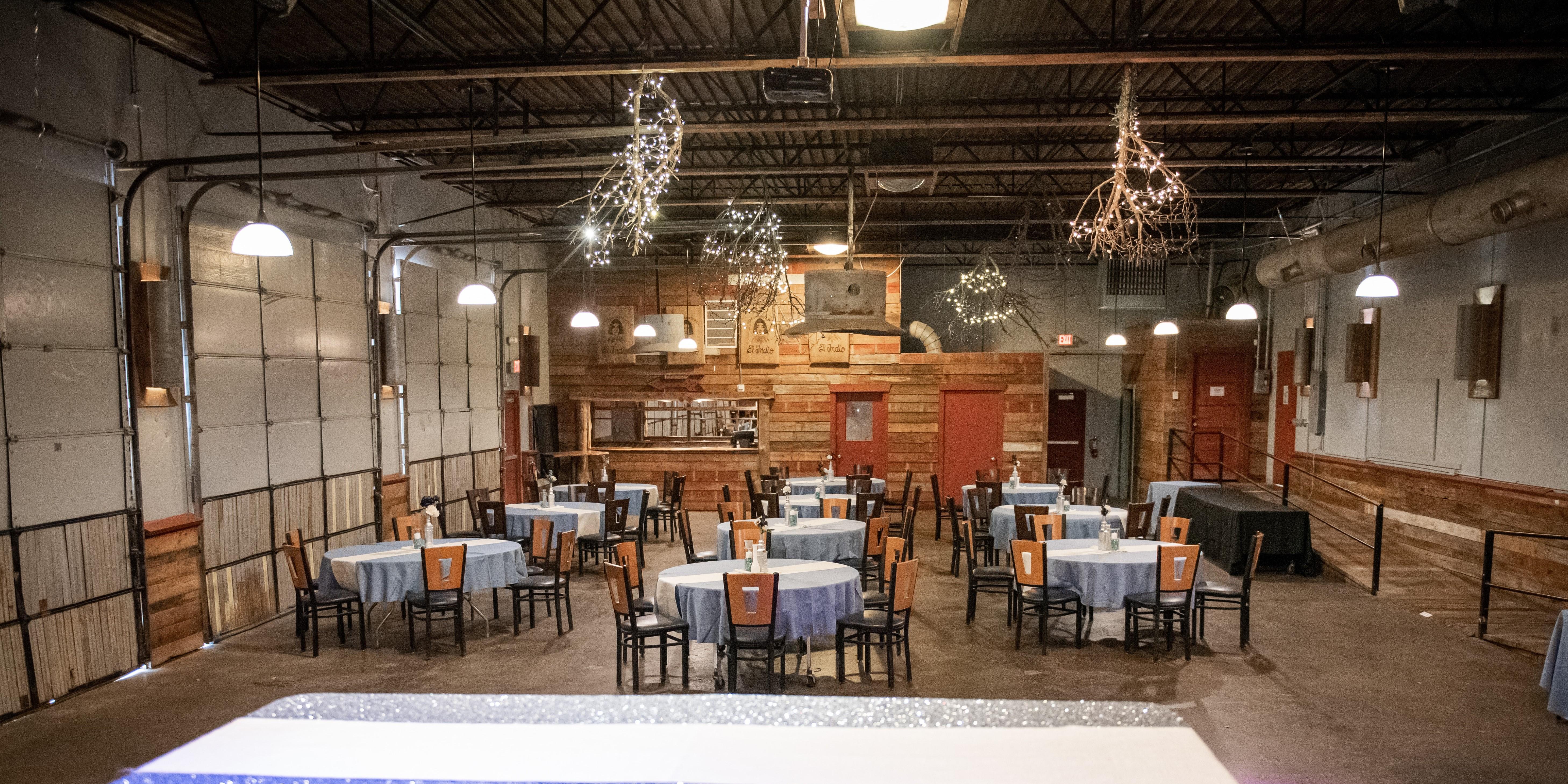 With three industrial sized garage doors the perfect shade of grey, these functional doors can open and close to create a funky indoor/outdoor space (weather permitting.) The Garage also has a private bar and an elevated stage for your favorite band to play your favorite tunes.