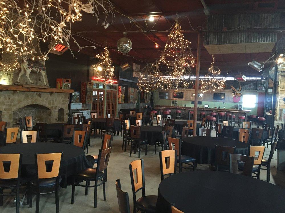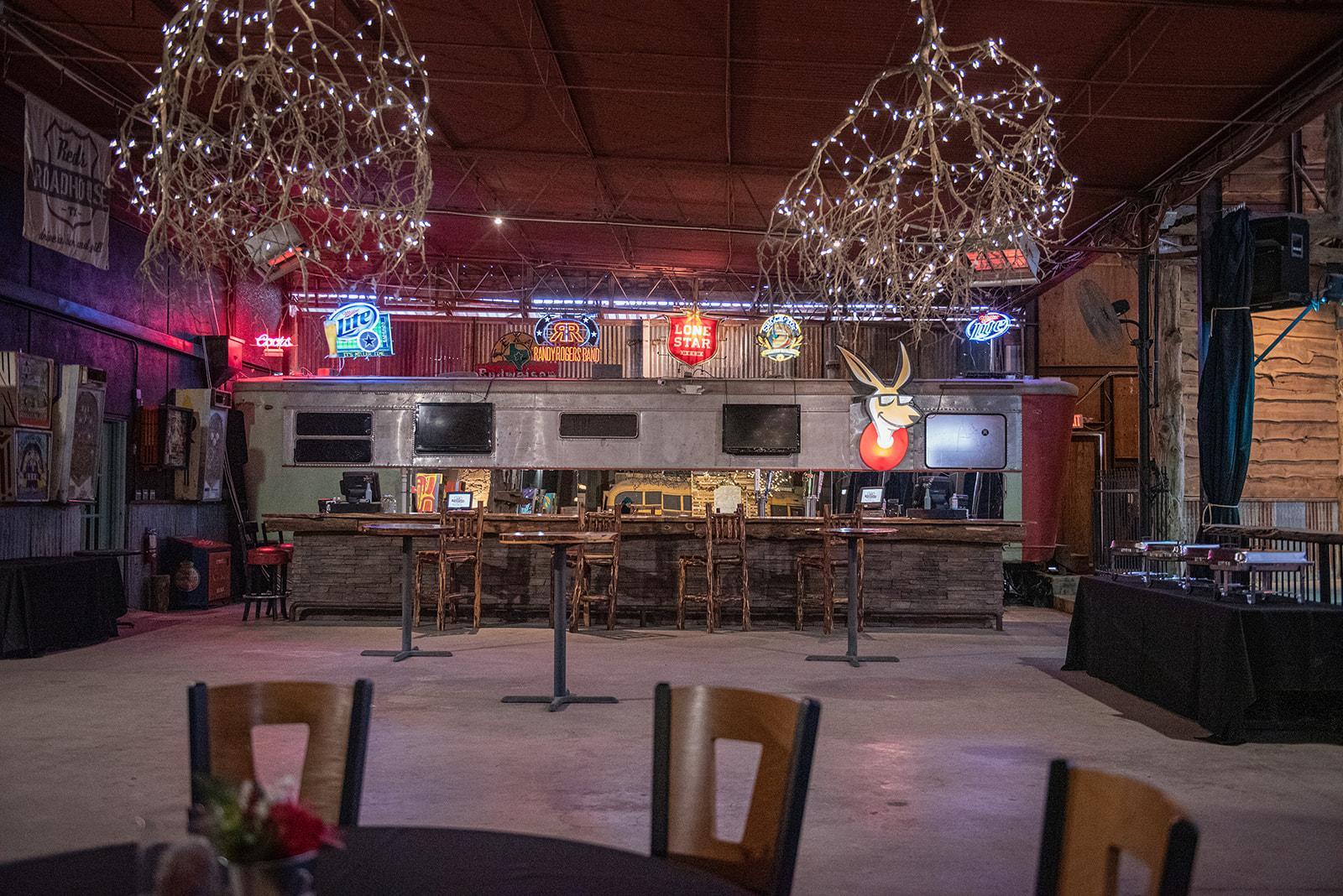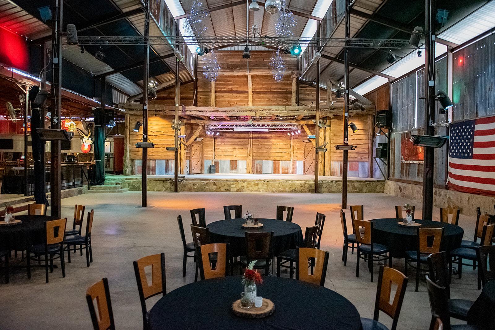 Throwing a big old fashion party with lots of guests? Our patio is your party place. This spacious Texas-sized covered patio is multi-level and has its own 30′ bar, a two-story cedar log stage perfect for a band or ceremony site, a 2,000 square foot dance floor, and a towering stone fireplace. The entire patio can accommodate up to 400 seated guests