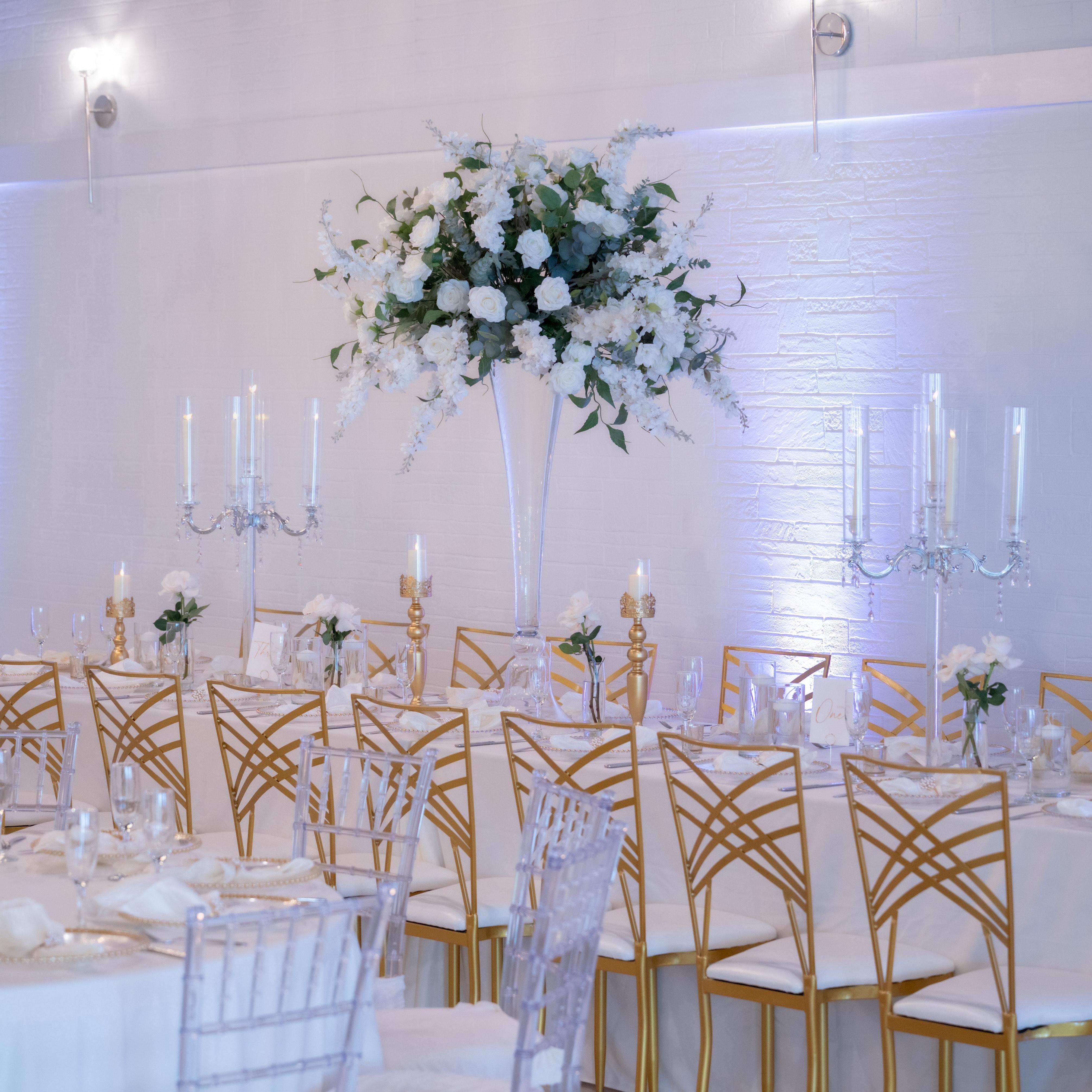 Dimmable chandeliers White Brick wall accent White marble floors premium seating ( Ghost and Chiavari chairs)