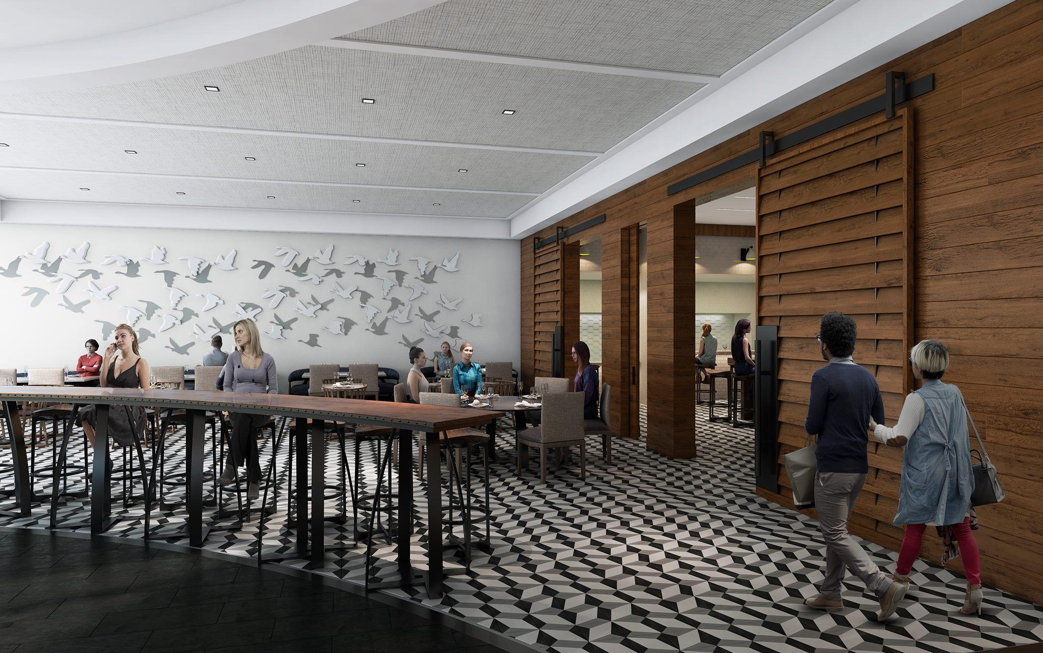 This space features 2,400 square feet of indoor space, with diamond shaped lighting fixtures, and two mounted projectors.