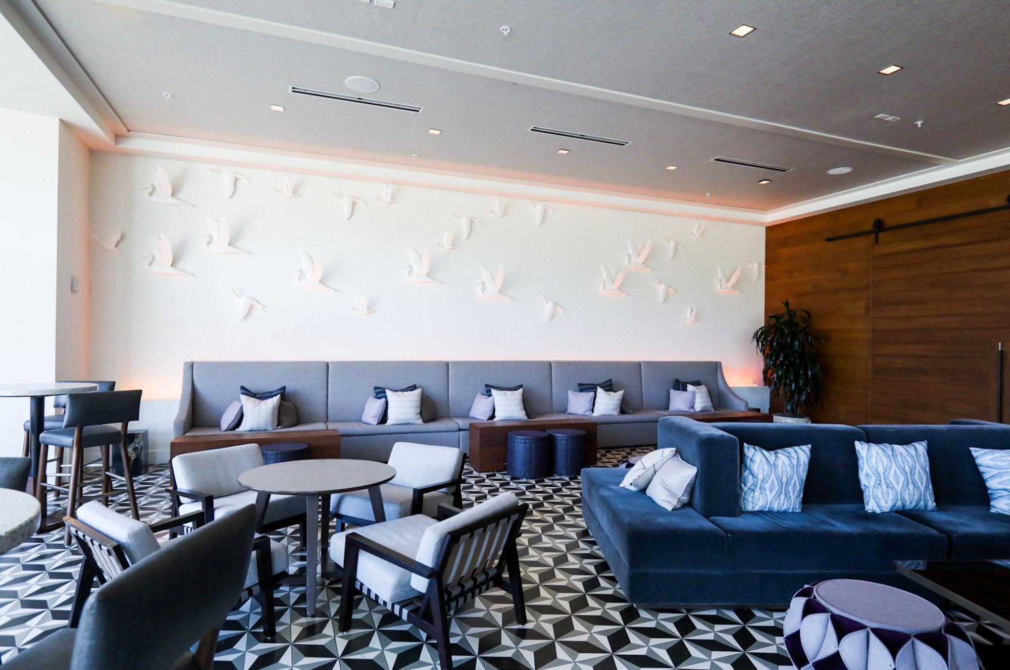 This space is semi-private and features pre-set lounge furniture located adjacent to the hotel bar.