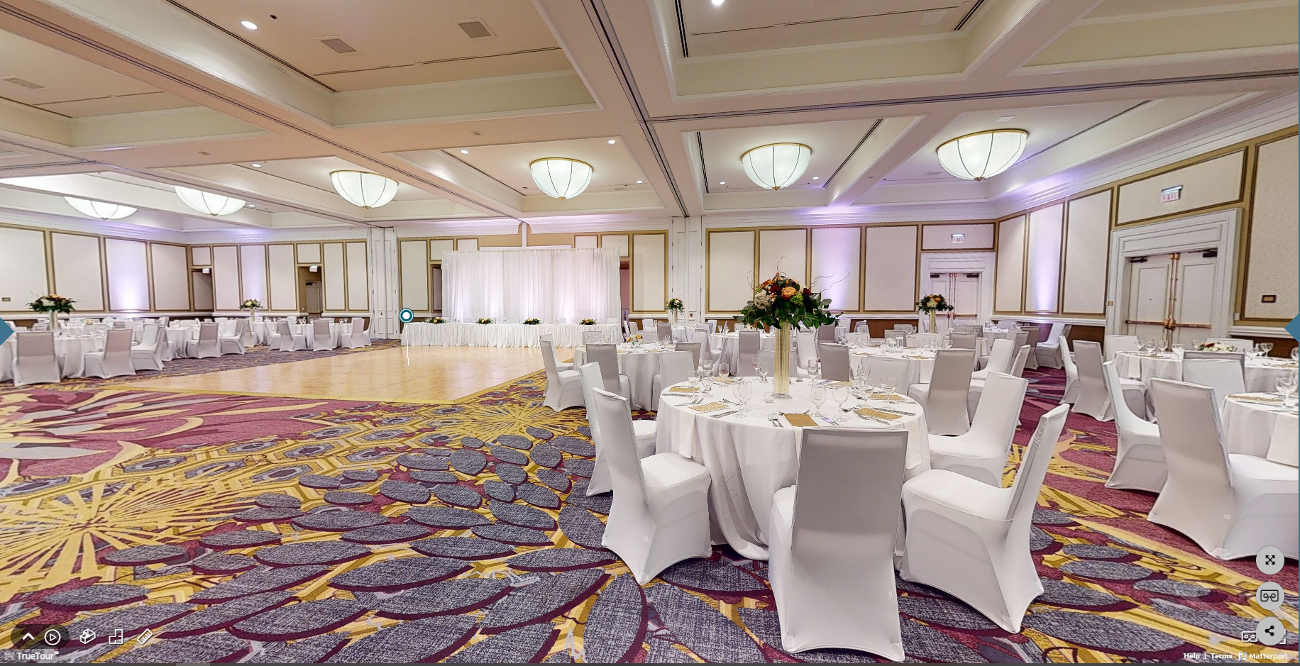 Its modern, minimalist design, custom uplighting, and contemporary chandeliers can accommodate a variety of wedding themes.