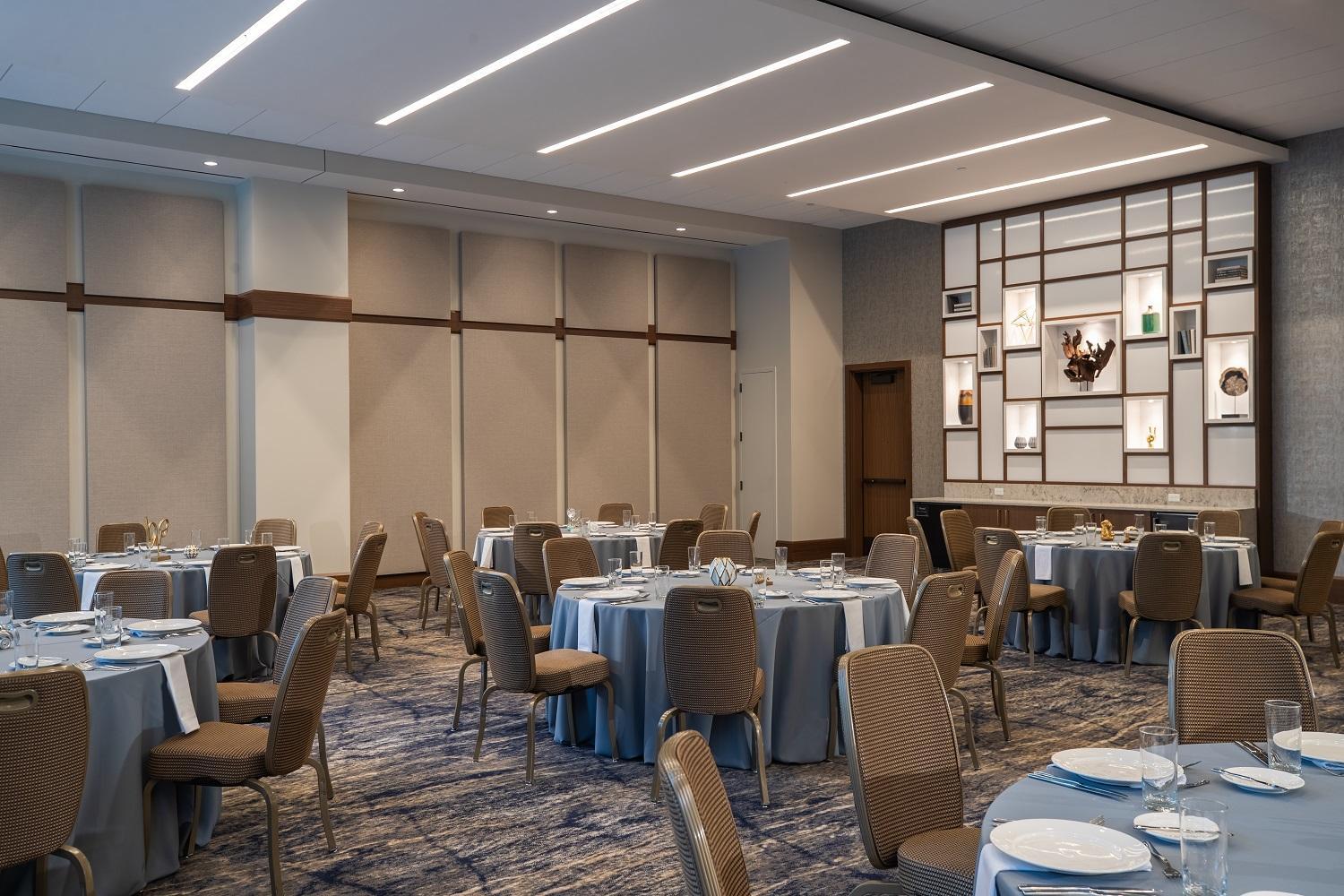 Peninsula Ballroom breaks into 7 spaces with 22 ft. ceilings, has an open ceiling design with recessed lighting and dozens of rigging points to accommodate sets of all types, 5,000 sq. ft. of foyer space with seating spaces, artwork, large windows and natural light, state-of-the-art sound system with concert quality sound, LED lighting and crystal ceiling fixtures with multiple color options, upholstered and sound-secure air wall systems for maximum sound protection, drive-in load in door.